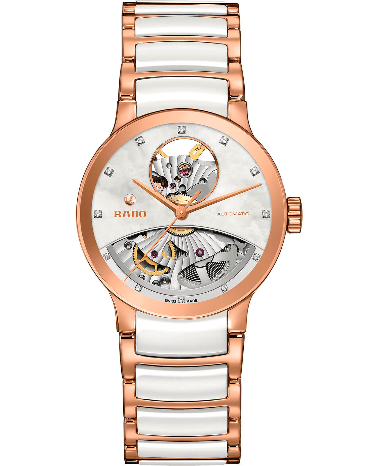 Швейцарские механические часы-скелетоны с автоподзаводом Rado Centrix Automatic Diamonds Open Heart R30248902. Сапфировое стеклоСапфировое стеклоПрочный и надёжный материал из кристалла сапфира синтетического происхождения, характеризующийся особой твёрдостью и устойчивостью к царапинам и повреждениям. устойчивое к мелким механическим повреждениям. Корпус часов изготовлен из нержавеющей стали с PVD-покрытиемPVDУльтратонкое покрытие наносится в технике вакуумного напыления, сочетает в себе нитрид титана особой прочности со слоем золота или оксида хрома. Несёт в себе декоративную или защитную функцию.. Класс водозащиты: 30 метров, позволит защитить корпус от случайных брызг или капель дождя. Браслет из стали PVD-покрытиемPVDУльтратонкое покрытие наносится в технике вакуумного напыления, сочетает в себе нитрид титана особой прочности со слоем золота или оксида хрома. Несёт в себе декоративную или защитную функцию. и высокотехнологичной керамикиВысокотехнологичная керамикаИнновационный запатентованный Rado материал с гладкой или матовой поверхностью. Керамика за счёт кристаллической структуры обладает повышенной устойчивостью от возникновения царапин. Материал способен принимать температуру тела человека, обеспечивая невероятный комфорт при ношении. на раскладной застёжкеРаскладная застёжкаТакой тип застёжки используется только на браслетах из металла. Она никогда не раскрывается полностью, происходит разделение на 2 и более частей. Раскладывающая застёжка снизит вероятность потери часов к минимуму..