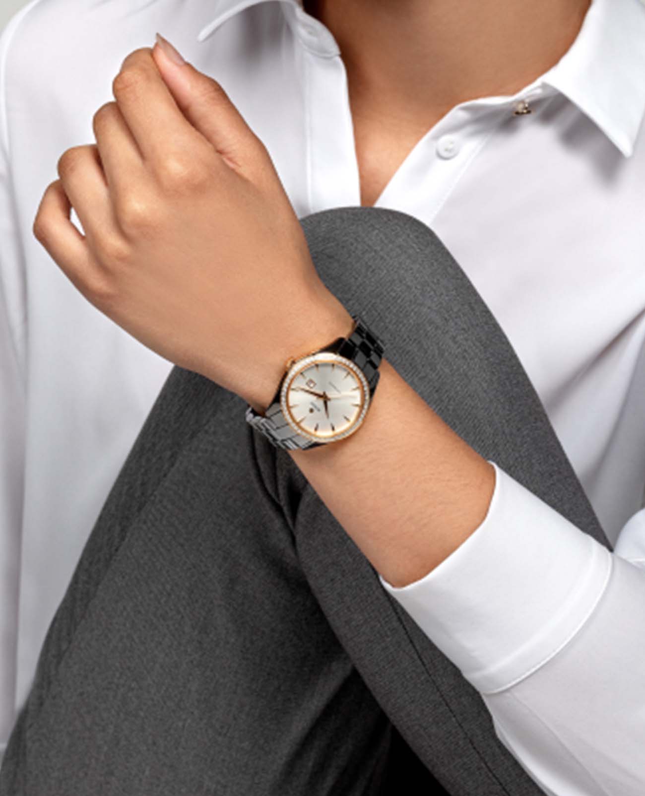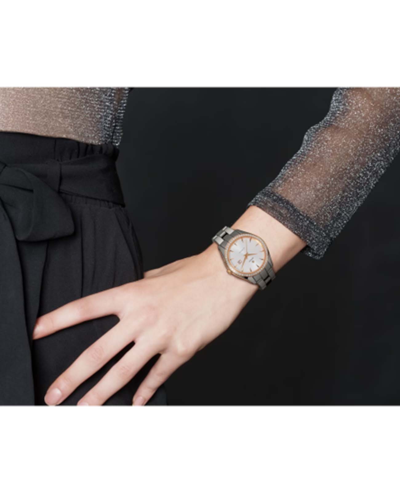 Женские механические швейцарские часы с автоподзаводом Rado Hyperchrome Automatic Diamonds R32052012. Сапфировое стеклоСапфировое стеклоПрочный и надёжный материал из кристалла сапфира синтетического происхождения, характеризующийся особой твёрдостью и устойчивостью к царапинам и повреждениям. устойчивое к мелким механическим повреждениям. Корпус часов изготовлен из титана. БезельБезельВнешний ободок, закрепляющий стекло. В спортивных часах так называется поворотное кольцо с делениями на циферблате, выполняет роль таймера – замеряет отрезки времени на шкале. Неподвижный безель – элемент декора. Однонаправленно вращающийся безель на дайверских часах позволяет фиксировать моменты погружения и выныривания на поверхность. из нержавеющей стали с PVD-покрытиемPVDУльтратонкое покрытие наносится в технике вакуумного напыления, сочетает в себе нитрид титана особой прочности со слоем золота или оксида хрома. Несёт в себе декоративную или защитную функцию. и украшен бриллиантами. Окошко даты находится в положении 3 часа. Класс водозащиты: 50 метров, позволит защитить корпус от случайных брызг или капель дождя. Браслет из стали и высокотехнологичной керамикиВысокотехнологичная керамикаИнновационный запатентованный Rado материал с гладкой или матовой поверхностью. Керамика за счёт кристаллической структуры обладает повышенной устойчивостью от возникновения царапин. Материал способен принимать температуру тела человека, обеспечивая невероятный комфорт при ношении. на раскладной застёжкеРаскладная застёжкаТакой тип застёжки используется только на браслетах из металла. Она никогда не раскрывается полностью, происходит разделение на 2 и более частей. Раскладывающая застёжка снизит вероятность потери часов к минимуму..