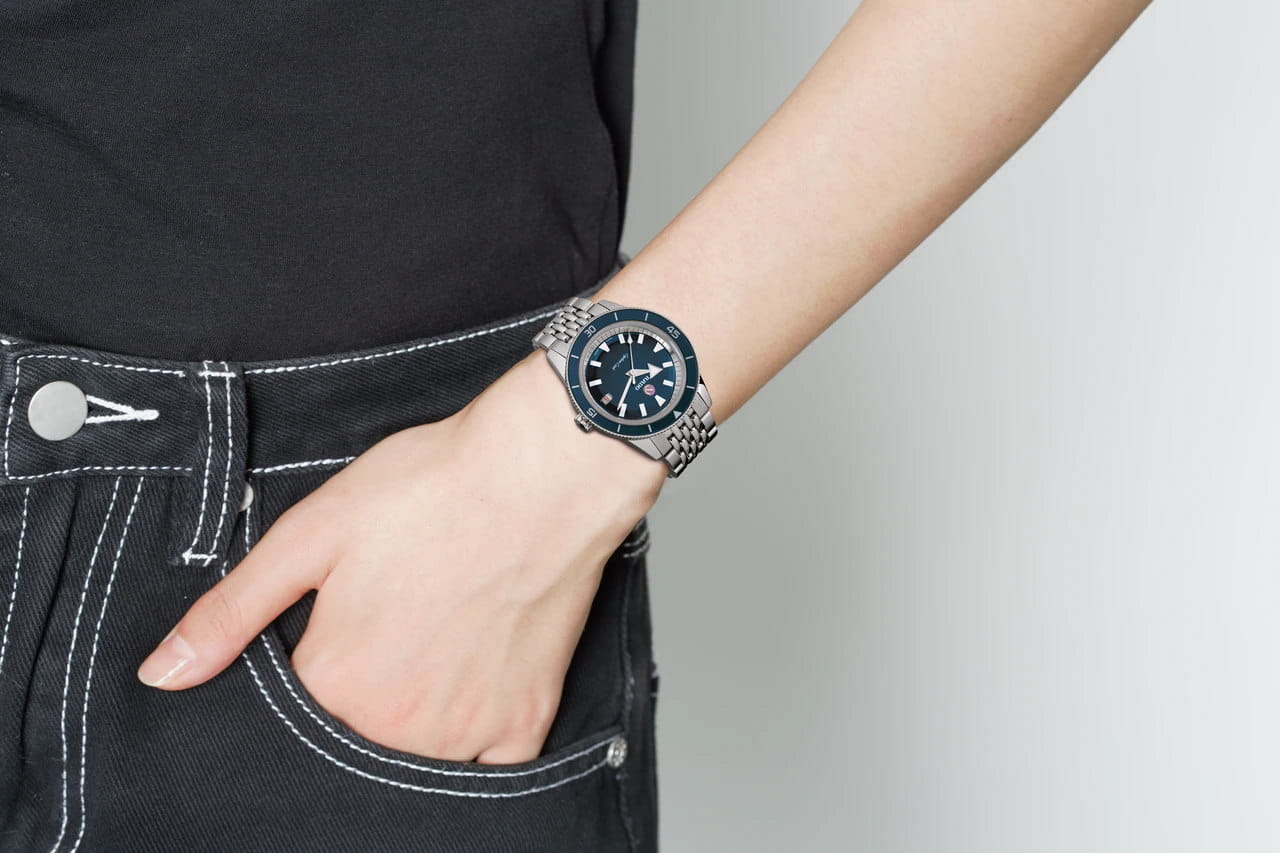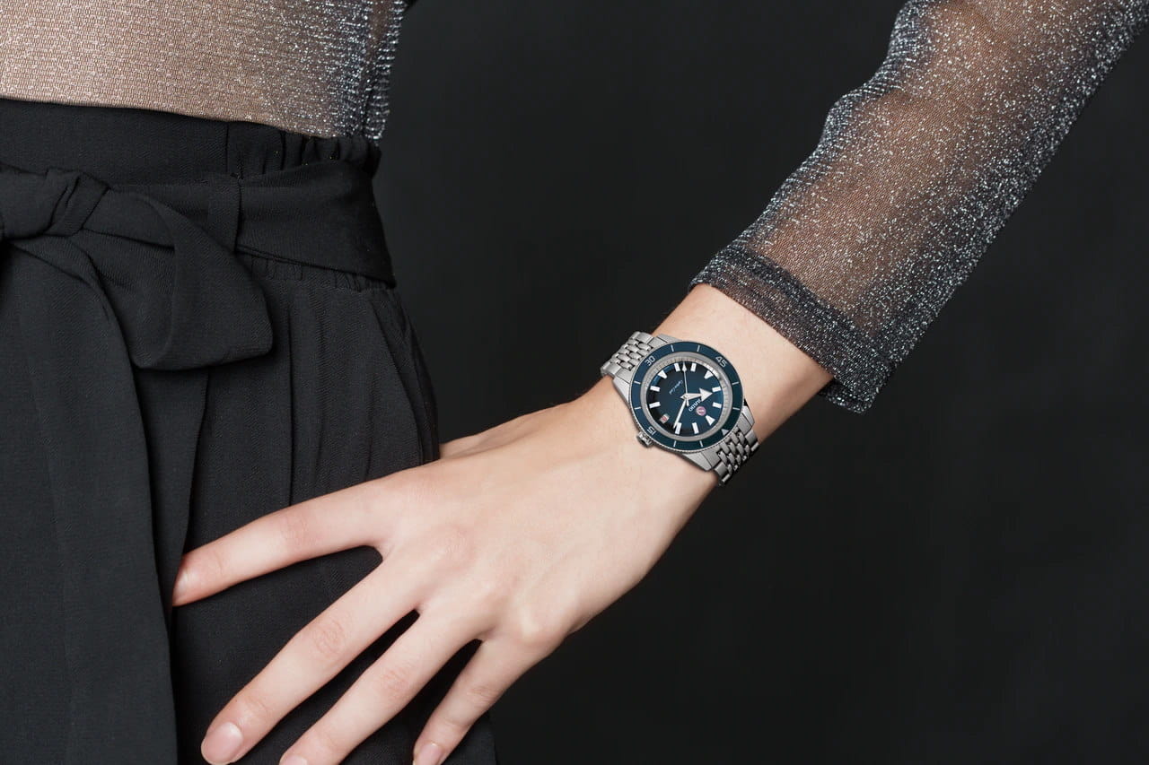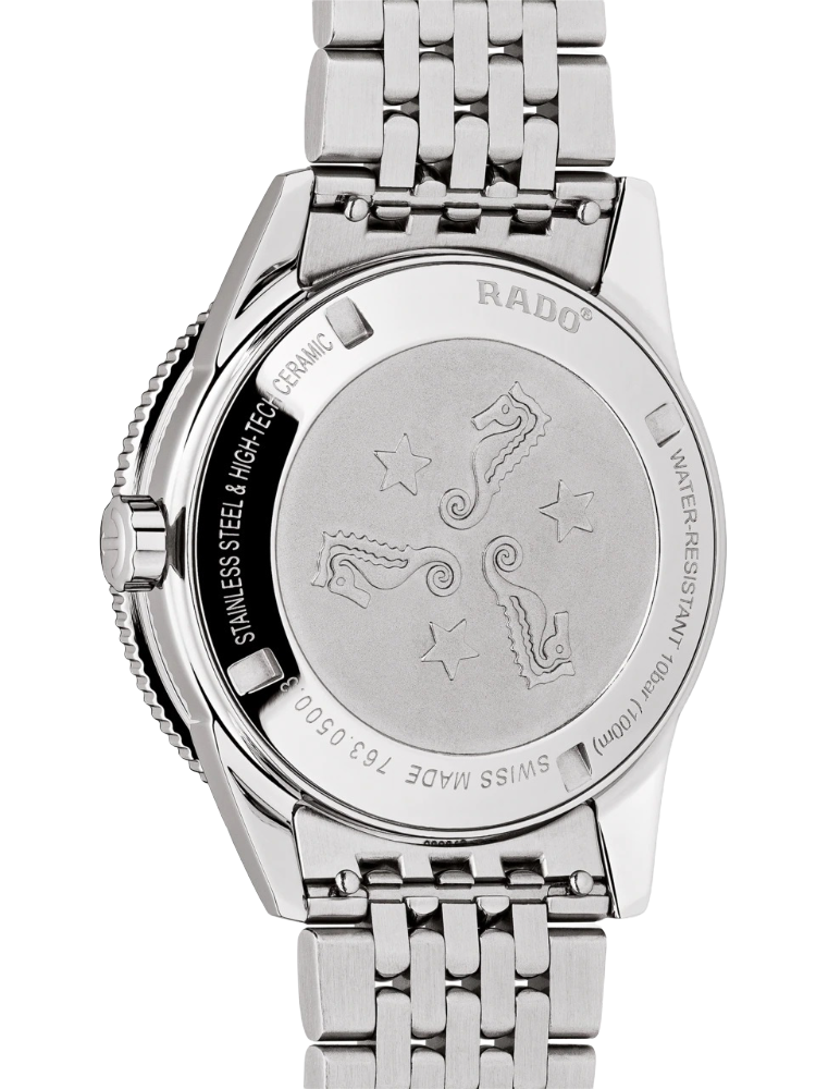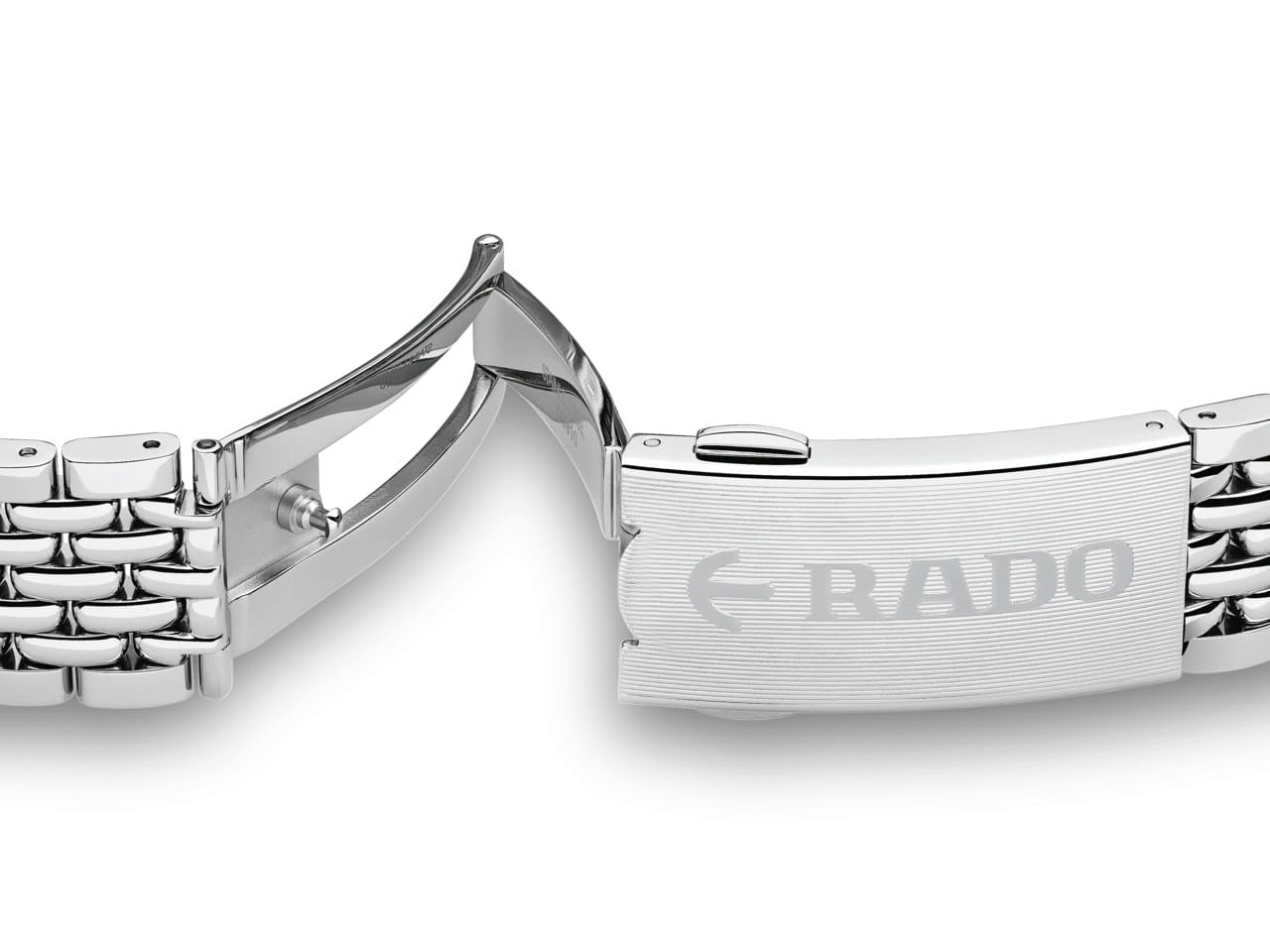 Брендовый аксессуар в серебристом исполнении дополнен винтажными деталями и оригинальными стрелками, выполненными в виде меча и стрелы. Премиальная модель с синим циферблатом идеальна для завершения образа солидного мужчины. Высокая точность хода обеспечивается за счёт швейцарского автоматического калибра ETA C07.611 с 80-часовым запасом хода. Завинчивающаяся задняя крышка. Антибликовое покрытие сапфирового стекла. Корпус и браслет из нержавеющей стали 316L, безельБезельВнешний ободок, закрепляющий стекло. В спортивных часах так называется поворотное кольцо с делениями на циферблате, выполняет роль таймера – замеряет отрезки времени на шкале. Неподвижный безель – элемент декора. Однонаправленно вращающийся безель на дайверских часах позволяет фиксировать моменты погружения и выныривания на поверхность. из высокотехнологичной керамикиВысокотехнологичная керамикаИнновационный запатентованный Rado материал с гладкой или матовой поверхностью. Керамика за счёт кристаллической структуры обладает повышенной устойчивостью от возникновения царапин. Материал способен принимать температуру тела человека, обеспечивая невероятный комфорт при ношении.. Водостойкость 100 метров. Люминесцентная подсветкаЛюминесцентное покрытиеПозволяет считывать показания времени в темноте. Производители наносят на стрелки, часовые индексы, безель или поверхность циферблата светонакопительный состав, дающий холодное свечение.. Отображение числа. Диаметр корпуса: 37 мм.