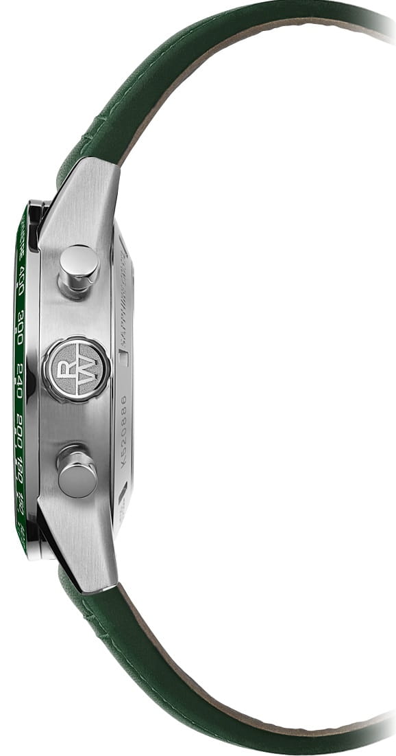 Циферблат с накладными метками в виде штрихов защищен прочным сапфировым стекломСапфировое стеклоПрочный и надёжный материал из кристалла сапфира синтетического происхождения, характеризующийся особой твёрдостью и устойчивостью к царапинам и повреждениям., а метки и стрелки имеют люминесцентное покрытиеЛюминесцентное покрытиеПозволяет считывать показания времени в темноте. Производители наносят на стрелки, часовые индексы, безель или поверхность циферблата светонакопительный состав, дающий холодное свечение., которое светится в темноте после небольшой зарядки на свету. БезельБезельВнешний ободок, закрепляющий стекло. В спортивных часах так называется поворотное кольцо с делениями на циферблате, выполняет роль таймера – замеряет отрезки времени на шкале. Неподвижный безель – элемент декора. Однонаправленно вращающийся безель на дайверских часах позволяет фиксировать моменты погружения и выныривания на поверхность. с керамической вставкой добавляет современный акцент. Завинчивающаяся задняя крышка и заводная головка с логотипом RW подчеркивают высокое качество.