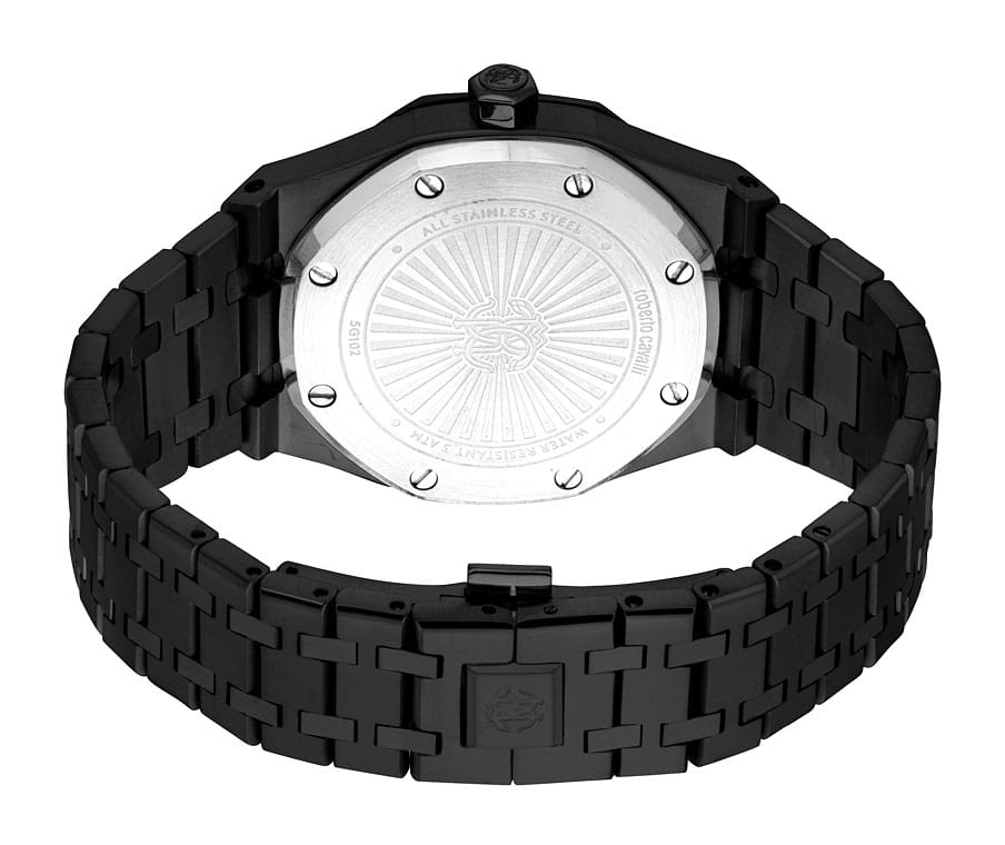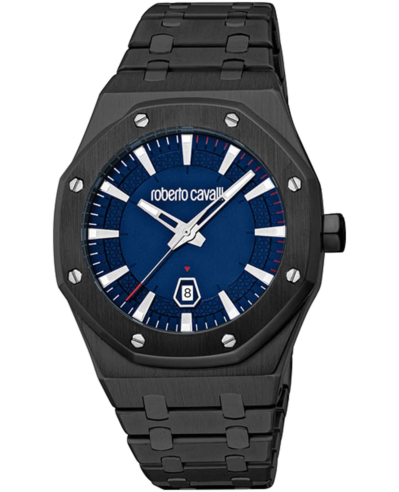 ROBERTO CAVALLI Uomo Ottagono RC5G102M0075 — стильные итальянские часы сочетающие в себе элегантность и современный функционал. Корпус диаметром 42 мм выполнен из нержавеющей стали с PVD-покрытиемPVDУльтратонкое покрытие наносится в технике вакуумного напыления, сочетает в себе нитрид титана особой прочности со слоем золота или оксида хрома. Несёт в себе декоративную или защитную функцию., толщина корпуса составляет 12 мм, что придает модели выразительный внешний вид и надежную защиту от внешних воздействий. Циферблат, искусно оформленный фирменными элементами Roberto Cavalli, притягивает взгляд и подчеркивает ваш безупречный вкус. Часы оснащены кварцевым механизмом, также обладают функцией отображения даты, что делает их удобными для ежедневного использования. Минеральное стеклоМинеральное стеклоМинеральное стекло представляет собой искусственно выращенный минерал кварца. Такое стекло отличается особой устойчивостью к повреждениям и царапинам. Уступает по некоторым качествам сапфировому стеклу. защищает часы от царапин. Водозащита 30 метров позволит защитить корпус от случайных брызг или капель дождя. Стальной браслет на застёжке-бабочке с кнопкамиЗастёжка "бабочка"Такой вид застёжки дополняется предохранителями, помогающими избежать случайного раскрытия браслета. Обладают изящным исполнением. обеспечивает комфортное ношение. Стрелки и метки с люминесцентным покрытиемЛюминесцентное покрытиеПозволяет считывать показания времени в темноте. Производители наносят на стрелки, часовые индексы, безель или поверхность циферблата светонакопительный состав, дающий холодное свечение. обеспечивают отличную читаемость в любое время суток.