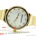 Особую роскошь представляет собой циферблат – белый перламутр по окружности украшен 12 цирконами. Уникальный фигурный безельБезельВнешний ободок, закрепляющий стекло. В спортивных часах так называется поворотное кольцо с делениями на циферблате, выполняет роль таймера – замеряет отрезки времени на шкале. Неподвижный безель – элемент декора. Однонаправленно вращающийся безель на дайверских часах позволяет фиксировать моменты погружения и выныривания на поверхность. превращает наручные часы в настоящий эксклюзив, стильный аксессуар будет великолепным вариантом на подарок. Внутри стального корпуса находится кварцевый механизм, обеспечивающий высокую точность хода. Золотистое PVD-покрытиеPVDУльтратонкое покрытие наносится в технике вакуумного напыления, сочетает в себе нитрид титана особой прочности со слоем золота или оксида хрома. Несёт в себе декоративную или защитную функцию.. Минеральное стекло противостоит появлению царапин. Браслет Mesh из хирургической стали 316L. Водонепроницаемость при давлении 3 бар. Диаметр корпуса: 32 мм.