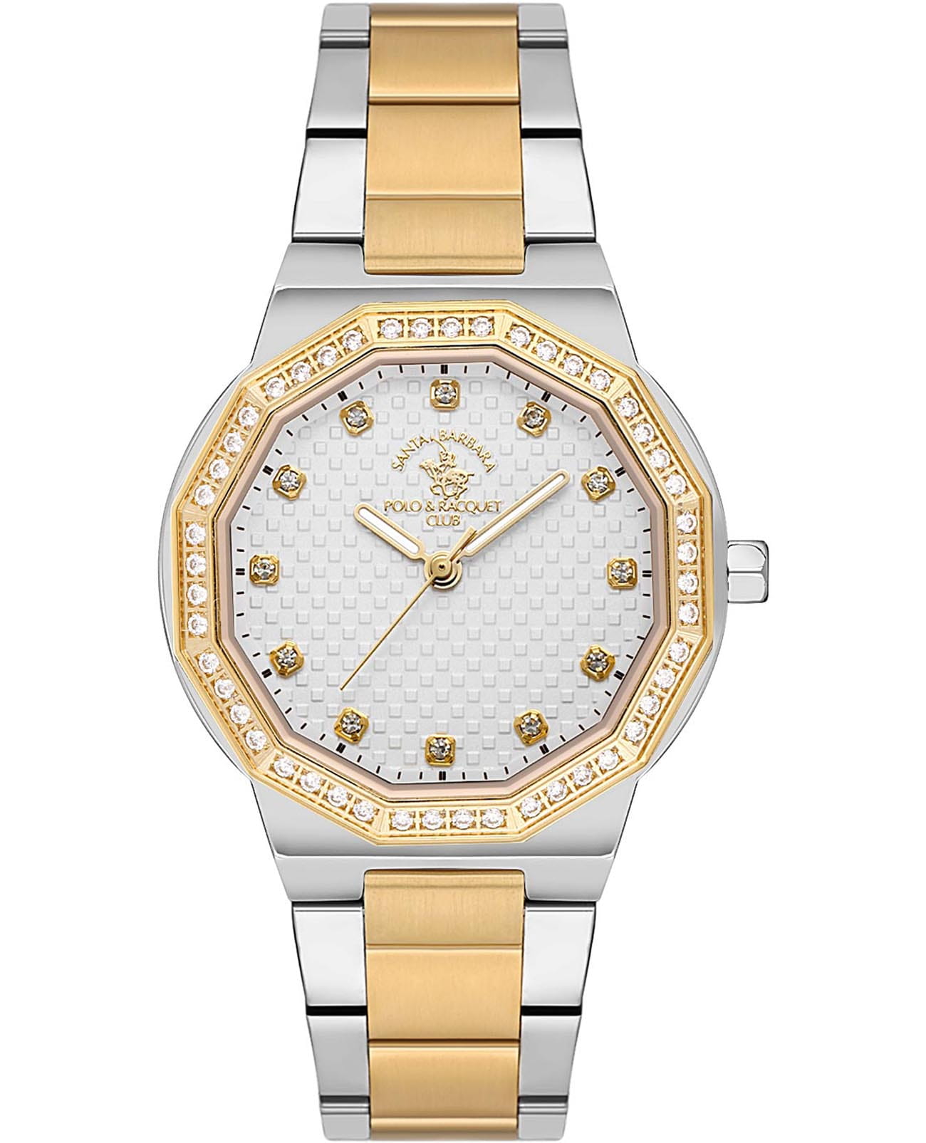 Женские кварцевые часы Santa Barbara Polo & Racquet Club Unique SB.1.10552-3 — это стильный аксессуар, подчеркивающий индивидуальность. Изысканный корпус диаметром 35 мм выполнен из нержавеющей стали 316L с 12-гранным безелемБезельВнешний ободок, закрепляющий стекло. В спортивных часах так называется поворотное кольцо с делениями на циферблате, выполняет роль таймера – замеряет отрезки времени на шкале. Неподвижный безель – элемент декора. Однонаправленно вращающийся безель на дайверских часах позволяет фиксировать моменты погружения и выныривания на поверхность. с IP-покрытиемIP-покрытиеМетод ионного напыления. Демонстрирует повышенную устойчивость к истиранию, окислению и химическим веществам. Под воздействием высокого давления и температуры около 1500°C молекулы металла надёжно соединяются с частицами корпуса часов., украшенным кристаллами. Изящный циферблат дополнен накладными метками в виде точек, украшенных кристаллами, а также фирменным логотипом. Стрелки скругленные с люминесцентным покрытиемЛюминесцентное покрытиеПозволяет считывать показания времени в темноте. Производители наносят на стрелки, часовые индексы, безель или поверхность циферблата светонакопительный состав, дающий холодное свечение., обеспечивающим хорошую читаемость в темноте. Циферблат защищён минеральным стекломМинеральное стеклоМинеральное стекло представляет собой искусственно выращенный минерал кварца. Такое стекло отличается особой устойчивостью к повреждениям и царапинам. Уступает по некоторым качествам сапфировому стеклу.. Часы оснащены надежным стальным браслетом с раскладной застёжкойРаскладная застёжкаТакой тип застёжки используется только на браслетах из металла. Она никогда не раскрывается полностью, происходит разделение на 2 и более частей. Раскладывающая застёжка снизит вероятность потери часов к минимуму. с частичным IP-покрытиемIP-покрытиеМетод ионного напыления. Демонстрирует повышенную устойчивость к истиранию, окислению и химическим веществам. Под воздействием высокого давления и температуры около 1500°C молекулы металла надёжно соединяются с частицами корпуса часов.. Водонепроницаемость 50 м позволяет использовать часы в повседневных условиях. Идеальный выбор для тех, кто ценит элегантный дизайн и качество.