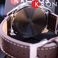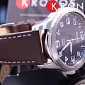 Ремешок выполнен из натуральной кожи коричневого цвета, обеспечивая комфорт при носке.  Модель обладает водонепроницаемостью до 100 метров, что делает её подходящей для плавания и сноркелинга.