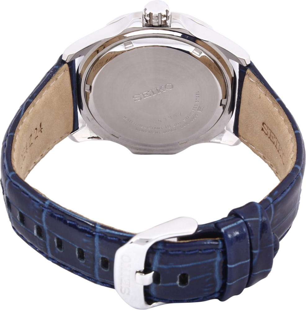 Seiko 6N76. Круглой формы корпус часов выполнен из высокопрочной стали с PVD покрытием золотого цвета. Синий фон циферблата и контрастные элементы дизайна. Часы снабжены минеральным стеклом, устойчивым к царапинам. Водонепроницаемость 10 ATM. Часы прочно удерживаются на руке ремешком из натуральной кожи.
