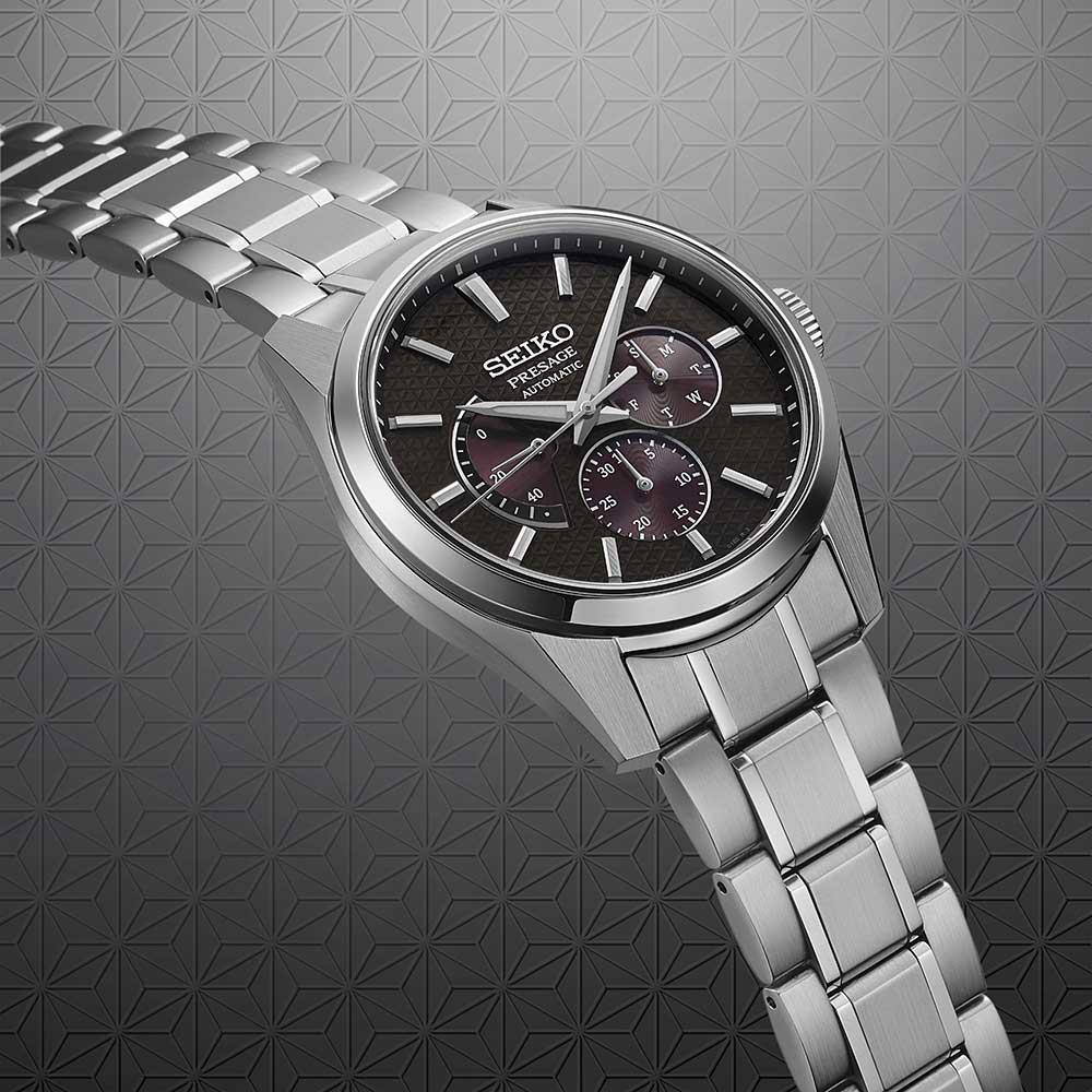 Механические часы Seiko Presage Sharp Edged SPB307 — это сочетание японского искусства и современных технологий. Их дизайн вдохновлён древним узором «Асаноха», известным ещё с эпохи Хэйан и отражающим философию гармонии и природной целостности. Часы оснащены калибром 6R21 — надёжным механизмом с автоподзаводом и возможностью ручной подзаводки. Механизм работает на частоте 28 800 полуколебаний в час, имеет 29 драгоценных камней и обеспечивает запас хода до 45 часов с на циферблате. Также реализована функция стоп-секунды для точной установки времени. Циферблат оформлен штриховыми метками, а информация о числе и дне недели вынесена на отдельные малые циферблаты, что делает функционал часов удобным и визуально сбалансированным. Стрелки и метки дополнены люминесцентным покрытиемЛюминесцентное покрытиеПозволяет считывать показания времени в темноте. Производители наносят на стрелки, часовые индексы, безель или поверхность циферблата светонакопительный состав, дающий холодное свечение. LumiBrite, обеспечивающим отличную читаемость даже в условиях слабого освещения. Защиту циферблата обеспечивает сапфировое стеклоСапфировое стеклоПрочный и надёжный материал из кристалла сапфира синтетического происхождения, характеризующийся особой твёрдостью и устойчивостью к царапинам и повреждениям. с антибликовым покрытием на внутренней поверхности, что делает его не только прочным, но и удобным для считывания информации при любом освещении. Корпус изготовлен из нержавеющей стали, а задняя крышка — завинчивающаяся и прозрачная, что позволяет рассмотреть детали работы механизма. Браслет выполнен из стали и оснащён трёхсгибной раскладной застёжкойРаскладная застёжкаТакой тип застёжки используется только на браслетах из металла. Она никогда не раскрывается полностью, происходит разделение на 2 и более частей. Раскладывающая застёжка снизит вероятность потери часов к минимуму. с кнопочным механизмом, обеспечивающей надёжную фиксацию и комфорт при ношении. Часы обладают водонепроницаемостью WR 100, что позволяет использовать их при плавании или занятиях водными видами спорта без глубокого погружения. Эти часы станут идеальным аксессуаром для тех, кто ценит традиции, эстетику и современные технологии — универсальный спутник, подчёркивающий статус и индивидуальность своего владельца.