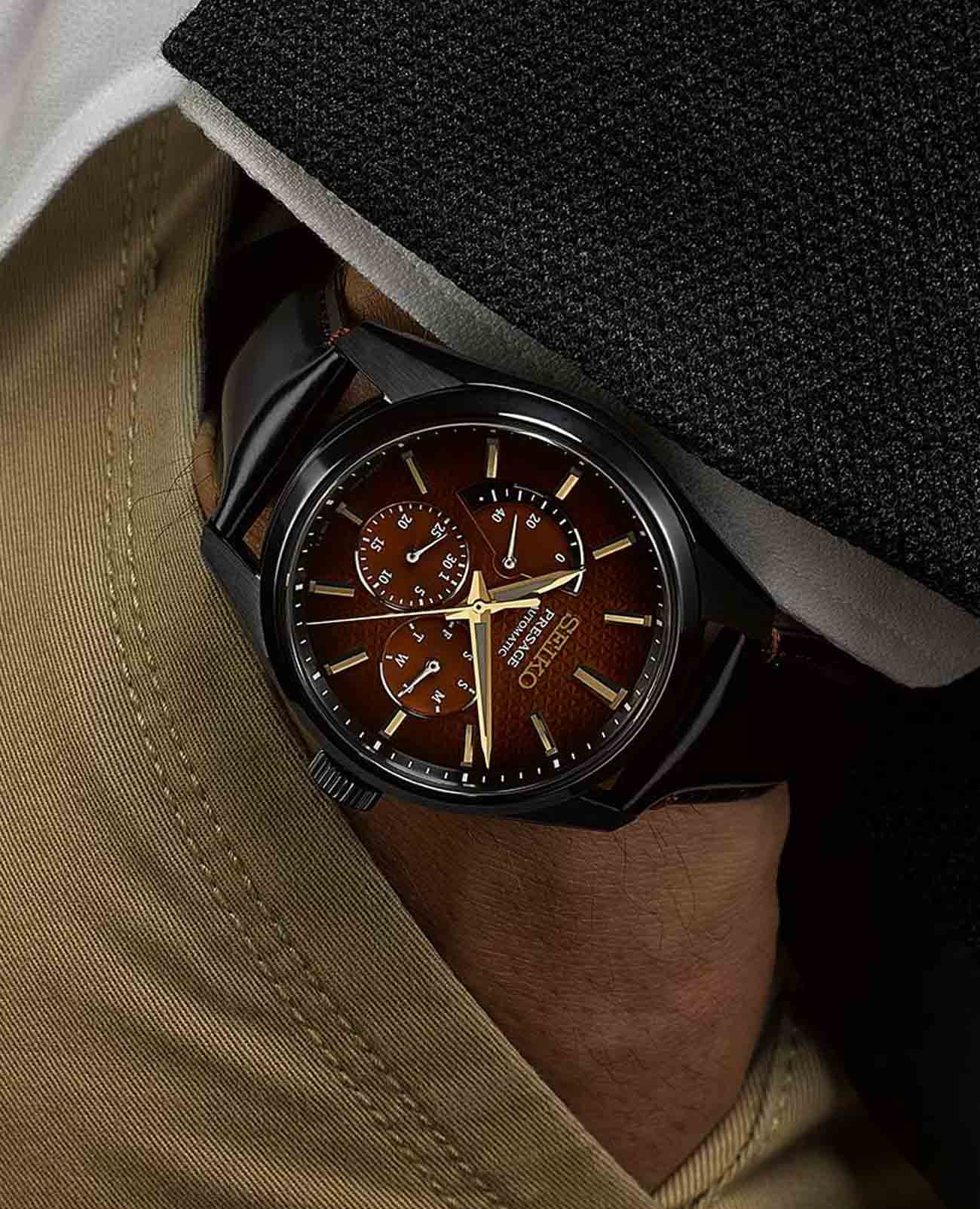 Seiko Presage SPB329J1 – лимитированные мужские японские механические часы, выпущенные тиражом всего 2000 экземпляров. Эти часы отличаются уникальным дизайном циферблата, вдохновленным древним японским узором «Асаноха», который использовался мастерами еще в период Хэйан (794–1185 гг.), более 10 000 лет назад. Такой дизайн подчеркивает глубокую связь с культурным наследием Японии и придает часам особую ценность. Часы защищены сапфировым стекломСапфировое стеклоПрочный и надёжный материал из кристалла сапфира синтетического происхождения, характеризующийся особой твёрдостью и устойчивостью к царапинам и повреждениям., известным своей прочностью и устойчивостью к царапинам, что обеспечивает долгий срок службы без потери внешнего вида. Корпус часов выполнен из нержавеющей стали, что придает изделию необходимую прочность и долговечность. Механизм часов включает 29 камней, что способствует плавному движению стрелок и увеличению срока службы изделия. Частота колебаний составляет 28 800 полуколебаний в час, а ретроградный указатель запаса хода показывает остаток энергии на 45 часов. Предусмотрена функция stop-second для точной настройки времени, а также возможность ручного завода, что добавляет удобства в эксплуатации. Стрелки покрыты люминесцентным составомЛюминесцентное покрытиеПозволяет считывать показания времени в темноте. Производители наносят на стрелки, часовые индексы, безель или поверхность циферблата светонакопительный состав, дающий холодное свечение., облегчающим считывание времени в условиях слабого освещения. Класс водонепроницаемости 100 метров позволяет использовать часы для плавания, ныряния и других водных активностей, сохраняя их работоспособность даже на значительных глубинах. Кожаный ремешок фиксируется с помощью раскладной застёжкиРаскладная застёжкаТакой тип застёжки используется только на браслетах из металла. Она никогда не раскрывается полностью, происходит разделение на 2 и более частей. Раскладывающая застёжка снизит вероятность потери часов к минимуму., что обеспечивает удобную и надежную посадку на запястье. Seiko Presage SPB329J1 – это не просто часы, а настоящее произведение искусства, сочетающее в себе традиционные японские мотивы, современные технологии и высочайшее качество исполнения.