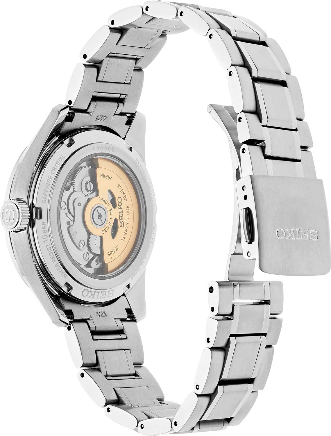 Элегантные механические часы Presage Sharp Edged продолжают серию, вдохновлённую богатым культурным наследием Японии. Их дизайн циферблата берёт мотивы из древнего узора «Асаноха», известного ещё с эпохи Хэйан и часто встречающегося в традиционных ремёслах. Эта коллекция сочетает в себе японское мастерство и современные технологии. Часы оснащены механическим калибром 6R5J с автоподзаводом и возможностью ручной подзаводки. Механизм работает на частоте 21 600 полуколебаний в час, имеет 24 драгоценных камня и обеспечивает внушительный запас хода — до 72 часов. Также реализована функция стоп-секунды для точной установки времени, а также защита от магнитных полей до 4800 А/м. Циферблат оформлен с использованием строгих штриховых меток, а через прозрачное окошко можно наблюдать за работой механизма. Часы поддерживают отображение времени в 12- и 24-часовом формате. Защиту циферблата обеспечивает сапфировое стеклоСапфировое стеклоПрочный и надёжный материал из кристалла сапфира синтетического происхождения, характеризующийся особой твёрдостью и устойчивостью к царапинам и повреждениям. выпуклой формы с антибликовым покрытием с обеих сторон, что делает его не только прочным, но и удобным для считывания информации при любом освещении. Задняя крышка выполнена завинчивающейся и прозрачной, что подчёркивает связь между внешним дизайном и внутренней технологией. Браслет изготовлен из нержавеющей стали и оснащён раскладной застёжкойРаскладная застёжкаТакой тип застёжки используется только на браслетах из металла. Она никогда не раскрывается полностью, происходит разделение на 2 и более частей. Раскладывающая застёжка снизит вероятность потери часов к минимуму., обеспечивающей надёжную фиксацию и комфорт при ношении. Часы обладают водонепроницаемостью до 100 метров, что позволяет использовать их не только в повседневной жизни, но и при плавании или занятиях водными видами спорта. Стрелки и метки дополнены люминесцентным покрытиемЛюминесцентное покрытиеПозволяет считывать показания времени в темноте. Производители наносят на стрелки, часовые индексы, безель или поверхность циферблата светонакопительный состав, дающий холодное свечение. LumiBrite, обеспечивающим отличную читаемость в условиях слабого освещения. Эти часы станут достойным аксессуаром для тех, кто ценит глубину дизайна, точность механизма и историю, воплощённую в каждом элементе.