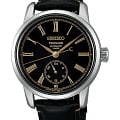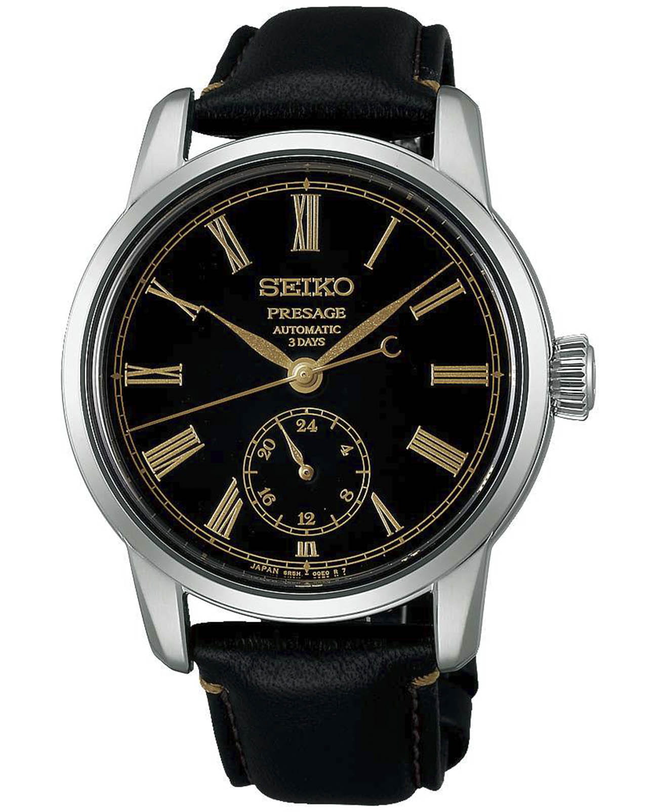Мужские механические часы с автоподзаводом Seiko — это роскошный аксессуар, сочетающий высокое японское мастерство и традиционное искусство. Корпус диаметром 40 мм и толщиной 12 мм выполнен из нержавеющей стали с повышенной твёрдостью (super hard coating). Циферблат чёрного цвета выполнен вручную с использованием техники урюши — натурального лака, что придаёт каждому экземпляру уникальность. Поверхность циферблата оформлена римскими цифрами. Циферблат защищён двояковыпуклым сапфировым стекломСапфировое стеклоПрочный и надёжный материал из кристалла сапфира синтетического происхождения, характеризующийся особой твёрдостью и устойчивостью к царапинам и повреждениям. с антибликовым покрытиемАнтибликовое покрытиеСлой оксида металла в 0,13-0,3 микрон, благодаря которому стекло часов не бликует и не отражает свет. Антибликовое покрытие уменьшает отражение света в 10 раз, обеспечивая отличную читаемость показателей циферблата. на внутренней поверхности. Механизм — автоматический с запасом хода до 72 часов, возможностью ручного завода, функцией и индикацией 24-часового формата времени. Часы обладают защитой от магнитных полей до 4800 А/мУдаропрочный корпусМеханизм заключён в корпус, выполненный из современных материалов, устойчивых к ударам, механическим повреждениям и падению с высоты: инновационный пластик, карбон, нержавеющая сталь, титан.. Завинчивающаяся задняя крышка прозрачная, позволяет наблюдать за работой механизма. Часы оснащены кожаным ремешком чёрного цвета с тройной раскладной застёжкойРаскладная застёжкаТакой тип застёжки используется только на браслетах из металла. Она никогда не раскрывается полностью, происходит разделение на 2 и более частей. Раскладывающая застёжка снизит вероятность потери часов к минимуму. с кнопочным открытием. Водонепроницаемость 100 м позволяет использовать часы для плавания и повседневного ношения. Идеальный выбор для ценителей исключительного дизайна и ручной работы.