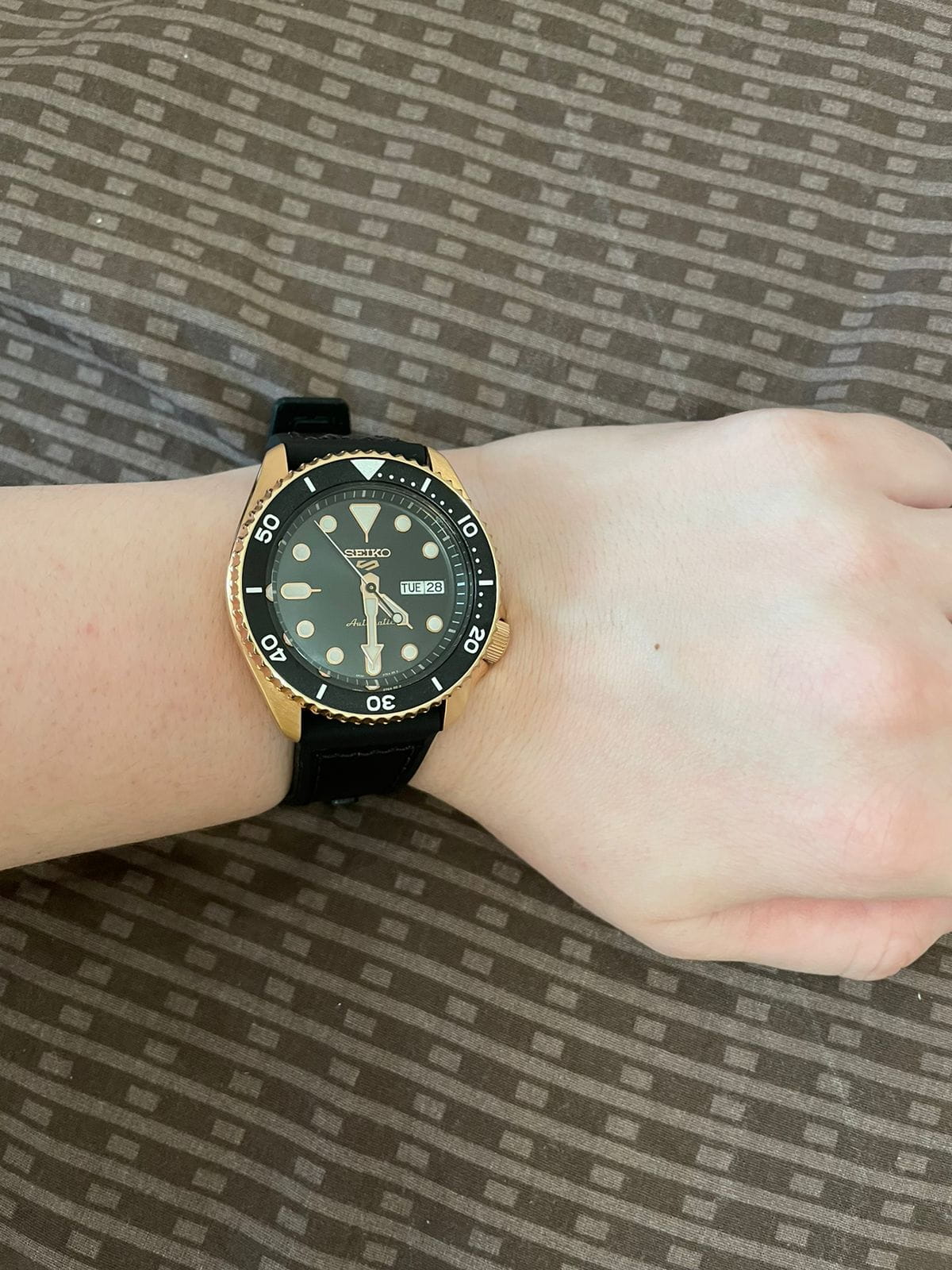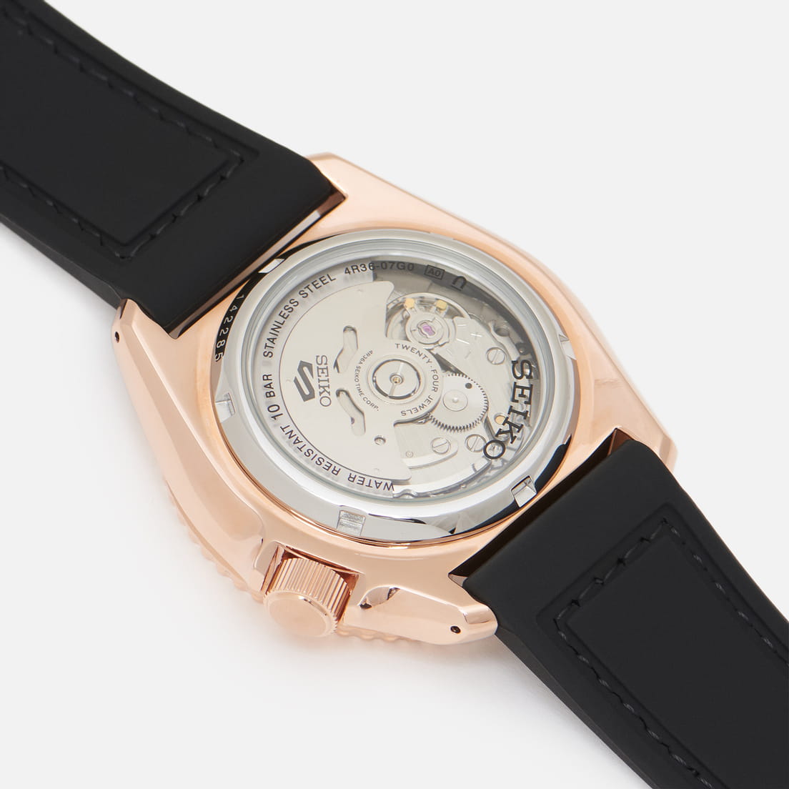 Часы Seiko 5 Sports SRPD76K1 сочетают в себе элегантный дизайн и надёжность, характерные для японского часового мастерства. Корпус диаметром 42,5 мм выполнен из нержавеющей стали с PVD-покрытиемPVDУльтратонкое покрытие наносится в технике вакуумного напыления, сочетает в себе нитрид титана особой прочности со слоем золота или оксида хрома. Несёт в себе декоративную или защитную функцию. розового золота, придающим часам утончённый вид. Чёрный циферблат защищён минеральным стекломМинеральное стеклоМинеральное стекло представляет собой искусственно выращенный минерал кварца. Такое стекло отличается особой устойчивостью к повреждениям и царапинам. Уступает по некоторым качествам сапфировому стеклу. с повышенной прочностью.