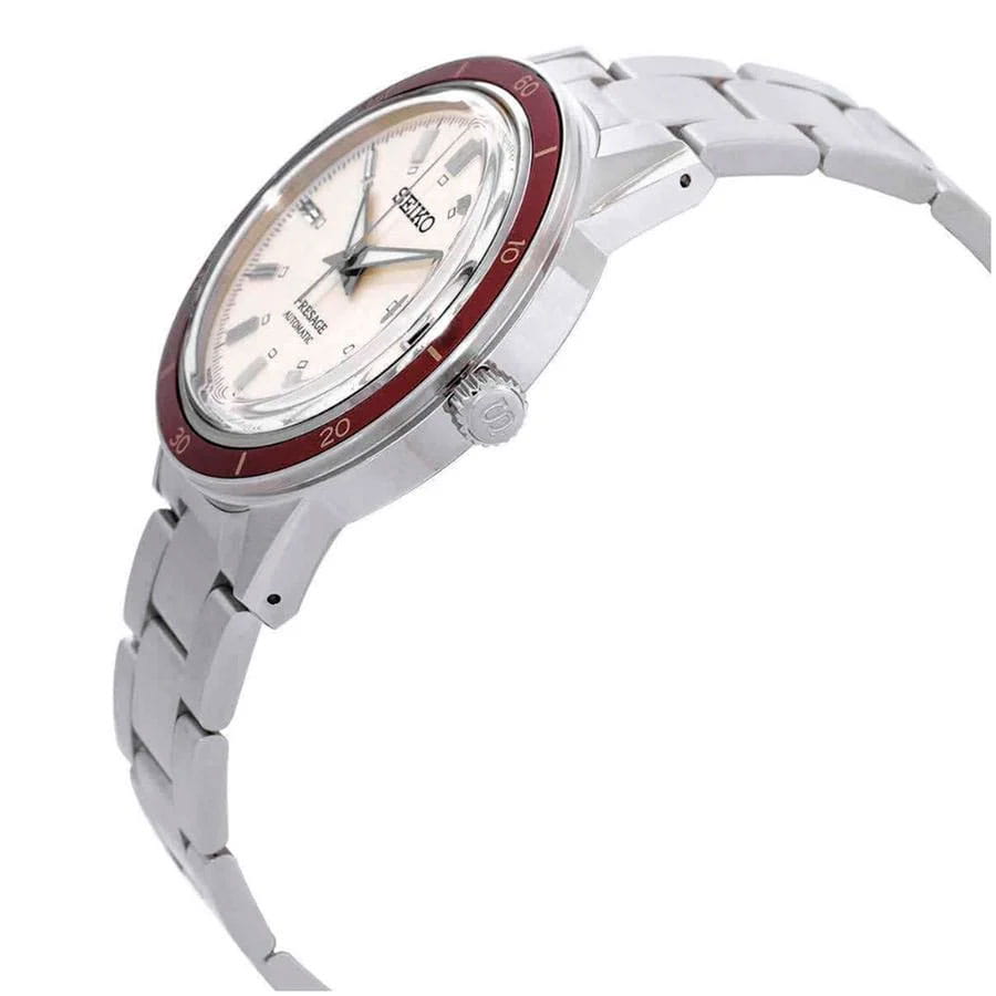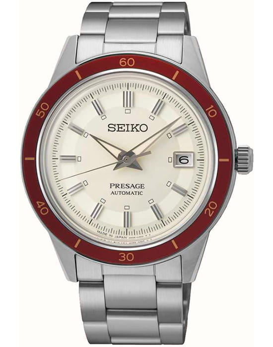 Мужские наручные часы Seiko SRPH93J1 из коллекции Presage Style 60s сочетают в себе классический дизайн и надежность современных технологий. Модель обладает круглым корпусом диаметром 40,8 мм, изготовленным из нержавеющей стали, что обеспечивает высокую устойчивость к внешним воздействиям . Толщина корпуса составляет 12 мм, а для защиты используется минеральное стеклоМинеральное стеклоМинеральное стекло представляет собой искусственно выращенный минерал кварца. Такое стекло отличается особой устойчивостью к повреждениям и царапинам. Уступает по некоторым качествам сапфировому стеклу. Hardlex Crystal, обеспечивающее прочную защиту от царапин .  БезельБезельВнешний ободок, закрепляющий стекло. В спортивных часах так называется поворотное кольцо с делениями на циферблате, выполняет роль таймера – замеряет отрезки времени на шкале. Неподвижный безель – элемент декора. Однонаправленно вращающийся безель на дайверских часах позволяет фиксировать моменты погружения и выныривания на поверхность. с PVD-покрытиемPVDУльтратонкое покрытие наносится в технике вакуумного напыления, сочетает в себе нитрид титана особой прочности со слоем золота или оксида хрома. Несёт в себе декоративную или защитную функцию.. Браслет также выполнен из нержавеющей стали с раскладной застежкойРаскладная застёжкаТакой тип застёжки используется только на браслетах из металла. Она никогда не раскрывается полностью, происходит разделение на 2 и более частей. Раскладывающая застёжка снизит вероятность потери часов к минимуму., гарантирующей комфортное ношение . Циферблат бежевого цвета украшен текстурой, которая подчеркивает элегантный стиль модели. Часы оснащены функцией отображения даты на позиции «3 часа» . Модель работает на автоматическом механизме с калибром 4R35, который включает 23 камня и обладает запасом хода до 41 часа . Водонепроницаемость составляет WR 50, что позволяет защитить корпус от случайных брызг и кратковременного контакта с водой . Вдохновленные культурой 1960-х годов, эти часы демонстрируют уникальный стиль и внимание к деталям, сохраняя при этом практичность для повседневного использования.