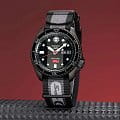Водозащита 100 метров (10 бар) позволяет использовать часы для плавания и других водных видов спорта. Чёрный нейлоновый ремешок с логотипами Super Cub и Honda и раскладной застёжкойРаскладная застёжкаТакой тип застёжки используется только на браслетах из металла. Она никогда не раскрывается полностью, происходит разделение на 2 и более частей. Раскладывающая застёжка снизит вероятность потери часов к минимуму. обеспечивает комфортное ношение и надёжную фиксацию на запястье.
