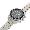 Аксессуар привлекает сдержанным серебристо-чёрным исполнением в дайверской тематике. Этому способствуют однонаправленно вращающийся безель, заводная головка с защитой, завинчивающаяся задняя крышка, крупная индикация времени. Кварцевый хронографХронографФункция позволяет измерять отрезки времени с особой точностью: часы, минуты, секунды. Верным признаком хронографа является наличие на циферблате 3 дополнительных окошек-счётчиков. получает питание от источников света, реализуется технология . Полностью заряженной батарейки хватит на 6 месяцев работы. Японский механизм Seiko V192 отличается высокой точностью хода. Стрелки и метки дополнены люминесцентной подсветкой LumiBriteЛюминесцентное покрытиеПозволяет считывать показания времени в темноте. Производители наносят на стрелки, часовые индексы, безель или поверхность циферблата светонакопительный состав, дающий холодное свечение..Сапфировое стекло не допускает образования царапин. Часы оснащены секундомером, календарём, индикатором EOLEOLПредставляет собой систему, уведомляющую владельца часов о необходимости замены элемента питания. За 2 недели до полного разряда батарейки секундная стрелка перестаёт ходить чётко и начинает перепрыгивать на 3-4 деления.. Диаметр корпуса: 44,5 мм.