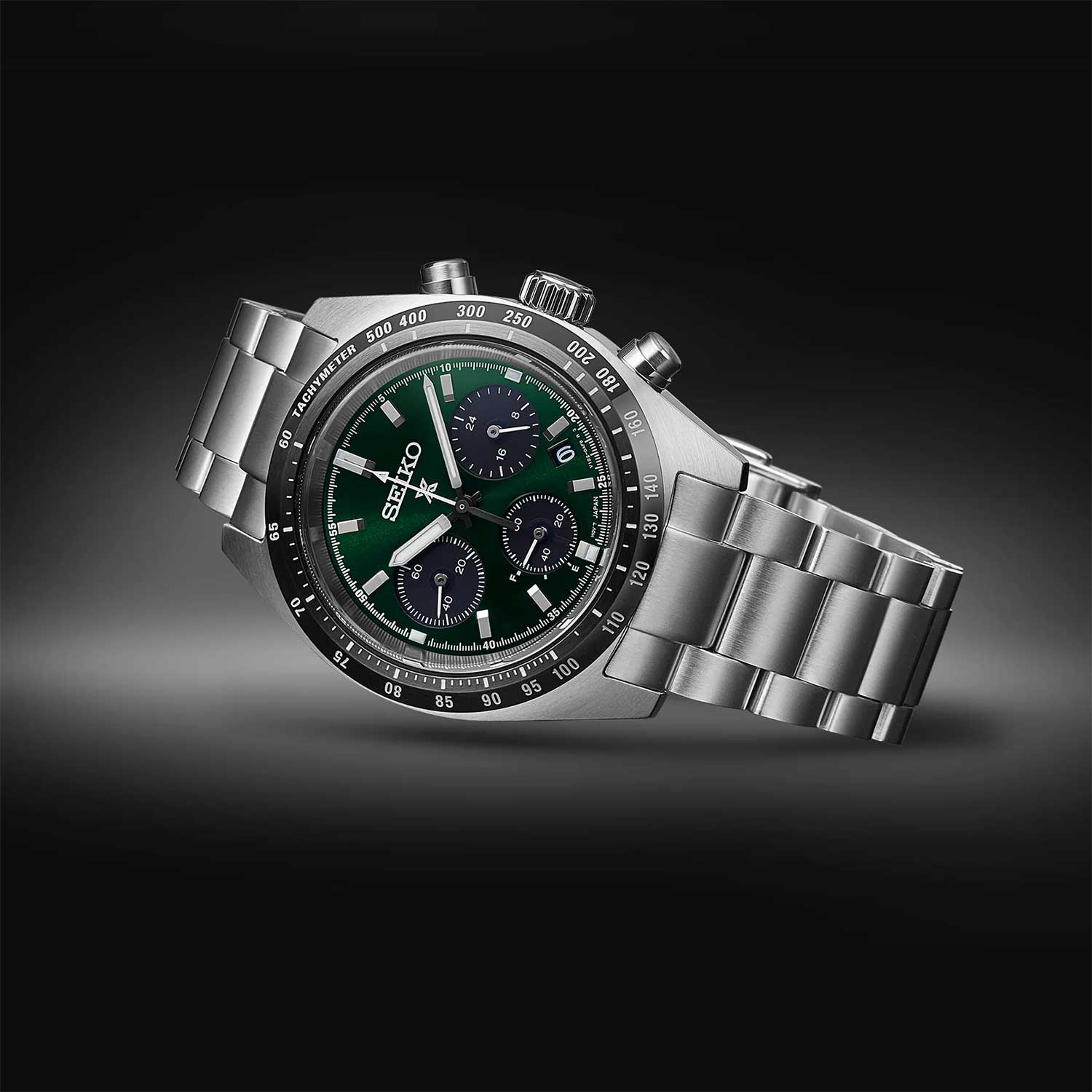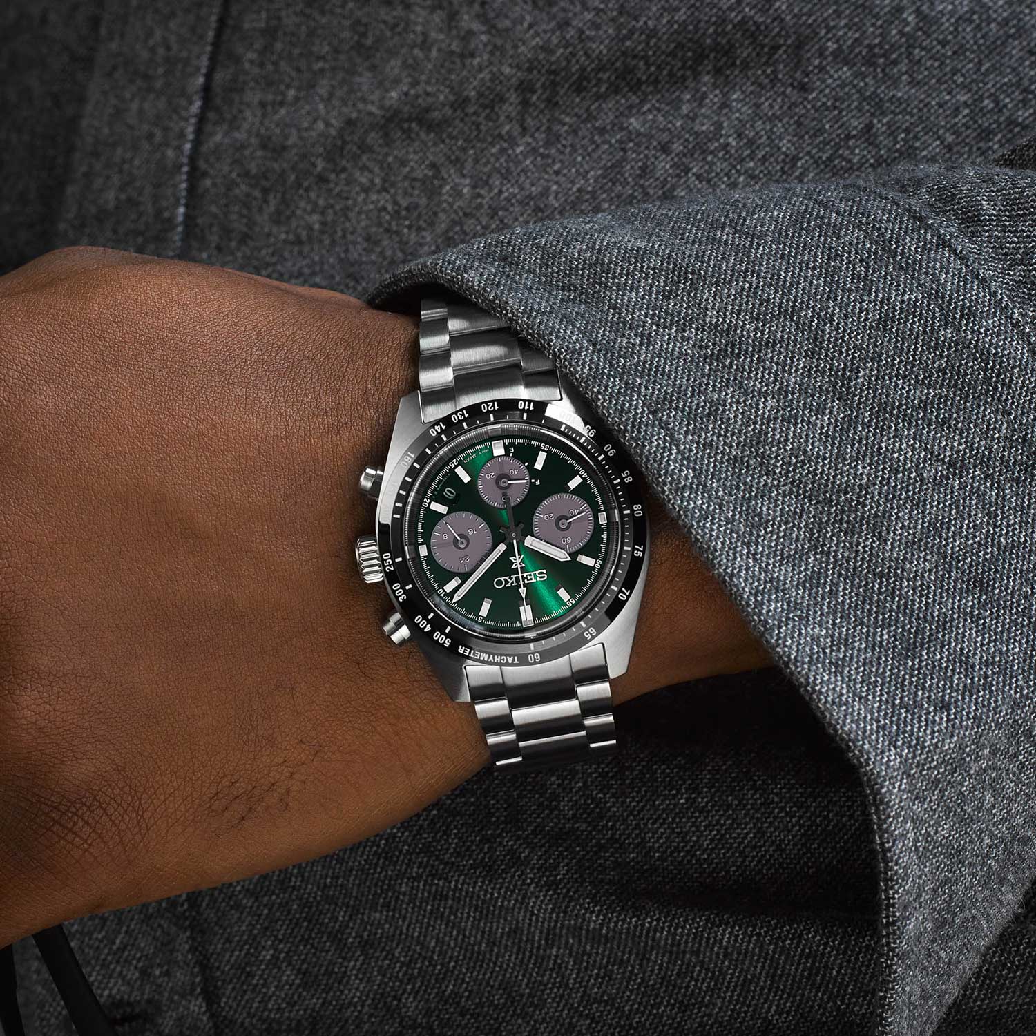 Модель Seiko SSC933P1 из коллекции Prospex Speedtimer — это солнечный хронограф в популярном "панда-дизайне", сочетающий винтажную эстетику и современные технологии. Корпус диаметром 39 мм выполнен из нержавеющей стали, обеспечивая компактность и удобную посадку на запястье. Чёрный фиксированный тахиметрический безельТахиметрРазмеченная шкала, располагается на ободке или безеле часов. Тахиметр позволяет рассчитать скорость на определённом участке пути, расстояние измеряется в километрах или милях. позволяет проводить измерения скорости по времени. Зеленый циферблат с пескоструйной текстурой дополнен счётчиками хронографа. Стрелки и метки покрыты люминесцентным покрытиемЛюминесцентное покрытиеПозволяет считывать показания времени в темноте. Производители наносят на стрелки, часовые индексы, безель или поверхность циферблата светонакопительный состав, дающий холодное свечение., обеспечивая высокую читаемость даже в тёмное время суток. Часы оснащены солнечным кварцевым механизмом Seiko V192, который заряжается от любого источника света и обеспечивает до 6 месяцев автономной работы. В функционал входят хронографХронографФункция позволяет измерять отрезки времени с особой точностью: часы, минуты, секунды. Верным признаком хронографа является наличие на циферблате 3 дополнительных окошек-счётчиков. на 60 минут, индикация 24 часов, даты и индикатор запаса хода. Циферблат защищён выпуклым сапфировым стекломСапфировое стеклоПрочный и надёжный материал из кристалла сапфира синтетического происхождения, характеризующийся особой твёрдостью и устойчивостью к царапинам и повреждениям. с антибликовым покрытиемАнтибликовое покрытиеСлой оксида металла в 0,13-0,3 микрон, благодаря которому стекло часов не бликует и не отражает свет. Антибликовое покрытие уменьшает отражение света в 10 раз, обеспечивая отличную читаемость показателей циферблата., что гарантирует отличную видимость и устойчивость к царапинам. Браслет выполнен из нержавеющей стали и дополнен надёжной раскладной застёжкойРаскладная застёжкаТакой тип застёжки используется только на браслетах из металла. Она никогда не раскрывается полностью, происходит разделение на 2 и более частей. Раскладывающая застёжка снизит вероятность потери часов к минимуму. с кнопками. Seiko — это универсальные спортивные часы с выразительным ретро-дизайном, точным солнечным механизмом и высоким уровнем исполнения, подходящие как для повседневной носки, так и для активного образа жизни.