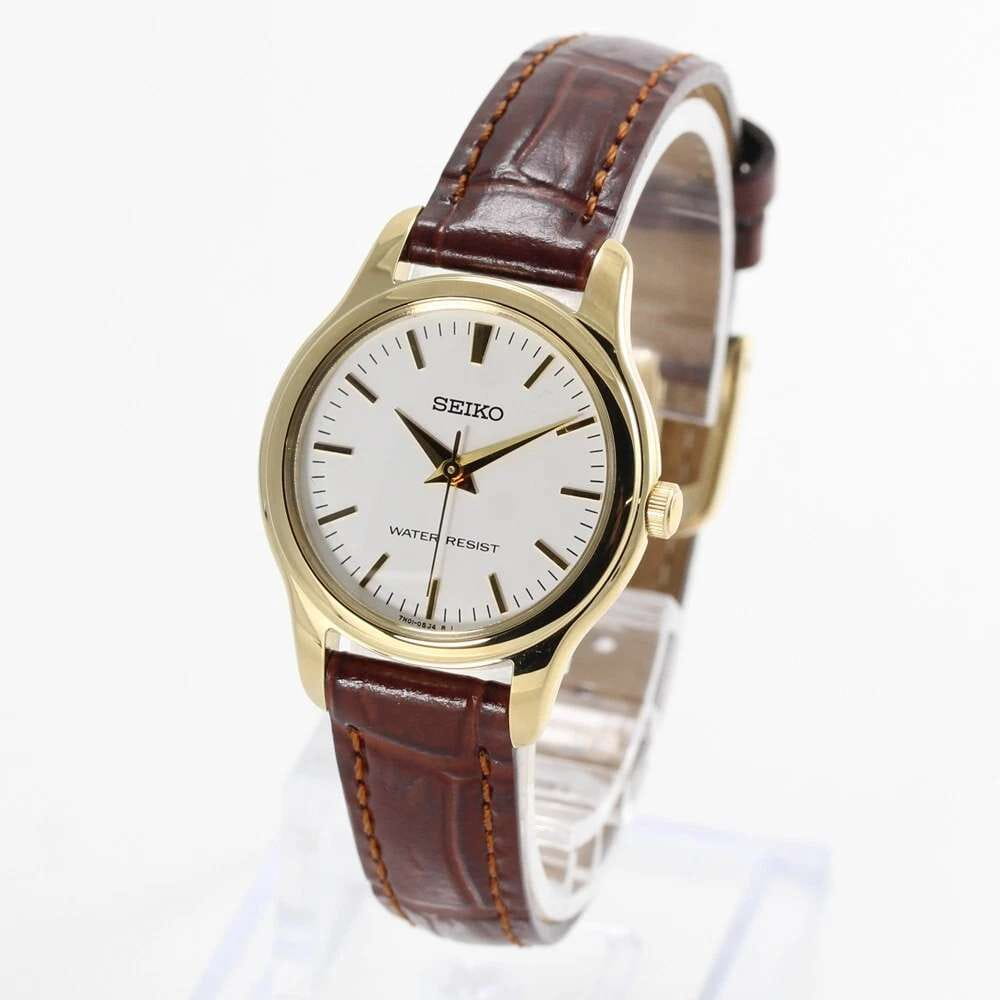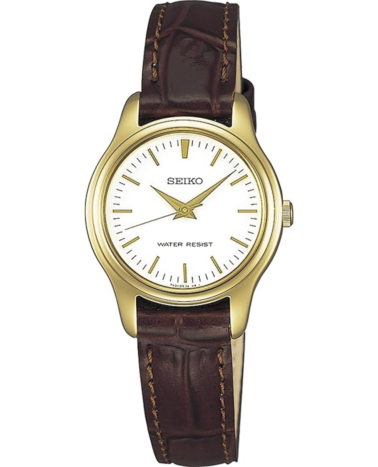 Женские кварцевые часы Seiko — это надёжный и универсальный аксессуар. Корпус размером 25,8 мм и толщиной 6 мм выполнен из нержавеющей стали с IP-покрытиемIP-покрытиеМетод ионного напыления. Демонстрирует повышенную устойчивость к истиранию, окислению и химическим веществам. Под воздействием высокого давления и температуры около 1500°C молекулы металла надёжно соединяются с частицами корпуса часов. цвета золота. Циферблат белого цвета оформлен индексами и стрелками, включая центральную секундную стрелку. Циферблат защищён прочным закалённым минеральным стеклом Hardlex минеральным стекломМинеральное стеклоМинеральное стекло представляет собой искусственно выращенный минерал кварца. Такое стекло отличается особой устойчивостью к повреждениям и царапинам. Уступает по некоторым качествам сапфировому стеклу.. Механизм — кварцевый с высокой точностью хода (±15 сек. в месяц). Часы оснащены коричневым кожаным ремешком на классической пряжке. Водонепроницаемость позволяет использовать часы в повседневных условиях. Идеальный выбор для тех, кто ценит японское качество и классический дизайн.