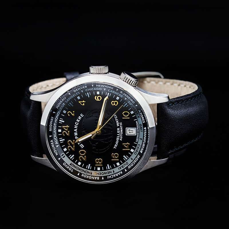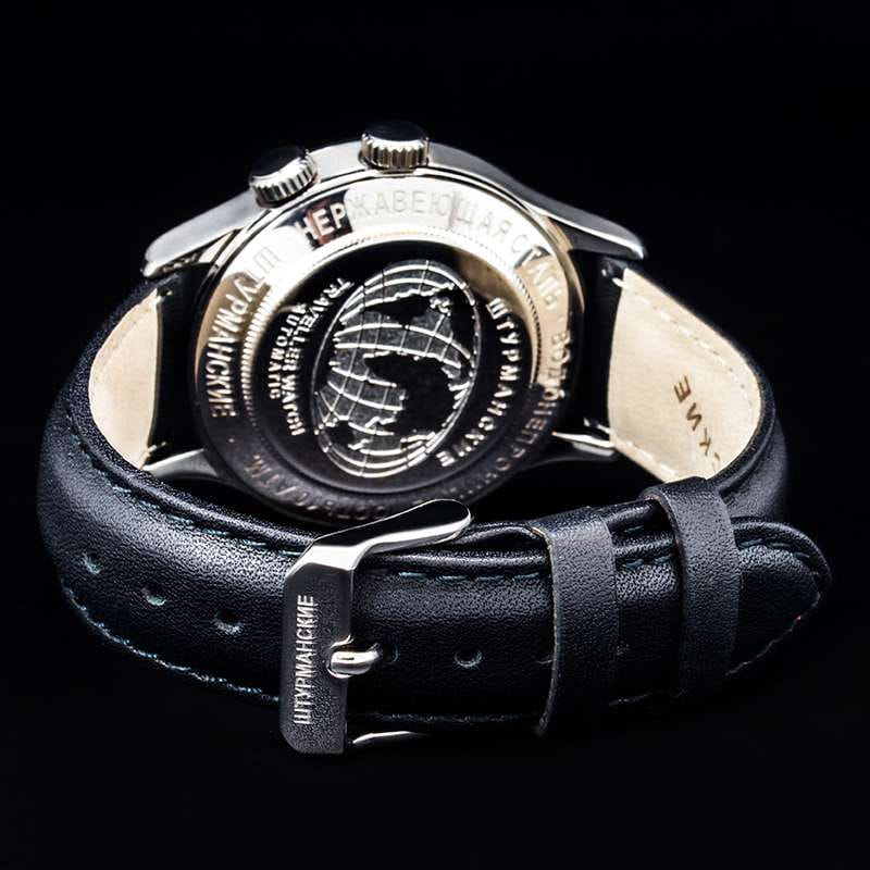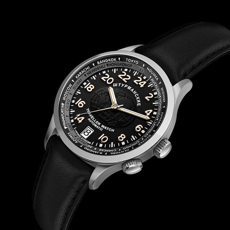 Мужские механические часы с автоподзаводом — это надёжный спутник в любых путешествиях. Корпус диаметром 42 мм выполнен из стали. Циферблат чёрного цвета оформлен индексами и стрелками. Присутствуют функции мирового времени (UTCМировое время Полезное часовое усложнение, отображающее время в основных городах и известных областях по всему миру, оно связано с часовыми поясами, удобно для путешественников и бизнесменов. ), 24-часового формата отображения времени и вращающийся внутренний безельБезельВнешний ободок, закрепляющий стекло. В спортивных часах так называется поворотное кольцо с делениями на циферблате, выполняет роль таймера – замеряет отрезки времени на шкале. Неподвижный безель – элемент декора. Однонаправленно вращающийся безель на дайверских часах позволяет фиксировать моменты погружения и выныривания на поверхность. для удобного определения часовых поясов. Окошко даты расположено в положении 6 часов. Циферблат защищён минеральным стекломМинеральное стеклоМинеральное стекло представляет собой искусственно выращенный минерал кварца. Такое стекло отличается особой устойчивостью к повреждениям и царапинам. Уступает по некоторым качествам сапфировому стеклу.. Часы оснащены кожаным ремешком на классической пряжке. Водонепроницаемость 100 м позволяет использовать часы для плавания и повседневного ношения. Идеальный выбор для тех, кто ценит отечественное качество и универсальный дизайн.
