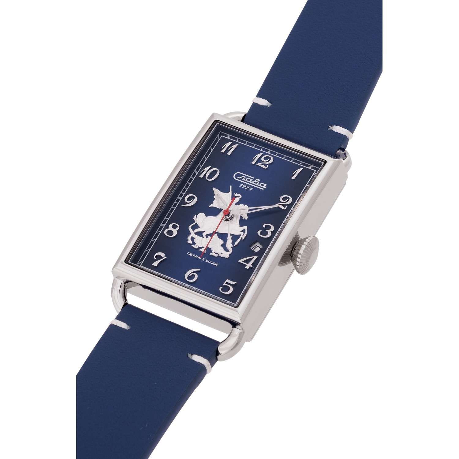 Часы Слава Москва 8700784/300-2414 — это воплощение элегантности и стиля, которое станет идеальным дополнением к вашему деловому гардеробу. Созданные в России, они оснащены надежным механическим механизмом калибра Слава 2414. Корпус выполнен из высококачественной стали, что обеспечивает долговечность и изысканный внешний вид. Синий циферблат украшен изображением Георгия Победоносца и защищен прочным сапфировым стекломСапфировое стеклоПрочный и надёжный материал из кристалла сапфира синтетического происхождения, характеризующийся особой твёрдостью и устойчивостью к царапинам и повреждениям., которое устойчиво к царапинам. Арабские цифры и окошко даты, расположенное между отметками 3 и 4 часа, добавляют функциональности и удобства в использовании. Задняя крышка, крепящаяся на 4 винтах, украшена надписью «Москва», подчеркивая уникальность и оригинальность модели. Кожаный ремешок с классической застежкой и системой быстрой замены не только обеспечивает комфорт, но и позволяет легко менять его по вашему желанию. Часы обладают водозащитой 50WR, что делает их подходящими для ежедневного ношения. Компактные габариты и вес в 70 грамм делают их удобными и практически незаметными на запястье. Эта лимитированная серия выпущена в количестве всего 500 экземпляров, что придает особую ценность и эксклюзивность вашему выбору. Часы поставляются в стильной подарочной упаковке, что делает их отличным подарком для ценителей высокого качества и утонченного дизайна.