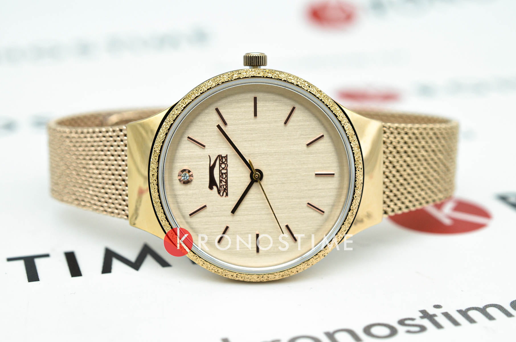 Женские наручные часы Slazenger SL.09.2015.3.02 сочетают в себе элегантный дизайн и надежность современных технологий. Модель обладает круглым корпусом диаметром 35 мм, изготовленным из суперметалла с IP-покрытиемIP-покрытиеМетод ионного напыления. Демонстрирует повышенную устойчивость к истиранию, окислению и химическим веществам. Под воздействием высокого давления и температуры около 1500°C молекулы металла надёжно соединяются с частицами корпуса часов. розового золота, что обеспечивает высокую устойчивость к внешним воздействиям. Браслет миланского плетения из суперметалла с IP-покрытиемIP-покрытиеМетод ионного напыления. Демонстрирует повышенную устойчивость к истиранию, окислению и химическим веществам. Под воздействием высокого давления и температуры около 1500°C молекулы металла надёжно соединяются с частицами корпуса часов. на раскладном замкеРаскладной замокДанный вариант застежки используется только на часах с металлическим браслетом. Отличительная особенность такого крепления в том, что длина браслета становится универсальной и вы можете самостоятельно отрегулировать нужный вам размер – застежка просто двигается по браслету часов., что гарантирует комфортное ношение и стильный внешний вид. Циферблат украшен индексами и кристаллами, оснащен тремя стрелками для показания часов, минут и секунд. Для защиты применяется минеральное стеклоМинеральное стеклоМинеральное стекло представляет собой искусственно выращенный минерал кварца. Такое стекло отличается особой устойчивостью к повреждениям и царапинам. Уступает по некоторым качествам сапфировому стеклу., обеспечивающее прочную защиту от царапин. Часы работают на японском кварцевом механизме, что гарантирует точное время без необходимости подзаводки. Водонепроницаемость часов достигает 5 атмосфер (50 метров), что позволяет использовать их при контакте с водой, например, во время мытья рук или попадания брызг, однако не рекомендуется для плавания.