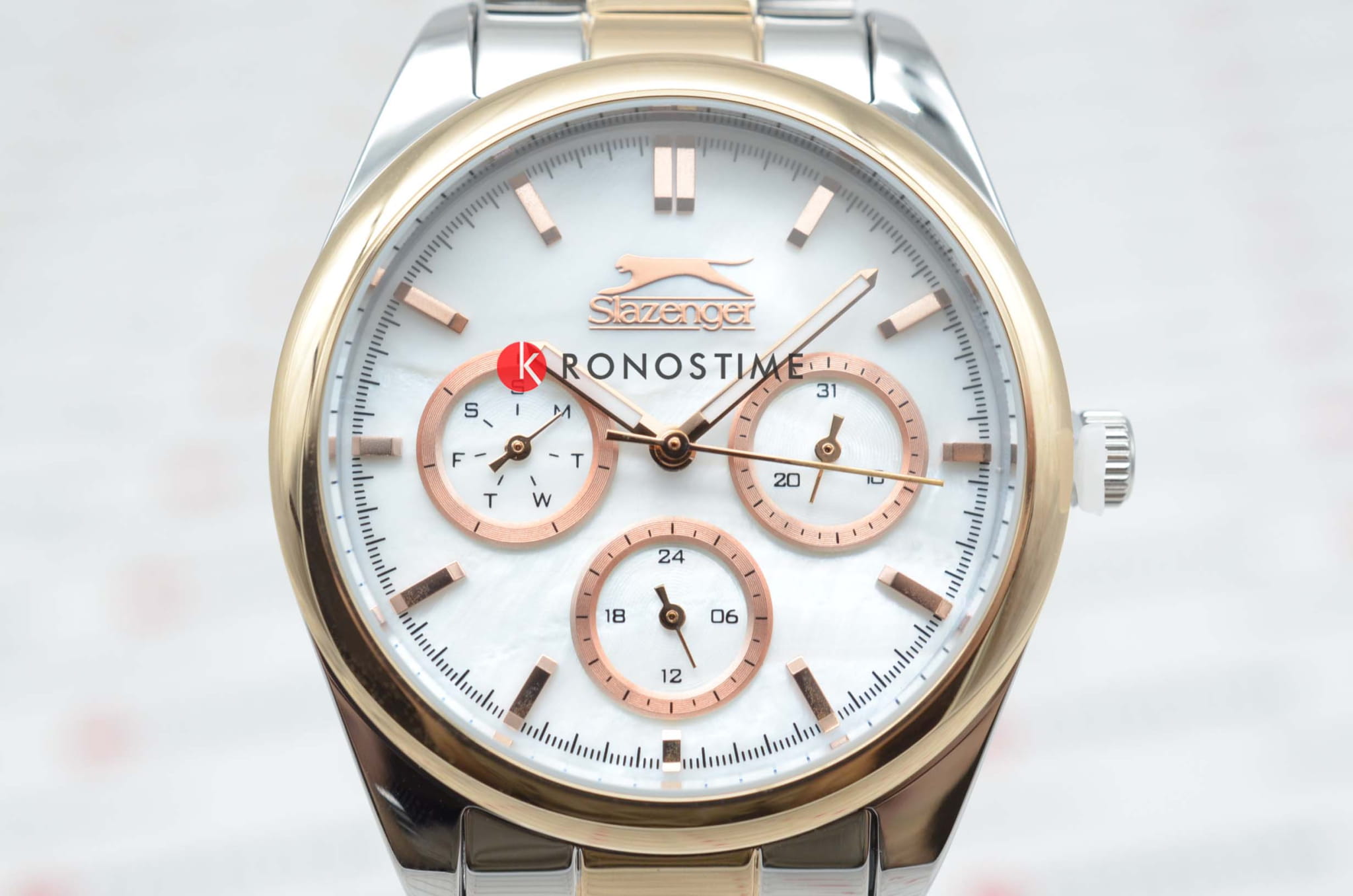 Женские наручные часы Slazenger SL.09.2063.4.04 сочетают в себе классический дизайн и высокое качество исполнения. Модель обладает круглым корпусом диаметром 36 мм, изготовленным из суперметалла, что обеспечивает устойчивость к внешним воздействиям. Браслет выполнен из суперметалла с частичным IP-покрытиемIP-покрытиеМетод ионного напыления. Демонстрирует повышенную устойчивость к истиранию, окислению и химическим веществам. Под воздействием высокого давления и температуры около 1500°C молекулы металла надёжно соединяются с частицами корпуса часов. на раскладной застёжкеРаскладная застёжкаТакой тип застёжки используется только на браслетах из металла. Она никогда не раскрывается полностью, происходит разделение на 2 и более частей. Раскладывающая застёжка снизит вероятность потери часов к минимуму.. Неподвижный безельБезельВнешний ободок, закрепляющий стекло. В спортивных часах так называется поворотное кольцо с делениями на циферблате, выполняет роль таймера – замеряет отрезки времени на шкале. Неподвижный безель – элемент декора. Однонаправленно вращающийся безель на дайверских часах позволяет фиксировать моменты погружения и выныривания на поверхность. из суперметалла с IP-покрытиемIP-покрытиеМетод ионного напыления. Демонстрирует повышенную устойчивость к истиранию, окислению и химическим веществам. Под воздействием высокого давления и температуры около 1500°C молекулы металла надёжно соединяются с частицами корпуса часов. цвета розового золота. Перламутровый циферблат украшен логотипом бренда и метками времени. Имеются дополнительные малые циферблаты для отображения даты, дня недели и текущего времени в 24-часовом формате. Для защиты используется минеральное стеклоМинеральное стеклоМинеральное стекло представляет собой искусственно выращенный минерал кварца. Такое стекло отличается особой устойчивостью к повреждениям и царапинам. Уступает по некоторым качествам сапфировому стеклу., обеспечивающее прочную защиту от царапин. Стрелки и метки имеют люминесцентное покрытиеЛюминесцентное покрытиеПозволяет считывать показания времени в темноте. Производители наносят на стрелки, часовые индексы, безель или поверхность циферблата светонакопительный состав, дающий холодное свечение., что позволяет легко читать время в темноте. Часы работают на японском кварцевом механизме, который обеспечивает точность хода без необходимости подзаводки. Водонепроницаемость часов составляет 3 атмосферы (WR30), что позволяет защитить корпус от случайных брызг или капель дождя.