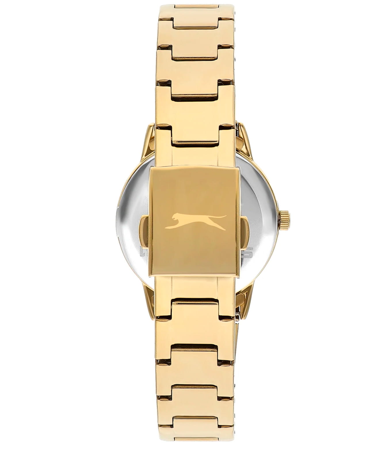 Женские наручные часы Slazenger SL.09.2071.3.08 представляют собой элегантное сочетание классики и современных технологий. Модель обладает круглым корпусом диаметром 32 мм, изготовленным из суперметалла с IP-покрытиемIP-покрытиеМетод ионного напыления. Демонстрирует повышенную устойчивость к истиранию, окислению и химическим веществам. Под воздействием высокого давления и температуры около 1500°C молекулы металла надёжно соединяются с частицами корпуса часов., что обеспечивает высокую устойчивость к внешним воздействиям и привлекательный внешний вид. Браслет выполнен с частичным IP-покрытиемIP-покрытиеМетод ионного напыления. Демонстрирует повышенную устойчивость к истиранию, окислению и химическим веществам. Под воздействием высокого давления и температуры около 1500°C молекулы металла надёжно соединяются с частицами корпуса часов. золотистого цвета и оснащен раскладной застежкойРаскладной замокДанный вариант застежки используется только на часах с металлическим браслетом. Отличительная особенность такого крепления в том, что длина браслета становится универсальной и вы можете самостоятельно отрегулировать нужный вам размер – застежка просто двигается по браслету часов., гарантирующей комфортное ношение и безопасность. Серебристый циферблат украшен фианитами, добавляя модели особую роскошь. Для защиты используется минеральное стеклоМинеральное стеклоМинеральное стекло представляет собой искусственно выращенный минерал кварца. Такое стекло отличается особой устойчивостью к повреждениям и царапинам. Уступает по некоторым качествам сапфировому стеклу., обеспечивающее прочную защиту от царапин. Стрелки с люминесцентным покрытиемЛюминесцентное покрытиеПозволяет считывать показания времени в темноте. Производители наносят на стрелки, часовые индексы, безель или поверхность циферблата светонакопительный состав, дающий холодное свечение.. Часы работают на японском кварцевом механизме, что гарантирует точное время без необходимости подзаводки. Водонепроницаемость достигает 3 атмосфер (WR30), что позволяет использовать их при контакте с брызгами воды, однако не рекомендуется для плавания или дайвинга. Вес часов составляет 76 грамм, делая их удобными для повседневного использования.
