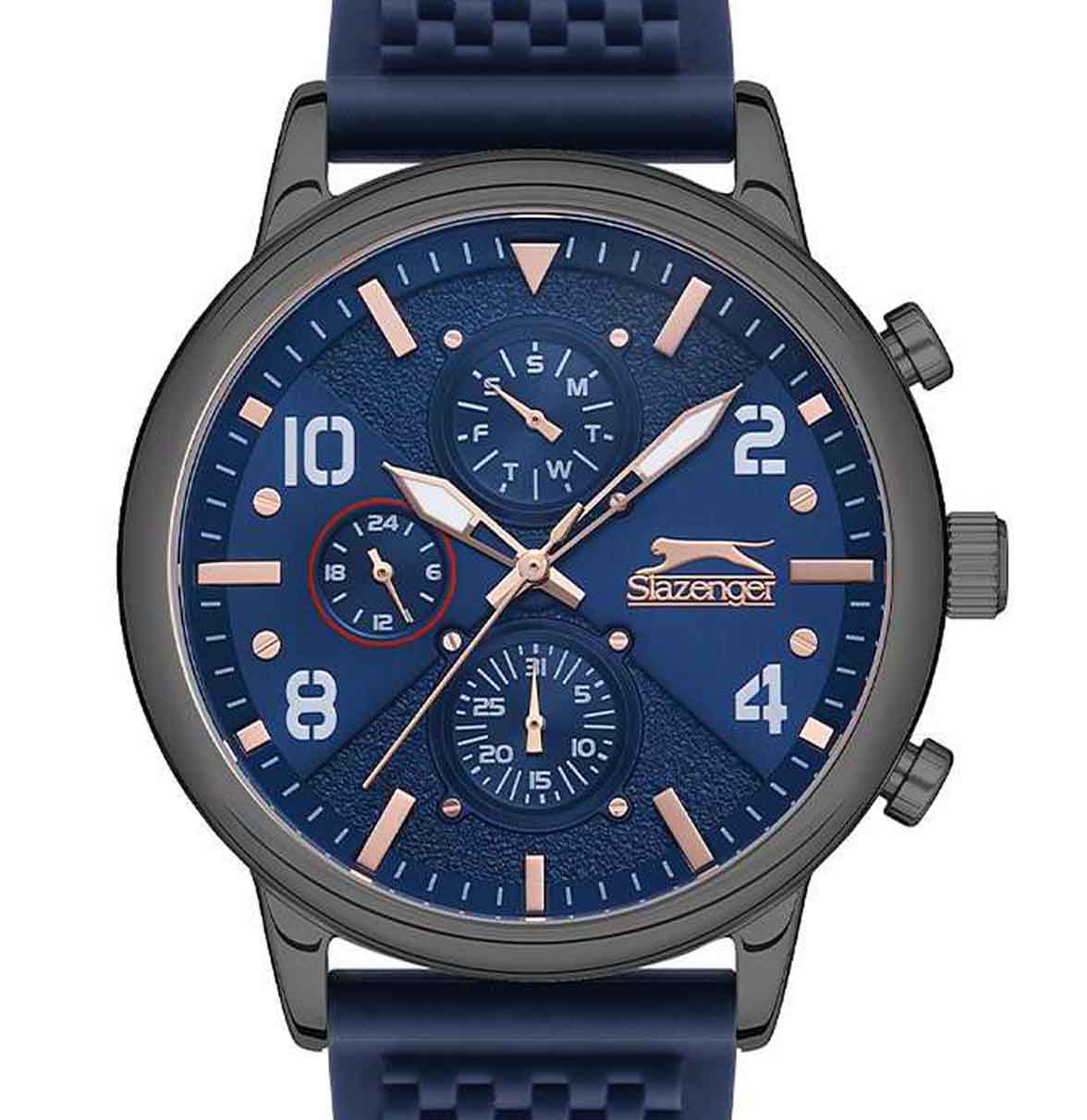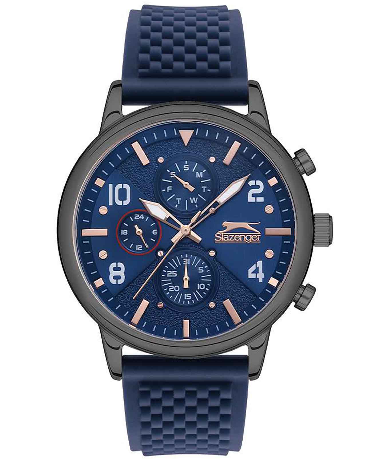 Мужские наручные часы Slazenger SL.09.2089.2.03 сочетают в себе современный дизайн и функциональность для повседневного использования. Модель обладает круглым корпусом диаметром 46 мм, изготовленным из суперметалла с серым PVD-покрытиемPVDУльтратонкое покрытие наносится в технике вакуумного напыления, сочетает в себе нитрид титана особой прочности со слоем золота или оксида хрома. Несёт в себе декоративную или защитную функцию., что обеспечивает высокую устойчивость к внешним воздействиям. Браслет выполнен из синего пластика с классической застежкой, гарантирующей комфортное ношение и безопасность. Синий циферблат имеет дополнительные малые циферблаты для отображения даты, дня недели и текущего времени в 24-часовом формате. Стрелки и метки имеют люминесцентное покрытиеЛюминесцентное покрытиеПозволяет считывать показания времени в темноте. Производители наносят на стрелки, часовые индексы, безель или поверхность циферблата светонакопительный состав, дающий холодное свечение., что позволяет легко читать время в темноте. Для защиты используется сапфировое стеклоСапфировое стеклоПрочный и надёжный материал из кристалла сапфира синтетического происхождения, характеризующийся особой твёрдостью и устойчивостью к царапинам и повреждениям., обеспечивающее высокую устойчивость к царапинам. Часы работают на кварцевом механизме, что гарантирует точное время без необходимости подзаводки. Модель также имеет класс водонепроницаемости WR50 (5 атм), что позволяет использовать их во время плавания без ныряния. Вес часов составляет 84 грамма, делая их удобными для длительного ношения.