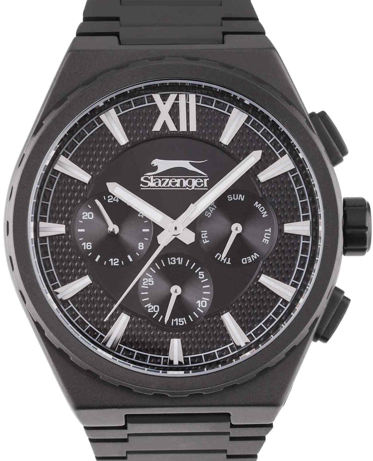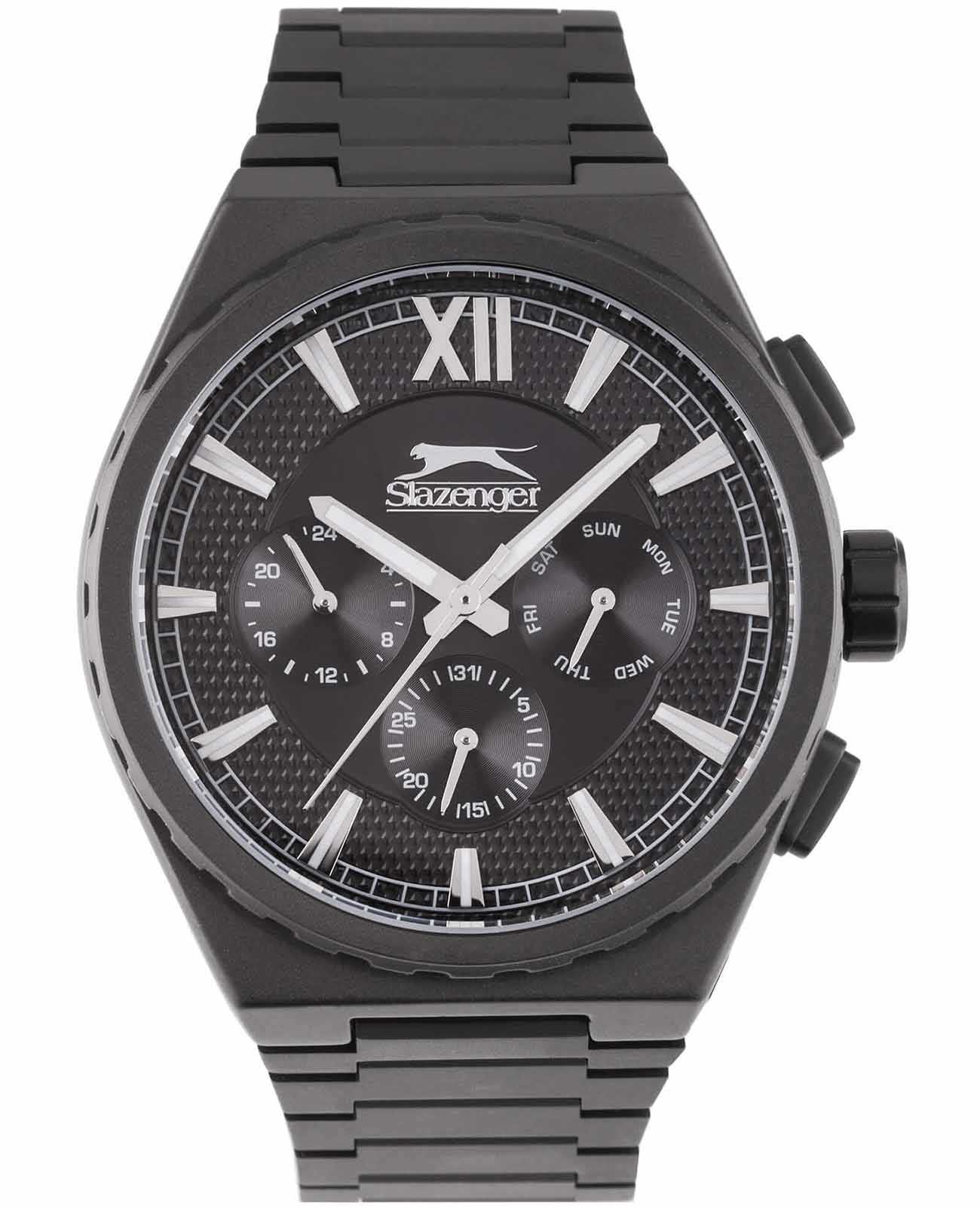 Часы Slazenger SL.09.2128.2.05 воплощают в себе элегантность и практичность, идеально подходящие для современных мужчин. Их черный циферблат, защищенный минеральным стекломМинеральное стеклоМинеральное стекло представляет собой искусственно выращенный минерал кварца. Такое стекло отличается особой устойчивостью к повреждениям и царапинам. Уступает по некоторым качествам сапфировому стеклу., заключен в такой же черный корпус диаметром 46 мм и безельБезельВнешний ободок, закрепляющий стекло. В спортивных часах так называется поворотное кольцо с делениями на циферблате, выполняет роль таймера – замеряет отрезки времени на шкале. Неподвижный безель – элемент декора. Однонаправленно вращающийся безель на дайверских часах позволяет фиксировать моменты погружения и выныривания на поверхность., которые изготовлены из прочного суперметалла с IP-покрытиемIP-покрытиеМетод ионного напыления. Демонстрирует повышенную устойчивость к истиранию, окислению и химическим веществам. Под воздействием высокого давления и температуры около 1500°C молекулы металла надёжно соединяются с частицами корпуса часов.. Надежный кварцевый механизм обеспечивает точность, а водозащита 5 ATM делает их устойчивыми к воздействию воды. Стальной браслет из суперметалла с IP-покрытиемIP-покрытиеМетод ионного напыления. Демонстрирует повышенную устойчивость к истиранию, окислению и химическим веществам. Под воздействием высокого давления и температуры около 1500°C молекулы металла надёжно соединяются с частицами корпуса часов. с раскладной застёжкойРаскладная застёжкаТакой тип застёжки используется только на браслетах из металла. Она никогда не раскрывается полностью, происходит разделение на 2 и более частей. Раскладывающая застёжка снизит вероятность потери часов к минимуму. подчеркивает современный стиль и комфортно сидит на запястье. Часы оснащены 24-часовым указателем времени, а также функциями отображения даты и дня недели. Люминесцентное покрытиеЛюминесцентное покрытиеПозволяет считывать показания времени в темноте. Производители наносят на стрелки, часовые индексы, безель или поверхность циферблата светонакопительный состав, дающий холодное свечение. на стрелках и метках обеспечивает отличную видимость в темноте.