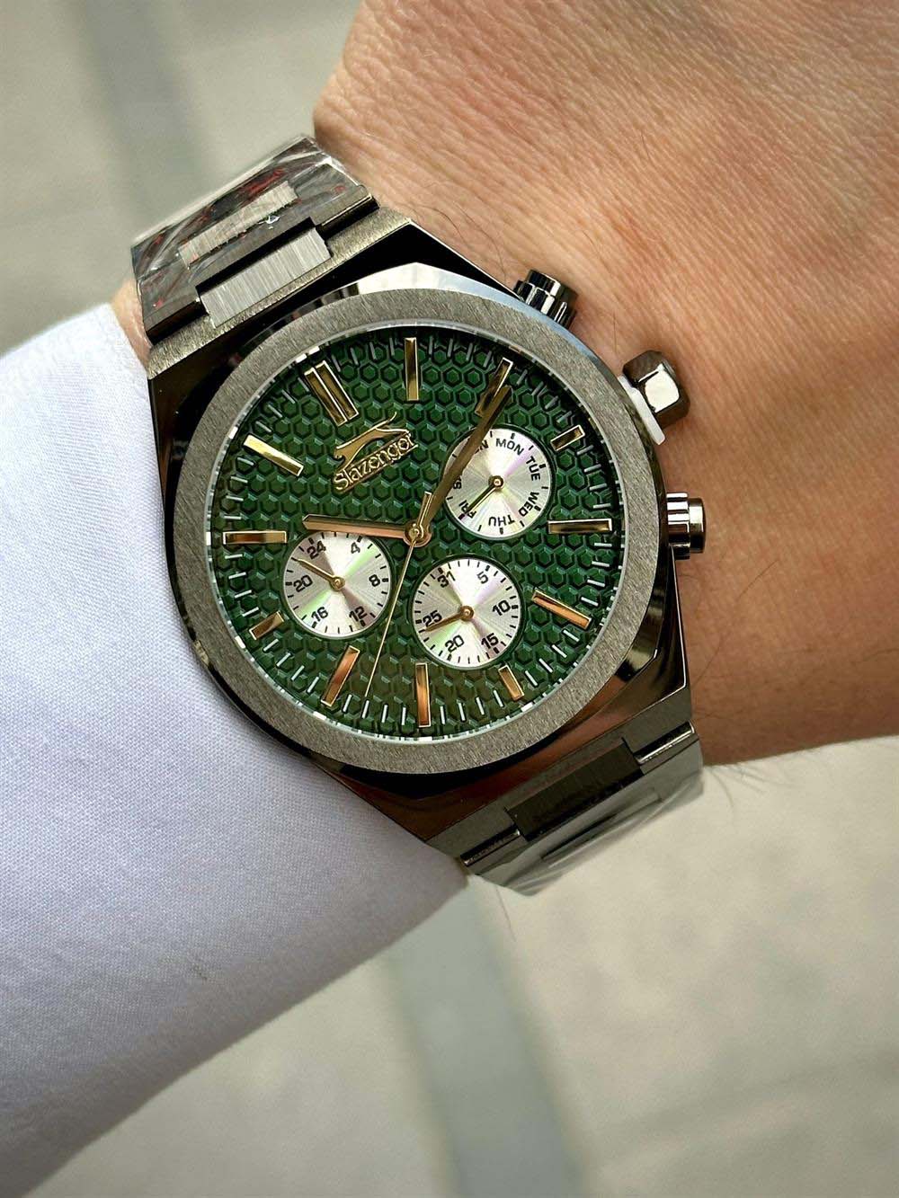 Часы Slazenger SL.09.2137.2.05 воплощают в себе элегантность и практичность, идеально подходящие для современных мужчин. Их зелёный циферблат с оригинальным рисунком в виде сот, защищен минеральным стекломМинеральное стеклоМинеральное стекло представляет собой искусственно выращенный минерал кварца. Такое стекло отличается особой устойчивостью к повреждениям и царапинам. Уступает по некоторым качествам сапфировому стеклу. и заключен в черный матовый корпус диаметром 44 мм из прочного суперметалла с IP-покрытиемIP-покрытиеМетод ионного напыления. Демонстрирует повышенную устойчивость к истиранию, окислению и химическим веществам. Под воздействием высокого давления и температуры около 1500°C молекулы металла надёжно соединяются с частицами корпуса часов.. Часы оснащены двойным форматом времени (12 и 24 часа), указателями дней недели и даты на дополнительных малых циферблатах. Надежный кварцевый механизм обеспечивает точность, а водозащита 5 ATM делает их устойчивыми к воздействию воды. Черный браслет из суперметалла с IP-покрытиемIP-покрытиеМетод ионного напыления. Демонстрирует повышенную устойчивость к истиранию, окислению и химическим веществам. Под воздействием высокого давления и температуры около 1500°C молекулы металла надёжно соединяются с частицами корпуса часов. имеет раскладную застёжкуРаскладная застёжкаТакой тип застёжки используется только на браслетах из металла. Она никогда не раскрывается полностью, происходит разделение на 2 и более частей. Раскладывающая застёжка снизит вероятность потери часов к минимуму., что подчеркивает современный стиль и позволяет легко снимать часы. Размер браслета (H1-H2): 24-20 мм.