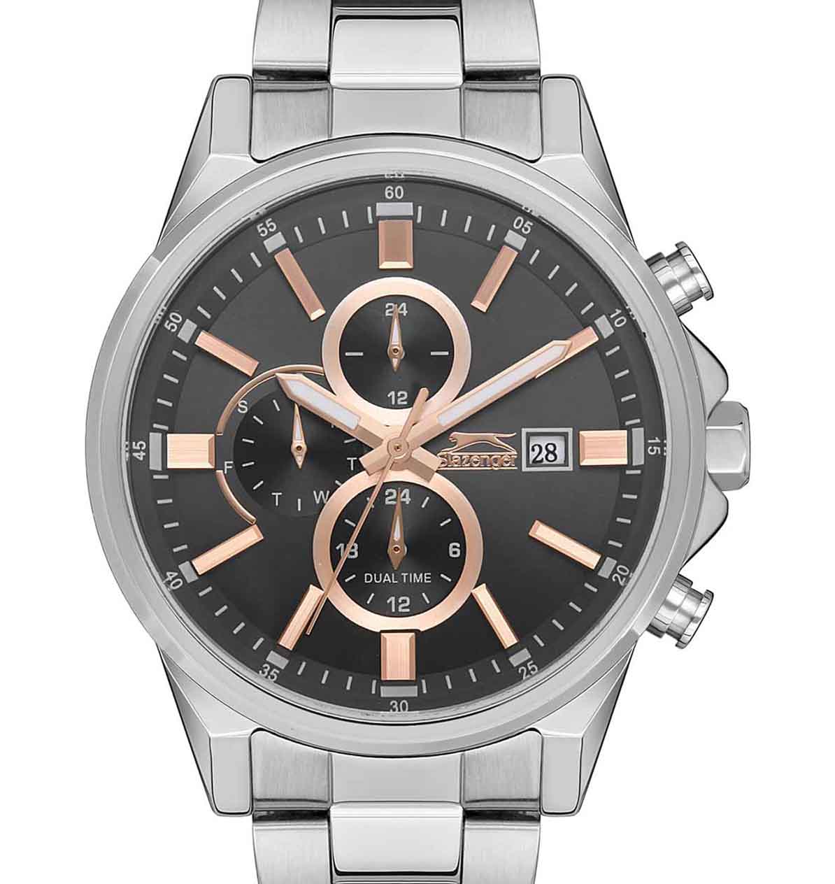 Часы Slazenger SL.09.2139.2.05 воплощают в себе элегантность и практичность, идеально подходящие для современных мужчин. Их серый циферблат защищен минеральным стекломМинеральное стеклоМинеральное стекло представляет собой искусственно выращенный минерал кварца. Такое стекло отличается особой устойчивостью к повреждениям и царапинам. Уступает по некоторым качествам сапфировому стеклу. и заключен в серебристый корпус диаметром 46 мм, который изготовлен из прочного суперметалла. Часы оснащены указателями второго часового пояса, дня недели и текущего времени в 24-х часовом формате на дополнительных малых циферблатах. Окошко даты расположено в положении 3 часов. Золотистые стрелки и метки имеют люминесцентное покрытиеЛюминесцентное покрытиеПозволяет считывать показания времени в темноте. Производители наносят на стрелки, часовые индексы, безель или поверхность циферблата светонакопительный состав, дающий холодное свечение., что позволяет легко считывать время в темноте. Надежный кварцевый механизм обеспечивает точность, а водозащита 5 ATM делает их устойчивыми к воздействию воды. Браслет из суперметалла имеет раскладную застёжкуРаскладная застёжкаТакой тип застёжки используется только на браслетах из металла. Она никогда не раскрывается полностью, происходит разделение на 2 и более частей. Раскладывающая застёжка снизит вероятность потери часов к минимуму., что подчеркивает современный стиль и позволяет легко снимать часы. Ширина ремешка 22 мм.