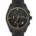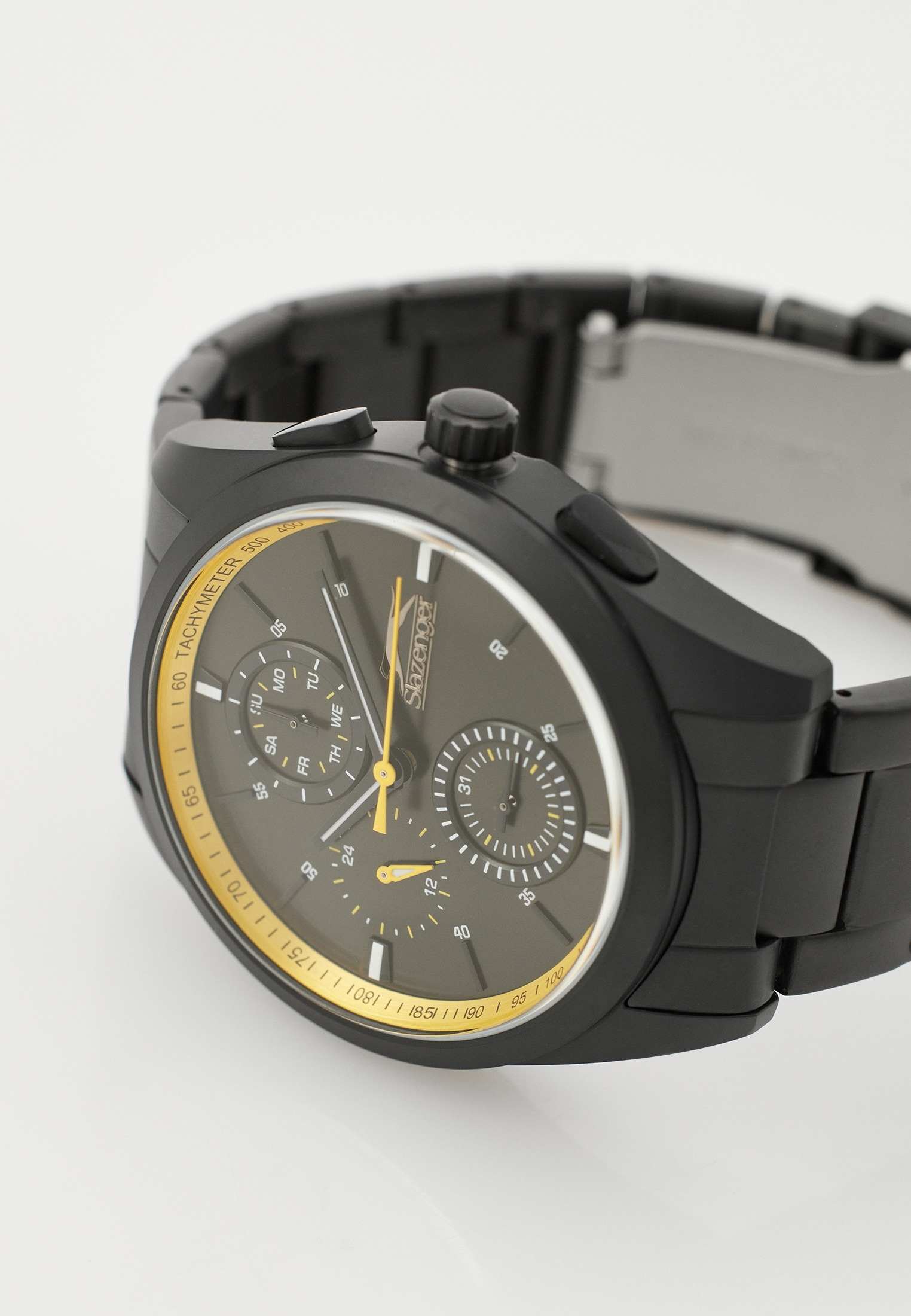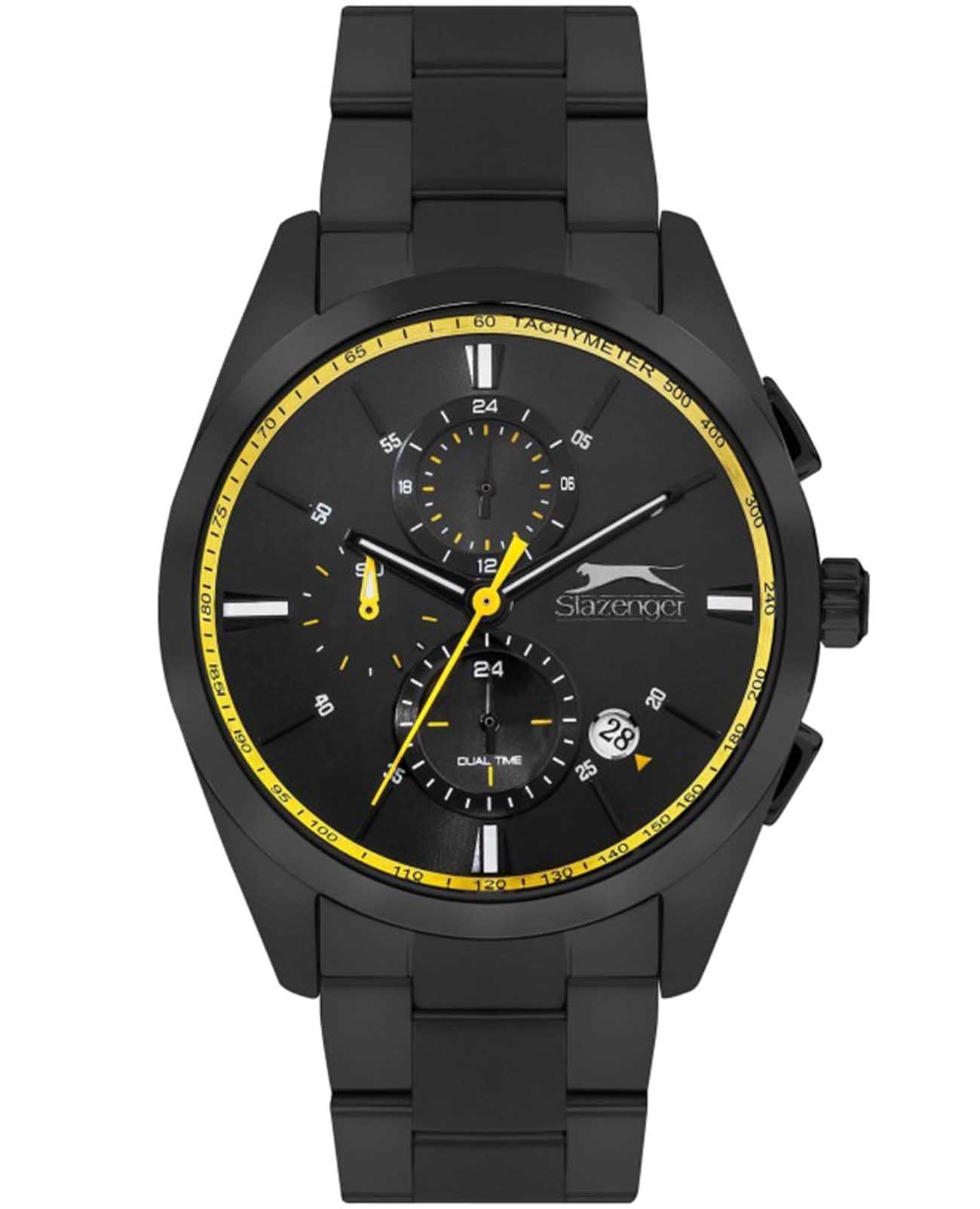Часы Slazenger SL.09.2215.2.05 представляют собой стильные мужские наручные часы, которые сочетают в себе элегантный дизайн и функциональность. Изготовленные в Англии, эти кварцевые часы оснащены прочным металлическим корпусом и черным металлическим браслетом с раскладной застёжкойРаскладная застёжкаТакой тип застёжки используется только на браслетах из металла. Она никогда не раскрывается полностью, происходит разделение на 2 и более частей. Раскладывающая застёжка снизит вероятность потери часов к минимуму., который обеспечивает надежную фиксацию на запястье, также на них нанесено IP-покрытиеIP-покрытиеМетод ионного напыления. Демонстрирует повышенную устойчивость к истиранию, окислению и химическим веществам. Под воздействием высокого давления и температуры около 1500°C молекулы металла надёжно соединяются с частицами корпуса часов.. Минеральное стеклоМинеральное стеклоМинеральное стекло представляет собой искусственно выращенный минерал кварца. Такое стекло отличается особой устойчивостью к повреждениям и царапинам. Уступает по некоторым качествам сапфировому стеклу. защищает черный циферблат от царапин, а водозащита WR 50 позволяет использовать их в условиях повышенной влажности. Диаметр корпуса составляет 43 мм, а толщина — 14 мм, что делает часы удобными для ежедневного ношения. Ширина ремешка — 22 мм, что обеспечивает комфорт и стильный вид на руке. Дополнительные функции включают отображение второго часового поясаВторой часовой поясФункция, позволяющая отображать время двух часовых поясов одновременно., дня недели и текущего времени в 24-часовом формате, а также наличие окошка даты для удобства пользователя. Стрелки снабжены люминесцентным покрытиемЛюминесцентное покрытиеПозволяет считывать показания времени в темноте. Производители наносят на стрелки, часовые индексы, безель или поверхность циферблата светонакопительный состав, дающий холодное свечение., что позволяет легко считывать время в темноте. Часы также оснащены тахиметромТахиметрРазмеченная шкала, располагается на ободке или безеле часов. Тахиметр позволяет рассчитать скорость на определённом участке пути, расстояние измеряется в километрах или милях., что добавляет им функциональности и может быть полезно для измерения скорости.