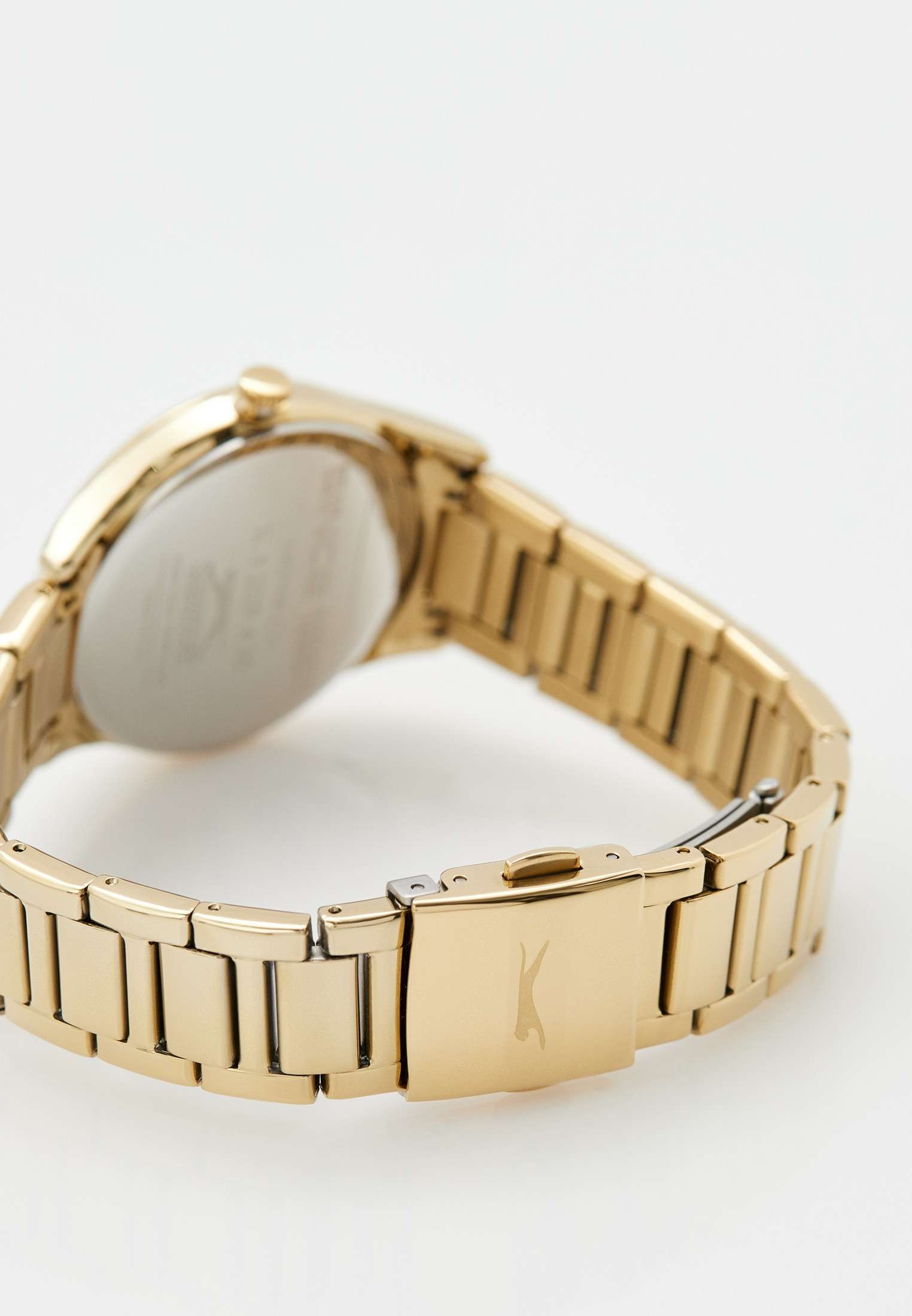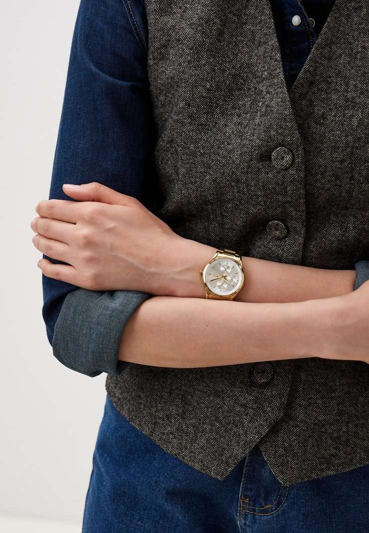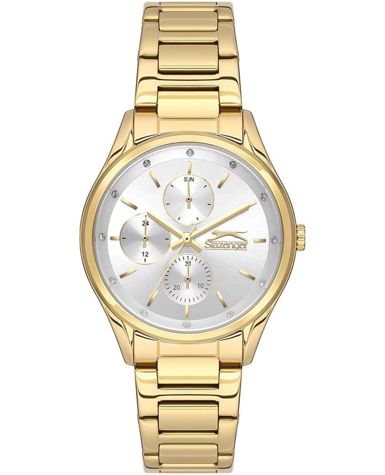 Часы Slazenger SL.09.2229.4.05 — это стильная и элегантная модель, созданная для современных женщин, ценящих изысканный дизайн и функциональность. Корпус и браслет выполнены из прочного металла золотистого цвета с IP-покрытиемIP-покрытиеМетод ионного напыления. Демонстрирует повышенную устойчивость к истиранию, окислению и химическим веществам. Под воздействием высокого давления и температуры около 1500°C молекулы металла надёжно соединяются с частицами корпуса часов., что придает аксессуару особую утонченность. Серебристый циферблат украшен мерцающими кристаллами, а также оснащён дополнительными малыми циферблатами, которые отображают дату, день недели и время в 24-часовом формате. Минеральное стеклоМинеральное стеклоМинеральное стекло представляет собой искусственно выращенный минерал кварца. Такое стекло отличается особой устойчивостью к повреждениям и царапинам. Уступает по некоторым качествам сапфировому стеклу. надежно защищает часы от царапин, а водозащита уровня WR 30 позволяет не беспокоиться о случайном попадании влаги. Металлический браслет снабжён удобной раскладной застёжкойРаскладная застёжкаТакой тип застёжки используется только на браслетах из металла. Она никогда не раскрывается полностью, происходит разделение на 2 и более частей. Раскладывающая застёжка снизит вероятность потери часов к минимуму.. Диаметр корпуса составляет 36 мм, толщина — 9 мм, а вес — 82 грамма, что обеспечивает комфортное ношение в течение всего дня. Часы оснащены кварцевым механизмом.