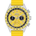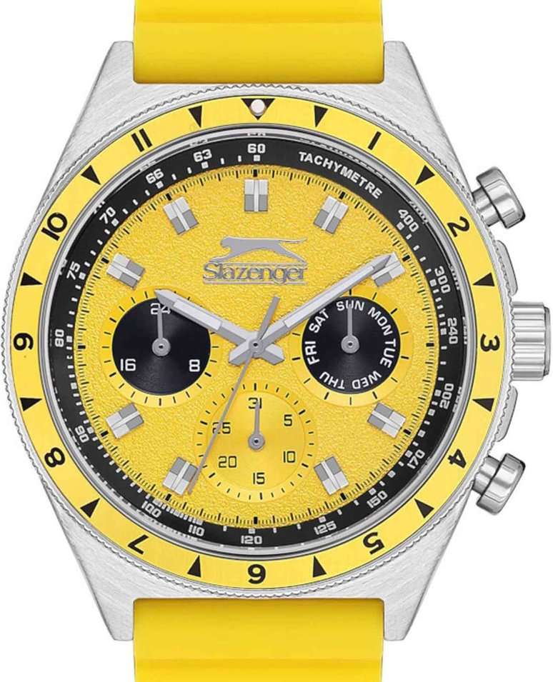 Часы Slazenger SL.09.2247.2.05 — это современная модель с выразительным спортивным характером, идеально подходящая для активного образа жизни. Корпус выполнен из прочного металла, желтый циферблат защищён минеральным стекломМинеральное стеклоМинеральное стекло представляет собой искусственно выращенный минерал кварца. Такое стекло отличается особой устойчивостью к повреждениям и царапинам. Уступает по некоторым качествам сапфировому стеклу., устойчивым к царапинам. Часы также оснащены шкалой тахиметраТахиметрРазмеченная шкала, располагается на ободке или безеле часов. Тахиметр позволяет рассчитать скорость на определённом участке пути, расстояние измеряется в километрах или милях., что добавляет им функциональности и может быть полезно для измерения скорости.  На безельБезельВнешний ободок, закрепляющий стекло. В спортивных часах так называется поворотное кольцо с делениями на циферблате, выполняет роль таймера – замеряет отрезки времени на шкале. Неподвижный безель – элемент декора. Однонаправленно вращающийся безель на дайверских часах позволяет фиксировать моменты погружения и выныривания на поверхность. нанесено желтое IP-покрытиеIP-покрытиеМетод ионного напыления. Демонстрирует повышенную устойчивость к истиранию, окислению и химическим веществам. Под воздействием высокого давления и температуры около 1500°C молекулы металла надёжно соединяются с частицами корпуса часов..  Диаметр корпуса составляет 46 мм, толщина — 11 мм, а ширина ремешка — 22 мм. Лёгкий и комфортный желтый резиновый ремешок оснащён классической застёжкой, благодаря чему часы удобно сидят на руке и не вызывают дискомфорта даже при длительном ношении. Вес модели составляет всего 79 грамм. Надёжный кварцевый механизм обеспечивает точность времени, а уровень водозащиты WR 50 позволяет использовать часы в повседневных условиях, не опасаясь случайных брызг или дождя. Для удобства использования в темное время суток предусмотрено люминесцентное покрытиеЛюминесцентное покрытиеПозволяет считывать показания времени в темноте. Производители наносят на стрелки, часовые индексы, безель или поверхность циферблата светонакопительный состав, дающий холодное свечение. стрелок и меток. Дополнительные малые циферблаты показывают дату, день недели и текущее время в 24-часовом формате, что делает использование часов ещё более удобным и функциональным.