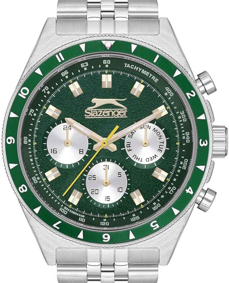 Часы Slazenger SL.09.2248.2.06 — это современная модель с выразительным спортивным характером, идеально подходящая для активного образа жизни. Корпус выполнен из прочного металла, зеленый циферблат защищён минеральным стекломМинеральное стеклоМинеральное стекло представляет собой искусственно выращенный минерал кварца. Такое стекло отличается особой устойчивостью к повреждениям и царапинам. Уступает по некоторым качествам сапфировому стеклу., устойчивым к царапинам. Часы также оснащены шкалой тахиметраТахиметрРазмеченная шкала, располагается на ободке или безеле часов. Тахиметр позволяет рассчитать скорость на определённом участке пути, расстояние измеряется в километрах или милях., что добавляет им функциональности и может быть полезно для измерения скорости.  На безельБезельВнешний ободок, закрепляющий стекло. В спортивных часах так называется поворотное кольцо с делениями на циферблате, выполняет роль таймера – замеряет отрезки времени на шкале. Неподвижный безель – элемент декора. Однонаправленно вращающийся безель на дайверских часах позволяет фиксировать моменты погружения и выныривания на поверхность. нанесено зеленое IP-покрытиеIP-покрытиеМетод ионного напыления. Демонстрирует повышенную устойчивость к истиранию, окислению и химическим веществам. Под воздействием высокого давления и температуры около 1500°C молекулы металла надёжно соединяются с частицами корпуса часов..  Диаметр корпуса составляет 46 мм, толщина — 11 мм, а ширина браслета — 22 мм.  Часы оснащены металлическим браслетом с надежной раскладной застёжкойРаскладная застёжкаТакой тип застёжки используется только на браслетах из металла. Она никогда не раскрывается полностью, происходит разделение на 2 и более частей. Раскладывающая застёжка снизит вероятность потери часов к минимуму., благодаря чему часы удобно сидят на руке и не вызывают дискомфорта даже при длительном ношении. Вес модели составляет 130 грамм. Надёжный кварцевый механизм обеспечивает точность времени, а уровень водозащиты WR 50 позволяет использовать часы в повседневных условиях, не опасаясь случайных брызг или дождя. Для удобства использования в темное время суток предусмотрено люминесцентное покрытиеЛюминесцентное покрытиеПозволяет считывать показания времени в темноте. Производители наносят на стрелки, часовые индексы, безель или поверхность циферблата светонакопительный состав, дающий холодное свечение. стрелок и меток. Дополнительные малые циферблаты показывают дату, день недели и текущее время в 24-часовом формате, что делает использование часов ещё более удобным и функциональным.