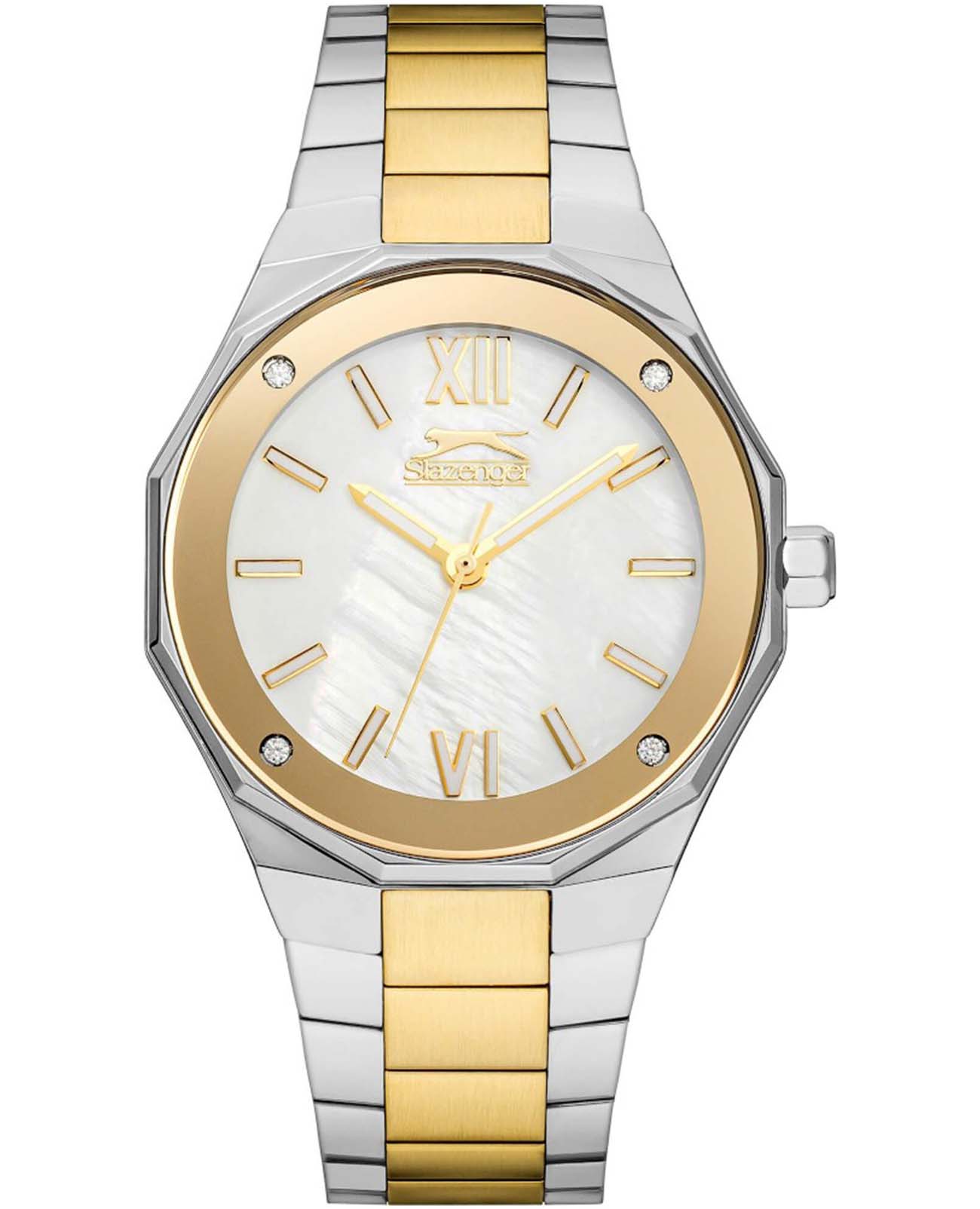 Часы Slazenger SL.09.2258.3.03 — это изысканный аксессуар, который гармонично подчеркнёт ваш индивидуальный стиль. Корпус и браслет выполнены из инновационного суперметалла — сплава на основе меди с пониженным содержанием цинка и никеля, обладающего специальным защитным покрытием, а циферблат украшен 4 кристаллами. Надёжный кварцевый механизм обеспечивает точный ход, а прочное минеральное стеклоМинеральное стеклоМинеральное стекло представляет собой искусственно выращенный минерал кварца. Такое стекло отличается особой устойчивостью к повреждениям и царапинам. Уступает по некоторым качествам сапфировому стеклу. устойчиво к царапинам и защищает перламутровый циферблат от внешних воздействий. Диаметр корпуса составляет 38 мм, толщина — всего 8 мм, что делает модель элегантной и удобной для ежедневного ношения. Водонепроницаемость до 3 бар позволяет не беспокоиться о случайных брызгах или каплях дождя. Стрелки с люминесцентным покрытиемЛюминесцентное покрытиеПозволяет считывать показания времени в темноте. Производители наносят на стрелки, часовые индексы, безель или поверхность циферблата светонакопительный состав, дающий холодное свечение. удобно подсвечиваются в темноте после зарядки на свету. Стальной браслет с частичным золотистым IP-покрытиемIP-покрытиеМетод ионного напыления. Демонстрирует повышенную устойчивость к истиранию, окислению и химическим веществам. Под воздействием высокого давления и температуры около 1500°C молекулы металла надёжно соединяются с частицами корпуса часов. и раскладной застёжкойРаскладная застёжкаТакой тип застёжки используется только на браслетах из металла. Она никогда не раскрывается полностью, происходит разделение на 2 и более частей. Раскладывающая застёжка снизит вероятность потери часов к минимуму. обеспечивает комфортную посадку. Часы станут отличным выбором как для повседневной жизни, так и для особых случаев, а также послужат прекрасным подарком на любой праздник.