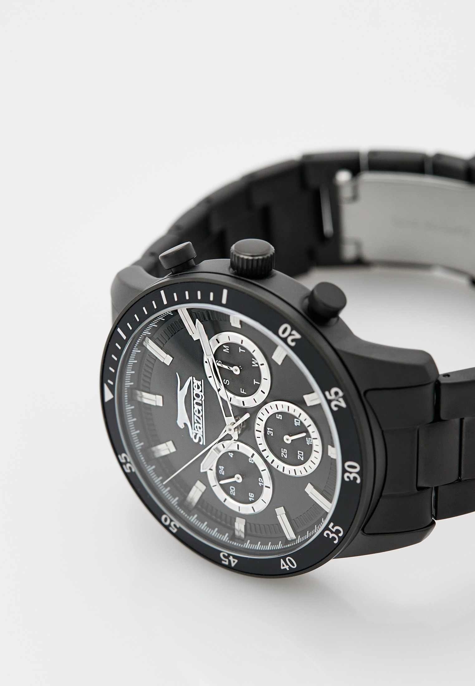 Часы Slazenger SL.09.2260.2.05 сочетают в себе выразительный дизайн и практичность, делая их отличным выбором для современного мужчины. Корпус и браслет выполнены из суперметалла с черным IP-покрытиеIP-покрытиеМетод ионного напыления. Демонстрирует повышенную устойчивость к истиранию, окислению и химическим веществам. Под воздействием высокого давления и температуры около 1500°C молекулы металла надёжно соединяются с частицами корпуса часов. — прочного сплава на основе меди с низким содержанием цинка и никеля, что обеспечивает долговечность изделия. На безельБезельВнешний ободок, закрепляющий стекло. В спортивных часах так называется поворотное кольцо с делениями на циферблате, выполняет роль таймера – замеряет отрезки времени на шкале. Неподвижный безель – элемент декора. Однонаправленно вращающийся безель на дайверских часах позволяет фиксировать моменты погружения и выныривания на поверхность. нанесено черное IP-покрытиеIP-покрытиеМетод ионного напыления. Демонстрирует повышенную устойчивость к истиранию, окислению и химическим веществам. Под воздействием высокого давления и температуры около 1500°C молекулы металла надёжно соединяются с частицами корпуса часов., что придает аксессуару утончённый и универсальный внешний вид. Модель оснащена точным кварцевым механизмом, защищённым минеральным стекломМинеральное стеклоМинеральное стекло представляет собой искусственно выращенный минерал кварца. Такое стекло отличается особой устойчивостью к повреждениям и царапинам. Уступает по некоторым качествам сапфировому стеклу.. На черном циферблате размещены дополнительные индикаторы: 24-часовой формат времени, дата и день недели. Класс водозащиты 5 бар позволяет не беспокоиться о брызгах и дожде. Диаметр корпуса составляет 45 мм, толщина — 12 мм, что придаёт часам солидный и современный вид. Стрелки с люминесцентным покрытиемЛюминесцентное покрытиеПозволяет считывать показания времени в темноте. Производители наносят на стрелки, часовые индексы, безель или поверхность циферблата светонакопительный состав, дающий холодное свечение. удобно подсвечиваются в темноте после зарядки на свету. Стальной браслет с раскладной застёжкойРаскладная застёжкаТакой тип застёжки используется только на браслетах из металла. Она никогда не раскрывается полностью, происходит разделение на 2 и более частей. Раскладывающая застёжка снизит вероятность потери часов к минимуму. обеспечивает комфортную посадку. Модель станет надёжным спутником как на каждый день, так и для особых случаев, а также превосходно подойдёт в качестве подарка. Гарантия от производителя — 12 месяцев.