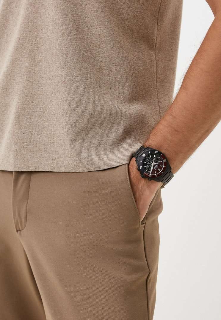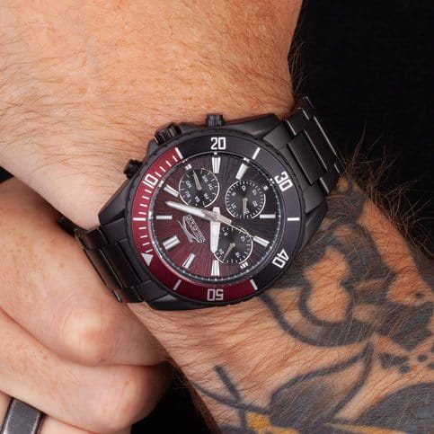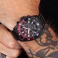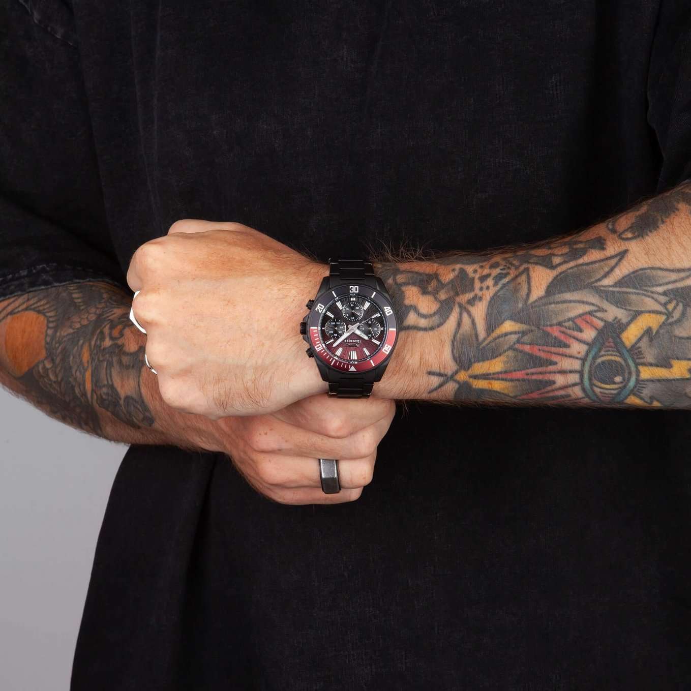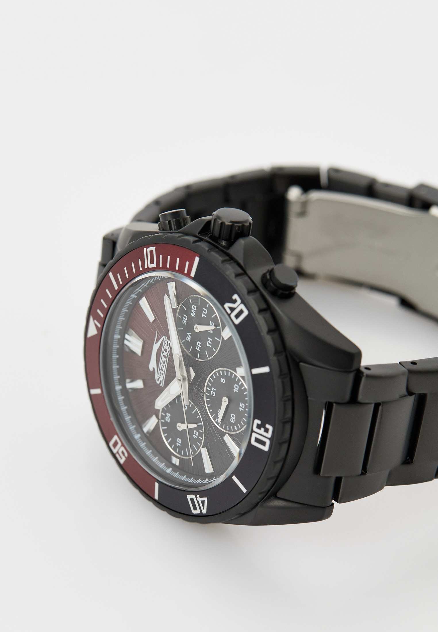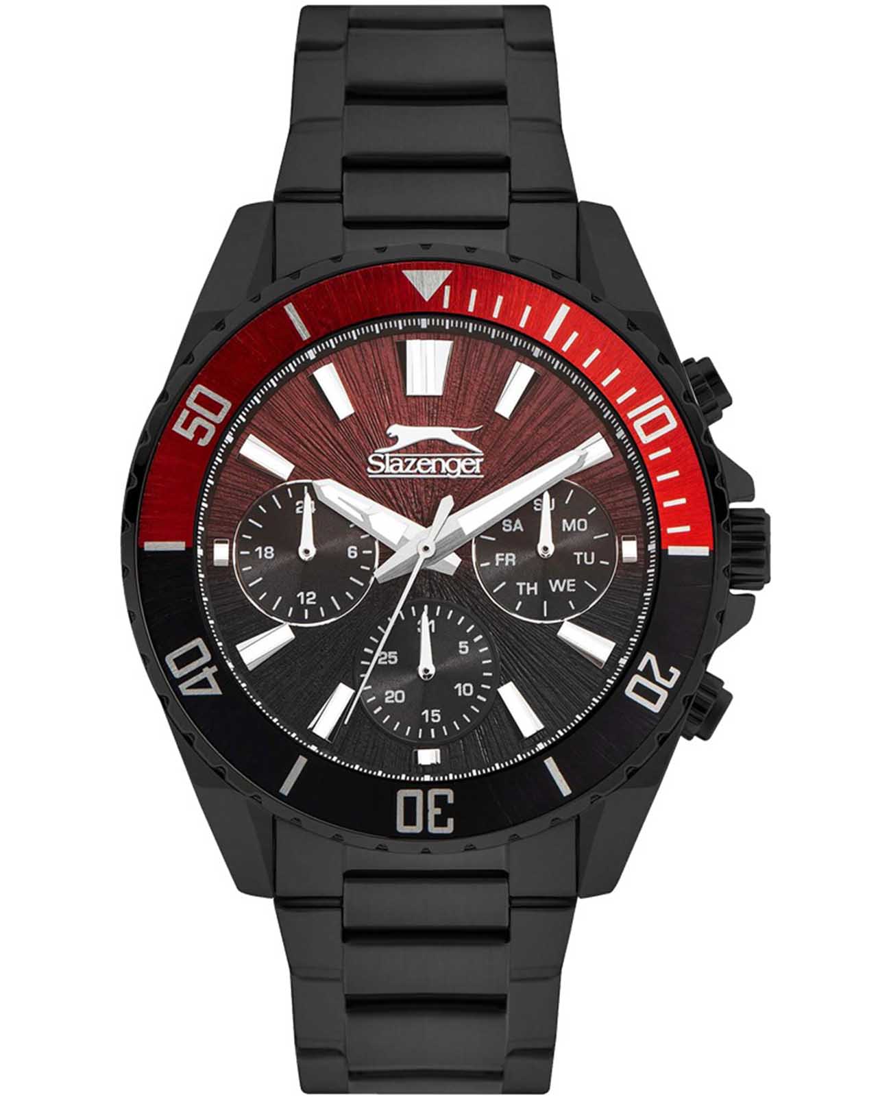 Часы Slazenger SL.09.2273.2.06 – стильный и функциональный аксессуар, который станет достойным дополнением к вашему образу. Модель оснащена надежным кварцевым механизмом, заключенным в корпус из инновационного суперметалла с черным IP-покрытиемIP-покрытиеМетод ионного напыления. Демонстрирует повышенную устойчивость к истиранию, окислению и химическим веществам. Под воздействием высокого давления и температуры около 1500°C молекулы металла надёжно соединяются с частицами корпуса часов. – прочного сплава на основе меди с пониженным содержанием цинка и никеля и специальным покрытием, устойчивым к износу. На безельБезельВнешний ободок, закрепляющий стекло. В спортивных часах так называется поворотное кольцо с делениями на циферблате, выполняет роль таймера – замеряет отрезки времени на шкале. Неподвижный безель – элемент декора. Однонаправленно вращающийся безель на дайверских часах позволяет фиксировать моменты погружения и выныривания на поверхность. нанесено черное и красное IP-покрытиеIP-покрытиеМетод ионного напыления. Демонстрирует повышенную устойчивость к истиранию, окислению и химическим веществам. Под воздействием высокого давления и температуры около 1500°C молекулы металла надёжно соединяются с частицами корпуса часов., что придает аксессуару утончённый и универсальный внешний вид. Чёрно-красный циферблат под минеральным стекломМинеральное стеклоМинеральное стекло представляет собой искусственно выращенный минерал кварца. Такое стекло отличается особой устойчивостью к повреждениям и царапинам. Уступает по некоторым качествам сапфировому стеклу. дополнен отдельными счетчиками: 24-часовой указатель времени, индикаторы даты и дня недели. Диаметр корпуса составляет 44 мм, а толщина – 12 мм, что обеспечивает комфортную посадку на запястье и подчёркивает современный стиль часов. Браслет из суперметалла с IP-покрытиемIP-покрытиеМетод ионного напыления. Демонстрирует повышенную устойчивость к истиранию, окислению и химическим веществам. Под воздействием высокого давления и температуры около 1500°C молекулы металла надёжно соединяются с частицами корпуса часов. и с раскладной застёжкойРаскладная застёжкаТакой тип застёжки используется только на браслетах из металла. Она никогда не раскрывается полностью, происходит разделение на 2 и более частей. Раскладывающая застёжка снизит вероятность потери часов к минимуму. обеспечивает комфортную посадку. Стрелки и метки с люминесцентным покрытиемЛюминесцентное покрытиеПозволяет считывать показания времени в темноте. Производители наносят на стрелки, часовые индексы, безель или поверхность циферблата светонакопительный состав, дающий холодное свечение. удобно подсвечиваются в темноте после зарядки на свету. Водонепроницаемость 5 АТМ защищает механизм от брызг и дождя, позволяя не беспокоиться о сохранности аксессуара в повседневной жизни. Эта модель станет отличным выбором для ежедневного ношения или особых случаев и прекрасным подарком для мужчины к любому празднику.