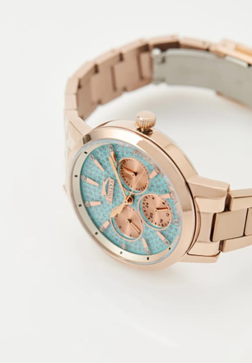 Женские кварцевые часы Slazenger SL.09.2299.3.02 — это элегантный и функциональный аксессуар, сочетающий стиль и надёжность. Корпус и браслет выполнены из суперметалла с IP-покрытиемIP-покрытиеМетод ионного напыления. Демонстрирует повышенную устойчивость к истиранию, окислению и химическим веществам. Под воздействием высокого давления и температуры около 1500°C молекулы металла надёжно соединяются с частицами корпуса часов., защищён минеральным стекломМинеральное стеклоМинеральное стекло представляет собой искусственно выращенный минерал кварца. Такое стекло отличается особой устойчивостью к повреждениям и царапинам. Уступает по некоторым качествам сапфировому стеклу.. Циферблат мятного цвета украшен фианитами, придающими модели изысканное сияние. Часы оснащены вынесенными малыми циферблатами для индикации дня недели, даты и времени в 24-часовом формате. Браслет фиксируется на раскладной застёжкеРаскладная застёжкаТакой тип застёжки используется только на браслетах из металла. Она никогда не раскрывается полностью, происходит разделение на 2 и более частей. Раскладывающая застёжка снизит вероятность потери часов к минимуму., обеспечивая удобство и надёжность ношения. Водонепроницаемость 30 м позволяет использовать часы в повседневных условиях, защищая от случайных брызг и капель дождя. Модель подчёркивает женственность и индивидуальность, идеально подходя как для повседневного, так и для торжественного образа.