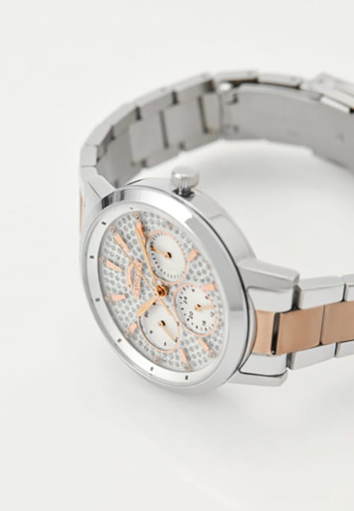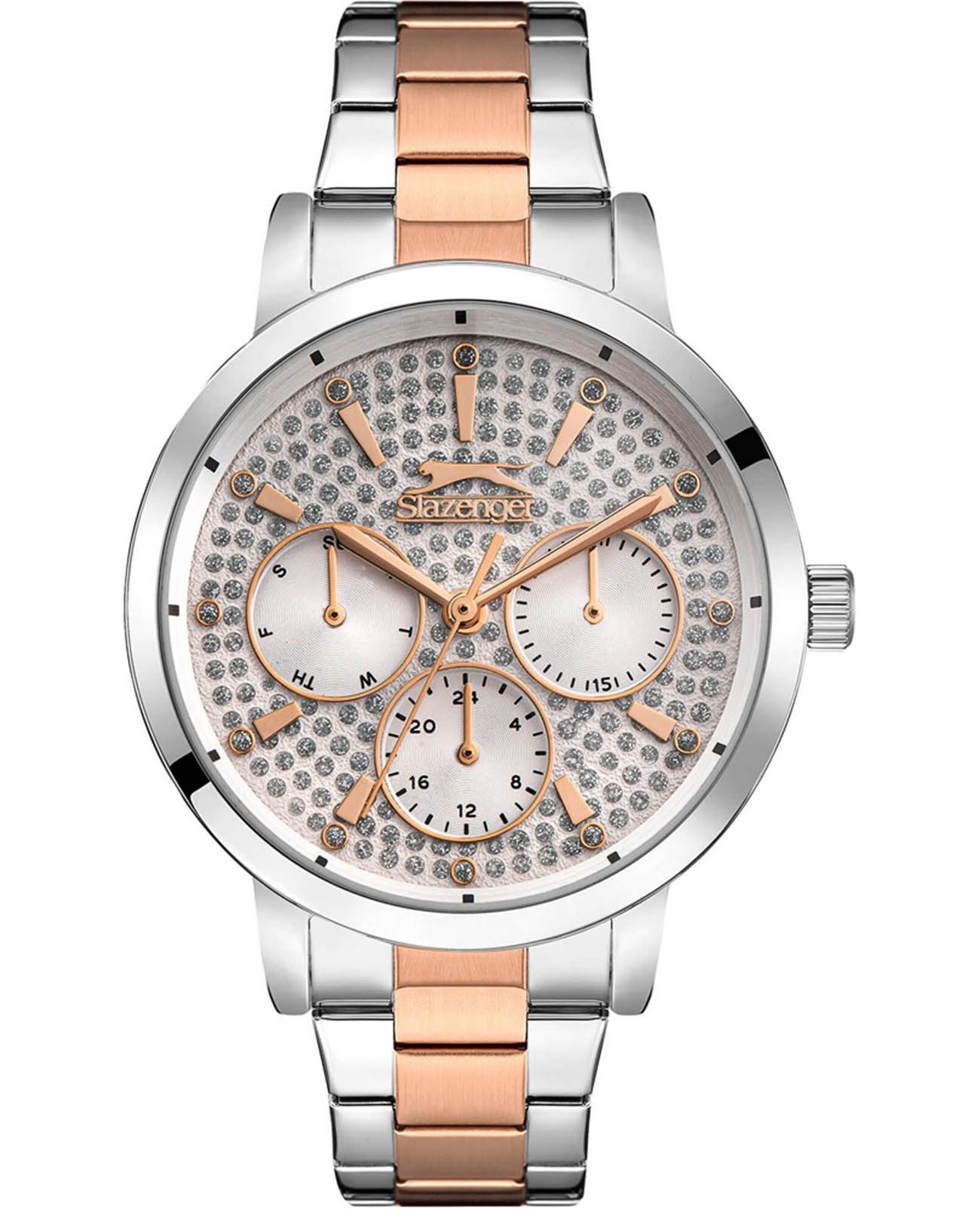 Женские кварцевые часы Slazenger SL.09.2299.3.05 — это элегантный и функциональный аксессуар, сочетающий стиль и надёжность. Корпус и браслет выполнены из суперметалла с IP-покрытиемIP-покрытиеМетод ионного напыления. Демонстрирует повышенную устойчивость к истиранию, окислению и химическим веществам. Под воздействием высокого давления и температуры около 1500°C молекулы металла надёжно соединяются с частицами корпуса часов., защищён минеральным стекломМинеральное стеклоМинеральное стекло представляет собой искусственно выращенный минерал кварца. Такое стекло отличается особой устойчивостью к повреждениям и царапинам. Уступает по некоторым качествам сапфировому стеклу.. Циферблат белого цвета украшен фианитами, придающими модели изысканное сияние. Часы оснащены вынесенными малыми циферблатами для индикации дня недели, даты и времени в 24-часовом формате. Браслет фиксируется на раскладной застёжкеРаскладная застёжкаТакой тип застёжки используется только на браслетах из металла. Она никогда не раскрывается полностью, происходит разделение на 2 и более частей. Раскладывающая застёжка снизит вероятность потери часов к минимуму., обеспечивая удобство и надёжность ношения. Водонепроницаемость 30 м позволяет использовать часы в повседневных условиях, защищая от случайных брызг и капель дождя. Модель подчёркивает женственность и индивидуальность, идеально подходя как для повседневного, так и для торжественного образа.