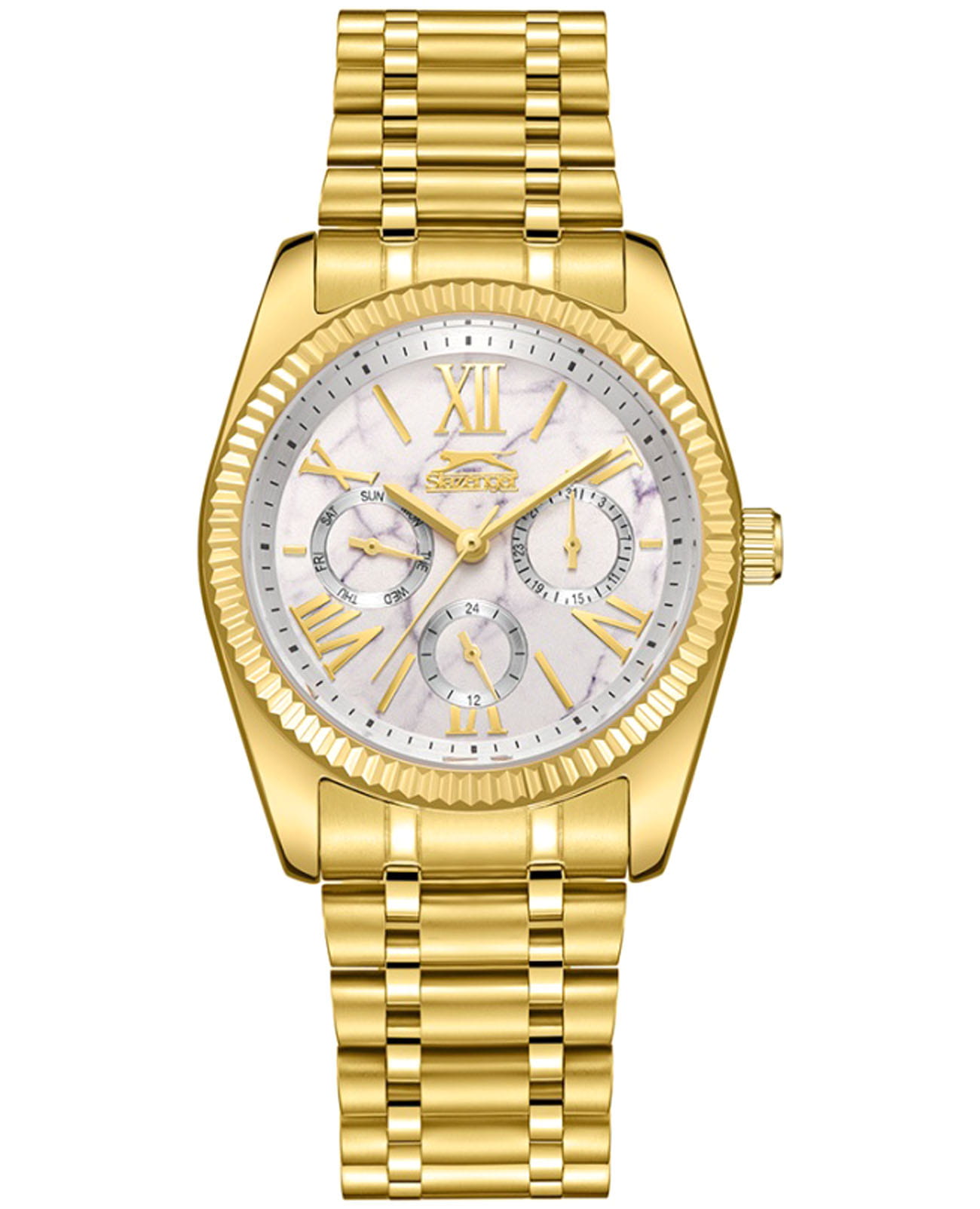 Женские кварцевые часы Slazenger SL.09.2343.4.02 – это сочетание элегантности, современного стиля и надёжности. Изящный корпус из суперметалла с IP-покрытиемIP-покрытиеМетод ионного напыления. Демонстрирует повышенную устойчивость к истиранию, окислению и химическим веществам. Под воздействием высокого давления и температуры около 1500°C молекулы металла надёжно соединяются с частицами корпуса часов. золотистого цвета, диаметром 36 мм и толщиной 10.5 мм, подчёркивает утончённость модели и делает их идеальным аксессуаром для любой ситуации – будь то деловая встреча, романтический вечер или повседневные выходы. Циферблат надёжно защищён минеральным стекломМинеральное стеклоМинеральное стекло представляет собой искусственно выращенный минерал кварца. Такое стекло отличается особой устойчивостью к повреждениям и царапинам. Уступает по некоторым качествам сапфировому стеклу., которое устойчиво к механическим повреждениям и сохраняет кристальную прозрачность. Рифленый неподвижный безельБезельВнешний ободок, закрепляющий стекло. В спортивных часах так называется поворотное кольцо с делениями на циферблате, выполняет роль таймера – замеряет отрезки времени на шкале. Неподвижный безель – элемент декора. Однонаправленно вращающийся безель на дайверских часах позволяет фиксировать моменты погружения и выныривания на поверхность.. Браслет из суперметалла с IP-покрытиемIP-покрытиеМетод ионного напыления. Демонстрирует повышенную устойчивость к истиранию, окислению и химическим веществам. Под воздействием высокого давления и температуры около 1500°C молекулы металла надёжно соединяются с частицами корпуса часов. удобно облегает запястье и фиксируется с помощью раскладной застёжкиРаскладная застёжкаТакой тип застёжки используется только на браслетах из металла. Она никогда не раскрывается полностью, происходит разделение на 2 и более частей. Раскладывающая застёжка снизит вероятность потери часов к минимуму., обеспечивая надёжность и комфорт в повседневном ношении. Утончённый стиль, внимание к деталям и практичность делают эту модель идеальным выбором для современных женщин, ценящих эстетику и функциональность. Вынесенный циферблат с 24-х часовым указателем времени. Водозащита до 30 метров позволит защитить корпус от случайных брызг или капель дождя.