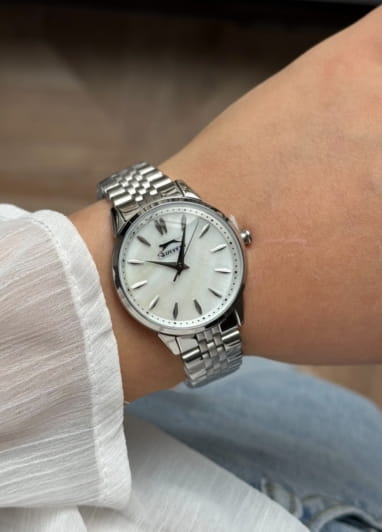 Женские кварцевые часы Slazenger SL.09.2373.3.01 – это сочетание элегантности, современного стиля и надёжности. Изящный корпус из суперметалла серебристого цвета, диаметром 34 мм и толщиной 9 мм, подчёркивает утончённость модели и делает их идеальным аксессуаром для любой ситуации – будь то деловая встреча, романтический вечер или повседневные выходы. Циферблат надёжно защищён минеральным стекломМинеральное стеклоМинеральное стекло представляет собой искусственно выращенный минерал кварца. Такое стекло отличается особой устойчивостью к повреждениям и царапинам. Уступает по некоторым качествам сапфировому стеклу., которое устойчиво к механическим повреждениям и сохраняет кристальную прозрачность. Браслет из суперметалла удобно облегает запястье и фиксируется с помощью раскладной застёжкиРаскладная застёжкаТакой тип застёжки используется только на браслетах из металла. Она никогда не раскрывается полностью, происходит разделение на 2 и более частей. Раскладывающая застёжка снизит вероятность потери часов к минимуму., обеспечивая надёжность и комфорт в повседневном ношении. Утончённый стиль, внимание к деталям и практичность делают эту модель идеальным выбором для современных женщин, ценящих эстетику и функциональность. Водозащита до 30 метров позволит защитить корпус от случайных брызг или капель дождя.