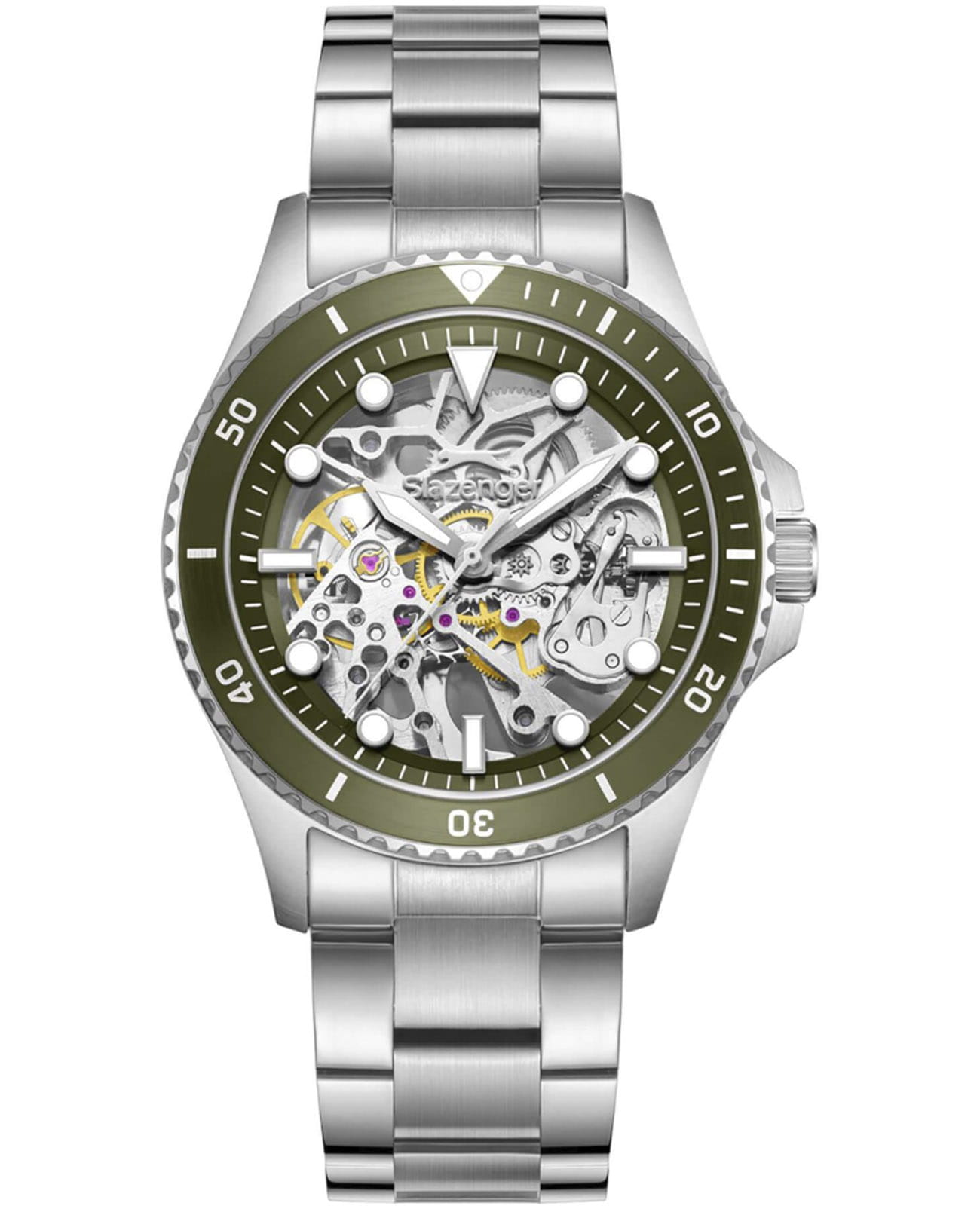 Мужские механические часы с автоподзаводом Slazenger — это выразительный и функциональный аксессуар. Корпус диаметром 42 мм и толщиной 15 мм выполнен из нержавеющей стали 316L. БезельБезельВнешний ободок, закрепляющий стекло. В спортивных часах так называется поворотное кольцо с делениями на циферблате, выполняет роль таймера – замеряет отрезки времени на шкале. Неподвижный безель – элемент декора. Однонаправленно вращающийся безель на дайверских часах позволяет фиксировать моменты погружения и выныривания на поверхность. — однонаправленный вращающийся. Циферблат зелёного цвета частично скелетонизирован, что позволяет наблюдать за работой механизма. Циферблат защищён минеральным стекломМинеральное стеклоМинеральное стекло представляет собой искусственно выращенный минерал кварца. Такое стекло отличается особой устойчивостью к повреждениям и царапинам. Уступает по некоторым качествам сапфировому стеклу.. Механизм — автоматический калибр. Прозрачная задняя крышка открывает вид на декорированный механизм. Стрелки и метки с люминесцентным покрытиемЛюминесцентное покрытиеПозволяет считывать показания времени в темноте. Производители наносят на стрелки, часовые индексы, безель или поверхность циферблата светонакопительный состав, дающий холодное свечение., обеспечивающим хорошую читаемость в темноте. Часы оснащены стальным браслетом с раскладной застёжкойРаскладная застёжкаТакой тип застёжки используется только на браслетах из металла. Она никогда не раскрывается полностью, происходит разделение на 2 и более частей. Раскладывающая застёжка снизит вероятность потери часов к минимуму.. Водонепроницаемость 100 м позволяет использовать часы для плавания и повседневного ношения. Гарантия — 12 месяцев. Идеальный выбор для тех, кто ценит стиль, технологичность и качество.