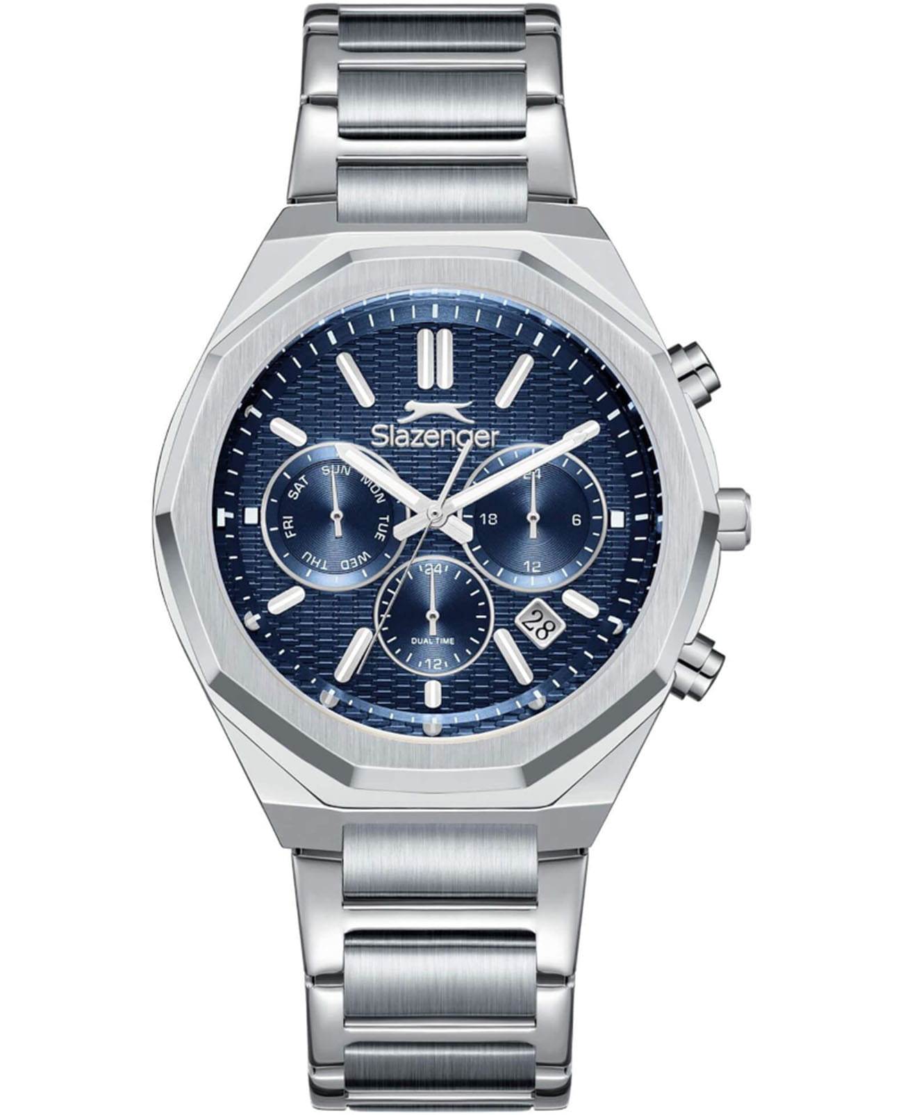 Мужские кварцевые часы Slazenger — это выразительный и функциональный аксессуар. Корпус диаметром 42 мм и толщиной 12,5 мм выполнен из нержавеющей стали 316L. Циферблат синего цвета оформлен индексами и стрелками. Окошко даты расположено между 4 и 5 часами. Указатель дня недели и 24-часовой формат времени вынесены на отдельные субциферблаты. Циферблат защищён минеральным стекломМинеральное стеклоМинеральное стекло представляет собой искусственно выращенный минерал кварца. Такое стекло отличается особой устойчивостью к повреждениям и царапинам. Уступает по некоторым качествам сапфировому стеклу.. Механизм — кварцевый калибр JP25. Часы оснащены функцией второго часового пояса (GMT)Второй часовой поясФункция, позволяющая отображать время двух часовых поясов одновременно.. Стрелки и метки с люминесцентным покрытиемЛюминесцентное покрытиеПозволяет считывать показания времени в темноте. Производители наносят на стрелки, часовые индексы, безель или поверхность циферблата светонакопительный состав, дающий холодное свечение., обеспечивающим хорошую читаемость в темноте. Часы оснащены стальным браслетом с раскладной застёжкойРаскладная застёжкаТакой тип застёжки используется только на браслетах из металла. Она никогда не раскрывается полностью, происходит разделение на 2 и более частей. Раскладывающая застёжка снизит вероятность потери часов к минимуму.. Водонепроницаемость 100 м позволяет использовать часы для плавания и повседневного ношения. Гарантия — 12 месяцев. Идеальный выбор для тех, кто ценит стиль, функциональность и качество.