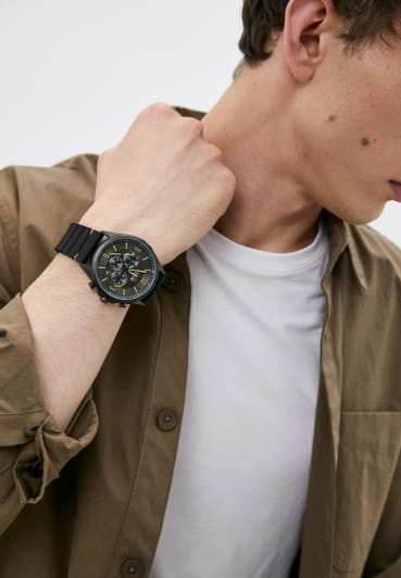 Мужские кварцевые часы Slazenger — это выразительный и функциональный аксессуар. Корпус диаметром 46 мм и толщиной 11 мм выполнен из суперметалла с IP-покрытиемIP-покрытиеМетод ионного напыления. Демонстрирует повышенную устойчивость к истиранию, окислению и химическим веществам. Под воздействием высокого давления и температуры около 1500°C молекулы металла надёжно соединяются с частицами корпуса часов.. Циферблат чёрного цвета оформлен индексами, стрелками и двумя вынесенными субциферблатами: для отображения дня недели и 24-часового формата времени. Окошко даты расположено между 4 и 5 часами. Присутствует указатель второго часового пояса (GMTВторой часовой поясФункция, позволяющая отображать время двух часовых поясов одновременно.). Циферблат защищён минеральным стекломМинеральное стеклоМинеральное стекло представляет собой искусственно выращенный минерал кварца. Такое стекло отличается особой устойчивостью к повреждениям и царапинам. Уступает по некоторым качествам сапфировому стеклу.. Часы оснащены силиконовым ремешком на классической пряжке. Водонепроницаемость 50 м позволяет использовать часы в повседневных условиях. Идеальный выбор для тех, кто ценит стиль и качество.