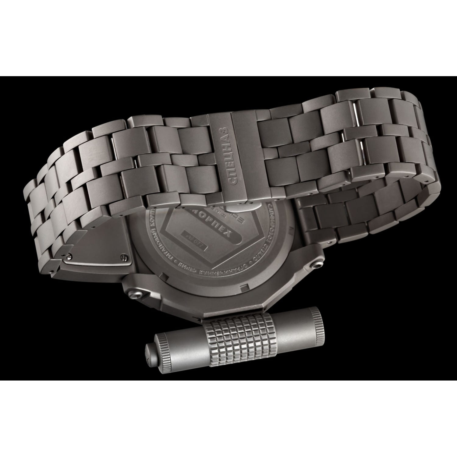 Водозащита 100 метров (10 ATM) позволяет использовать часы для плавания и других водных видов спорта. Титановый браслет с застёжкой бабочкаЗастёжка "бабочка"Такой вид застёжки дополняется предохранителями, помогающими избежать случайного раскрытия браслета. Обладают изящным исполнением. и системой блокировки обеспечивает комфортное ношение и надёжную фиксацию на запястье.