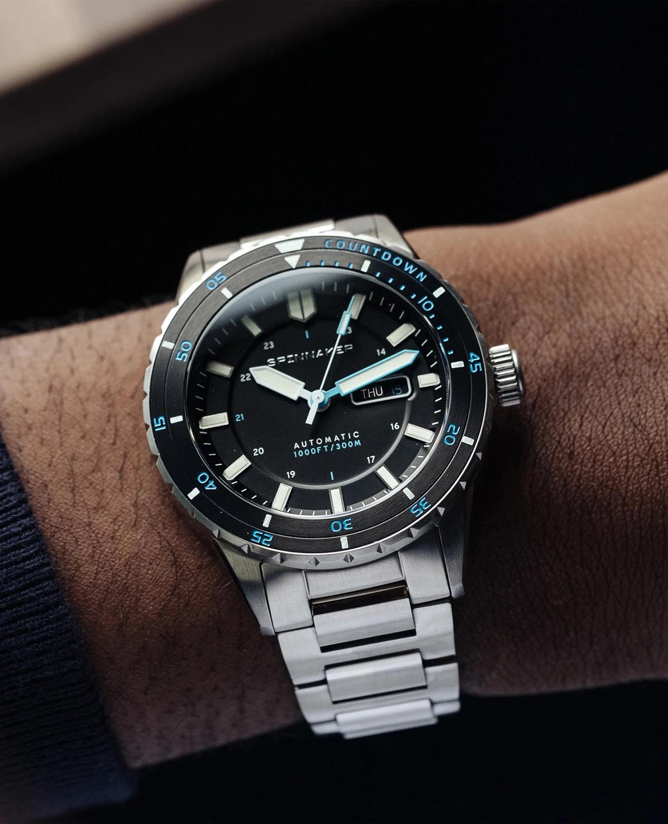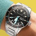 Мужские итальянские часы Spinnaker Hass SP-5099-22 с надёжным автоматическим механизмом. Сапфировое стеклоСапфировое стеклоПрочный и надёжный материал из кристалла сапфира синтетического происхождения, характеризующийся особой твёрдостью и устойчивостью к царапинам и повреждениям. с антибликовым покрытиемАнтибликовое покрытиеСлой оксида металла в 0,13-0,3 микрон, благодаря которому стекло часов не бликует и не отражает свет. Антибликовое покрытие уменьшает отражение света в 10 раз, обеспечивая отличную читаемость показателей циферблата., устойчивое к появлению царапин и обладающее высокой прозрачностью. Класс водозащиты: 300 метров, позволит плавать, нырять и заниматься другими водными видами спорта. Корпус часов изготовлен из нержавеющей стали с поворотным безелемБезельВнешний ободок, закрепляющий стекло. В спортивных часах так называется поворотное кольцо с делениями на циферблате, выполняет роль таймера – замеряет отрезки времени на шкале. Неподвижный безель – элемент декора. Однонаправленно вращающийся безель на дайверских часах позволяет фиксировать моменты погружения и выныривания на поверхность. с IP-покрытиемIP-покрытиеМетод ионного напыления. Демонстрирует повышенную устойчивость к истиранию, окислению и химическим веществам. Под воздействием высокого давления и температуры около 1500°C молекулы металла надёжно соединяются с частицами корпуса часов.. Браслет выполнен из нержавеющей стали на раскладной застёжкеРаскладная застёжкаТакой тип застёжки используется только на браслетах из металла. Она никогда не раскрывается полностью, происходит разделение на 2 и более частей. Раскладывающая застёжка снизит вероятность потери часов к минимуму.. Стрелки и метки с люминесцентным покрытиемЛюминесцентное покрытиеПозволяет считывать показания времени в темноте. Производители наносят на стрелки, часовые индексы, безель или поверхность циферблата светонакопительный состав, дающий холодное свечение.. Окошко дня недели и даты находится в положении 3 часа.