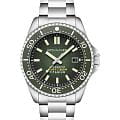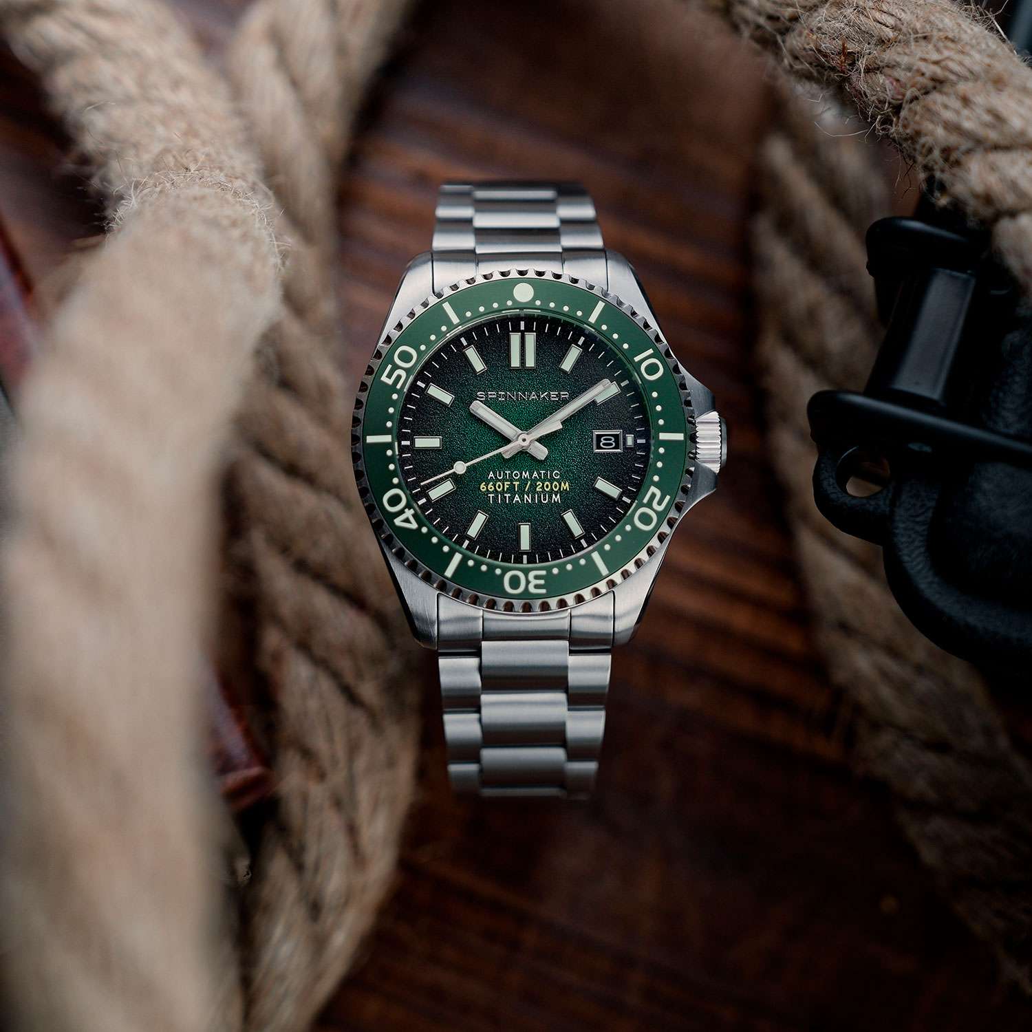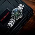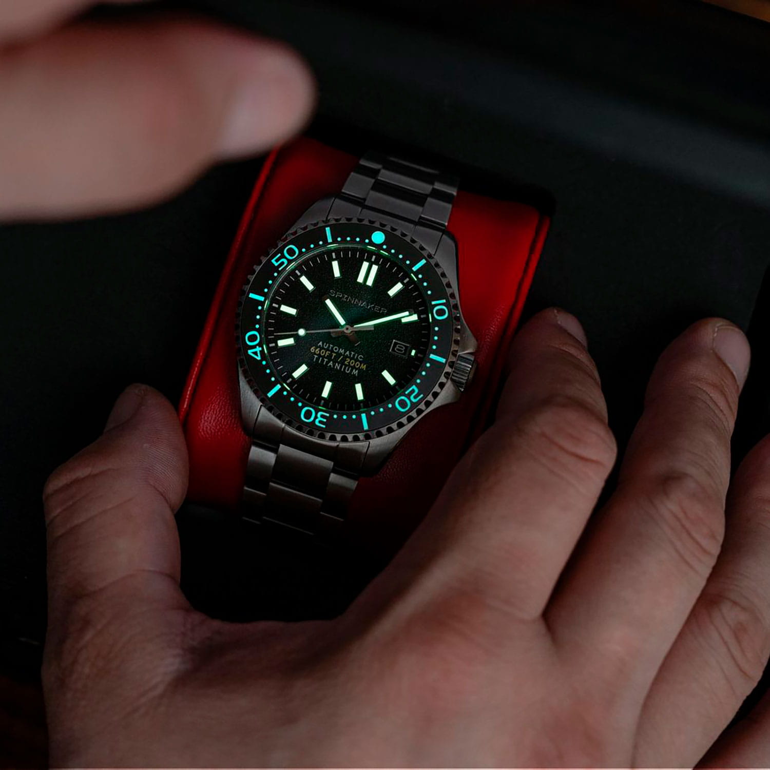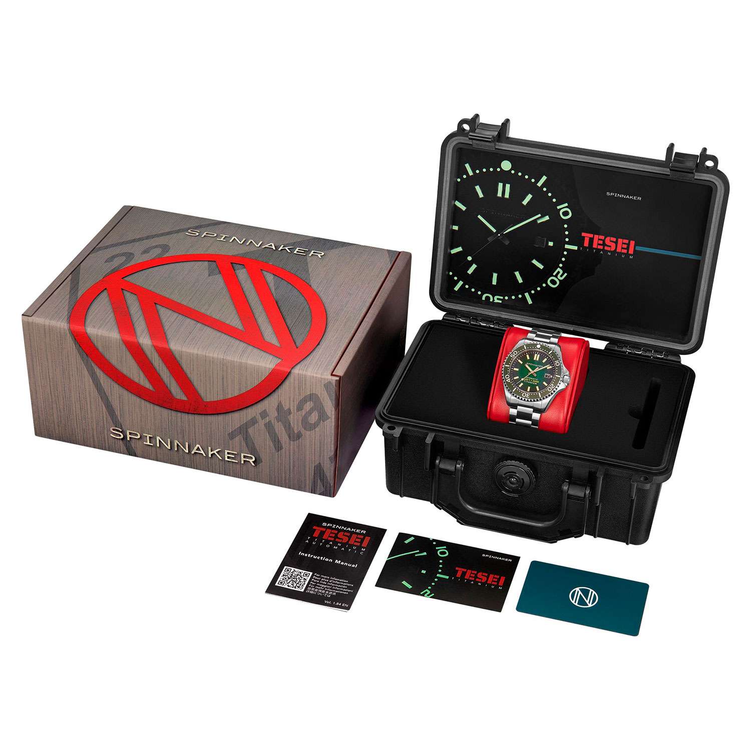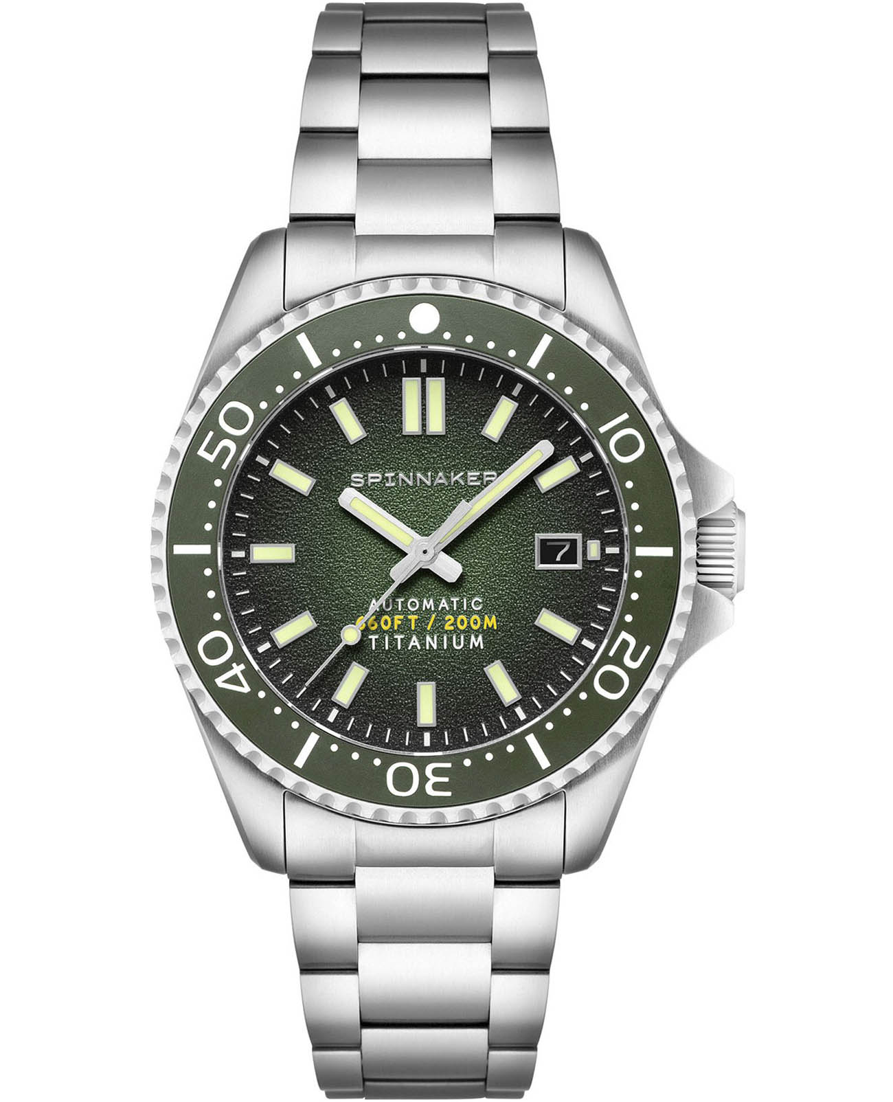 Мужские автоматические часы Spinnaker TESEI SP-5084-77 представляют собой стильный инструментальный аксессуар с круглым корпусом диаметром 43 мм из легкого и прочного титана, вдохновленный наследием морских исследований. Модель оснащена японским автоматическим механизмом TMI NH35 с автоподзаводом, обеспечивающим индикацию даты и запас хода до 42 часов. Зеленый циферблат с текстурой "фьюме" и люминесцентными маркерами Super-LumiNova®Люминесцентное покрытиеПозволяет считывать показания времени в темноте. Производители наносят на стрелки, часовые индексы, безель или поверхность циферблата светонакопительный состав, дающий холодное свечение. обеспечивает отличную читаемость в любых условиях освещения. Защиту циферблата обеспечивает устойчивое к царапинам сапфировое стеклоСапфировое стеклоПрочный и надёжный материал из кристалла сапфира синтетического происхождения, характеризующийся особой твёрдостью и устойчивостью к царапинам и повреждениям. с антибликовым покрытием, а водонепроницаемость 20 ATM (200 метров) делает часы подходящими для дайвинга. Титановый браслет шириной 22 мм с раскладной застежкойРаскладная застёжкаТакой тип застёжки используется только на браслетах из металла. Она никогда не раскрывается полностью, происходит разделение на 2 и более частей. Раскладывающая застёжка снизит вероятность потери часов к минимуму. и системой безопасности обеспечивает удобную посадку на запястье.