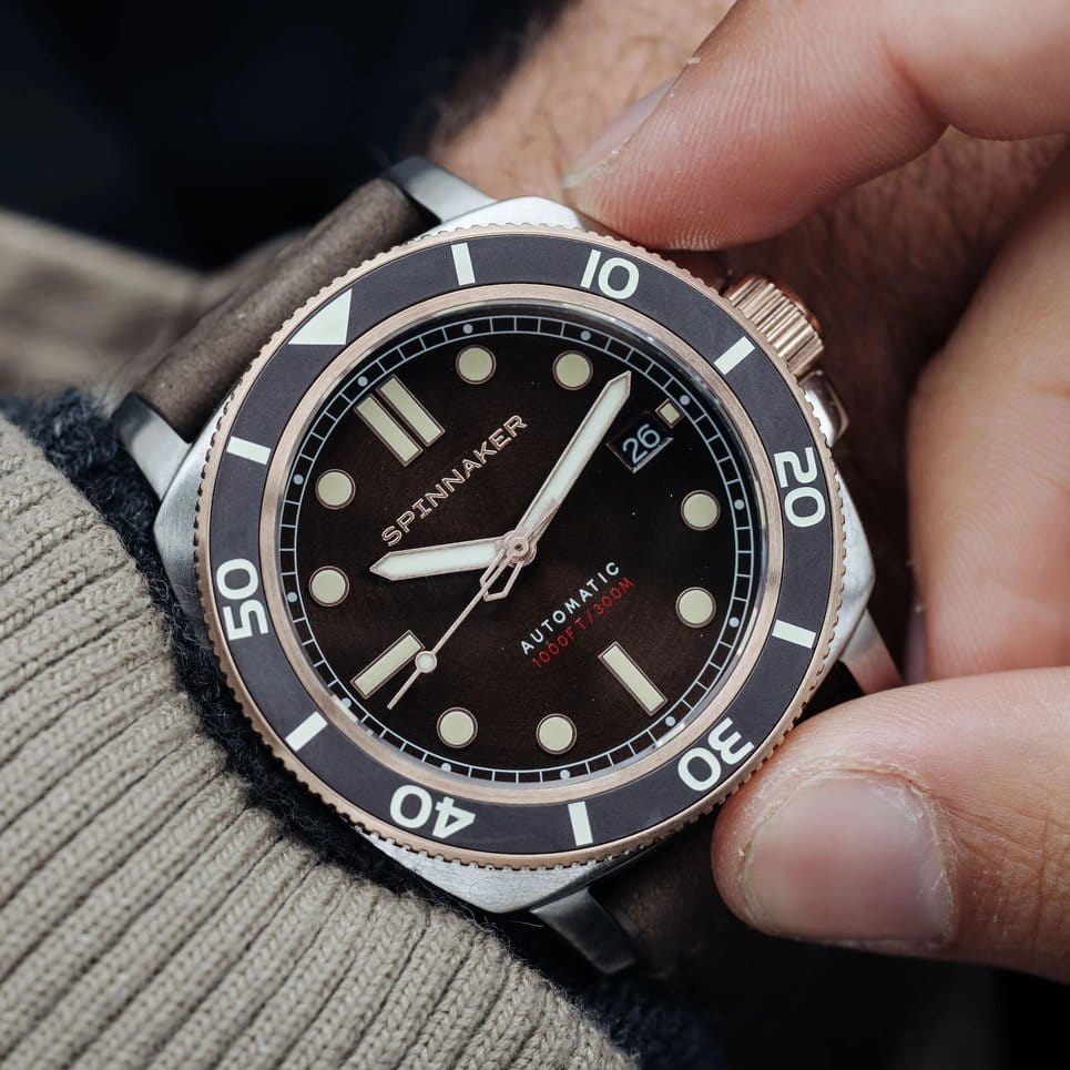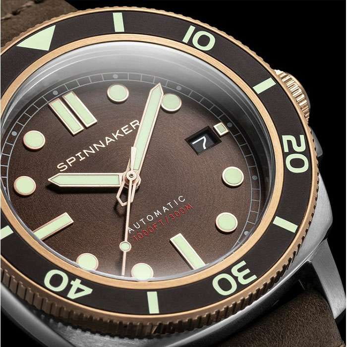 Мужские механические часы с автоподзаводом Spinnaker — это стильный и надёжный аксессуар. Корпус диаметром 42 мм и толщиной 14 мм выполнен из нержавеющей стали 316L. Циферблат коричневого цвета оформлен индексами и стрелками. Стрелки и метки с люминесцентным покрытиемЛюминесцентное покрытиеПозволяет считывать показания времени в темноте. Производители наносят на стрелки, часовые индексы, безель или поверхность циферблата светонакопительный состав, дающий холодное свечение., обеспечивающим хорошую читаемость в темноте. Окошко даты расположено в положении 3 часов. Циферблат защищён сапфировым стекломСапфировое стеклоПрочный и надёжный материал из кристалла сапфира синтетического происхождения, характеризующийся особой твёрдостью и устойчивостью к царапинам и повреждениям.. Механизм — автоматический калибр NH35 (24 камня, частота 21 600 полуколебаний в час) с запасом хода до 40 часов. Однонаправленный безельБезельВнешний ободок, закрепляющий стекло. В спортивных часах так называется поворотное кольцо с делениями на циферблате, выполняет роль таймера – замеряет отрезки времени на шкале. Неподвижный безель – элемент декора. Однонаправленно вращающийся безель на дайверских часах позволяет фиксировать моменты погружения и выныривания на поверхность. с PVD-покрытиемPVDУльтратонкое покрытие наносится в технике вакуумного напыления, сочетает в себе нитрид титана особой прочности со слоем золота или оксида хрома. Несёт в себе декоративную или защитную функцию. обеспечивает точный контроль времени погружения. Часы оснащены коричневым кожаным ремешком шириной 22 мм на классической пряжке. Водонепроницаемость 300 м позволяет использовать часы для плавания и дайвинга. Идеальный выбор для тех, кто ценит качество и универсальный дизайн.