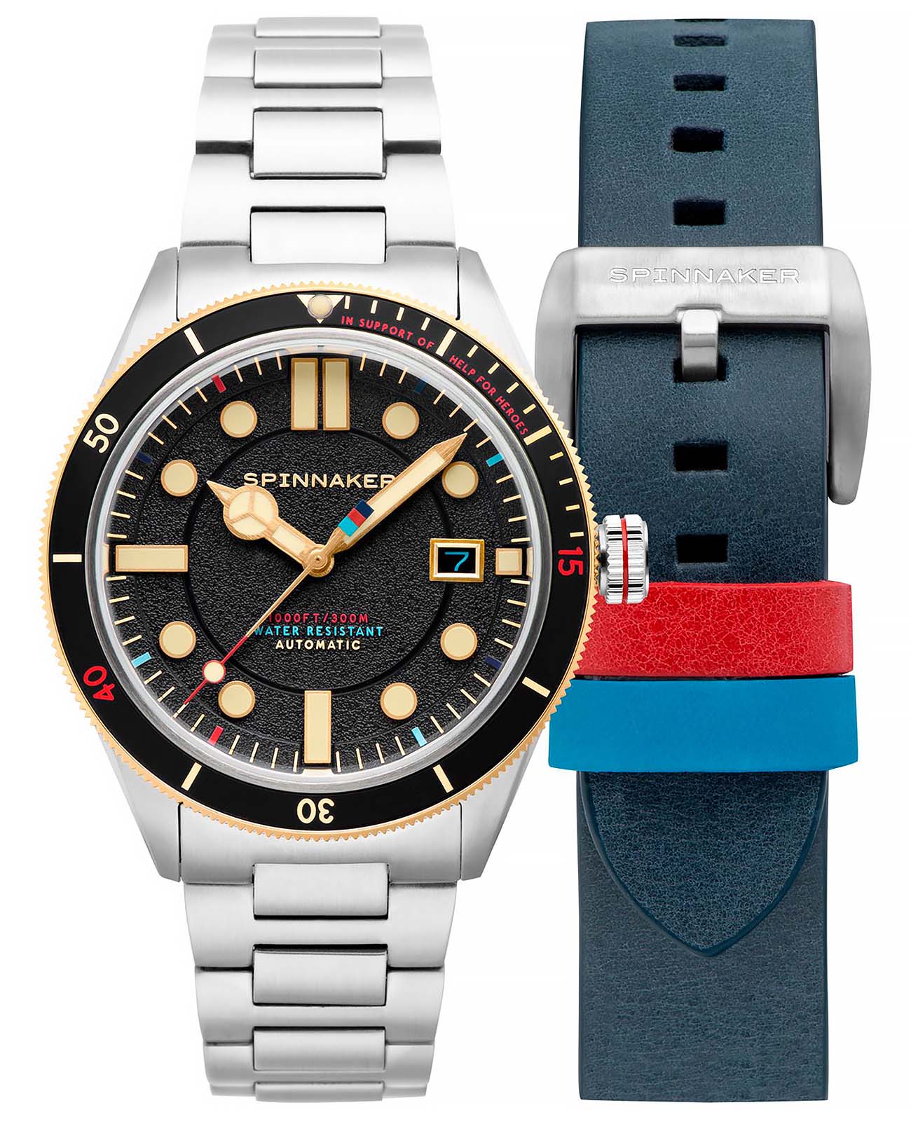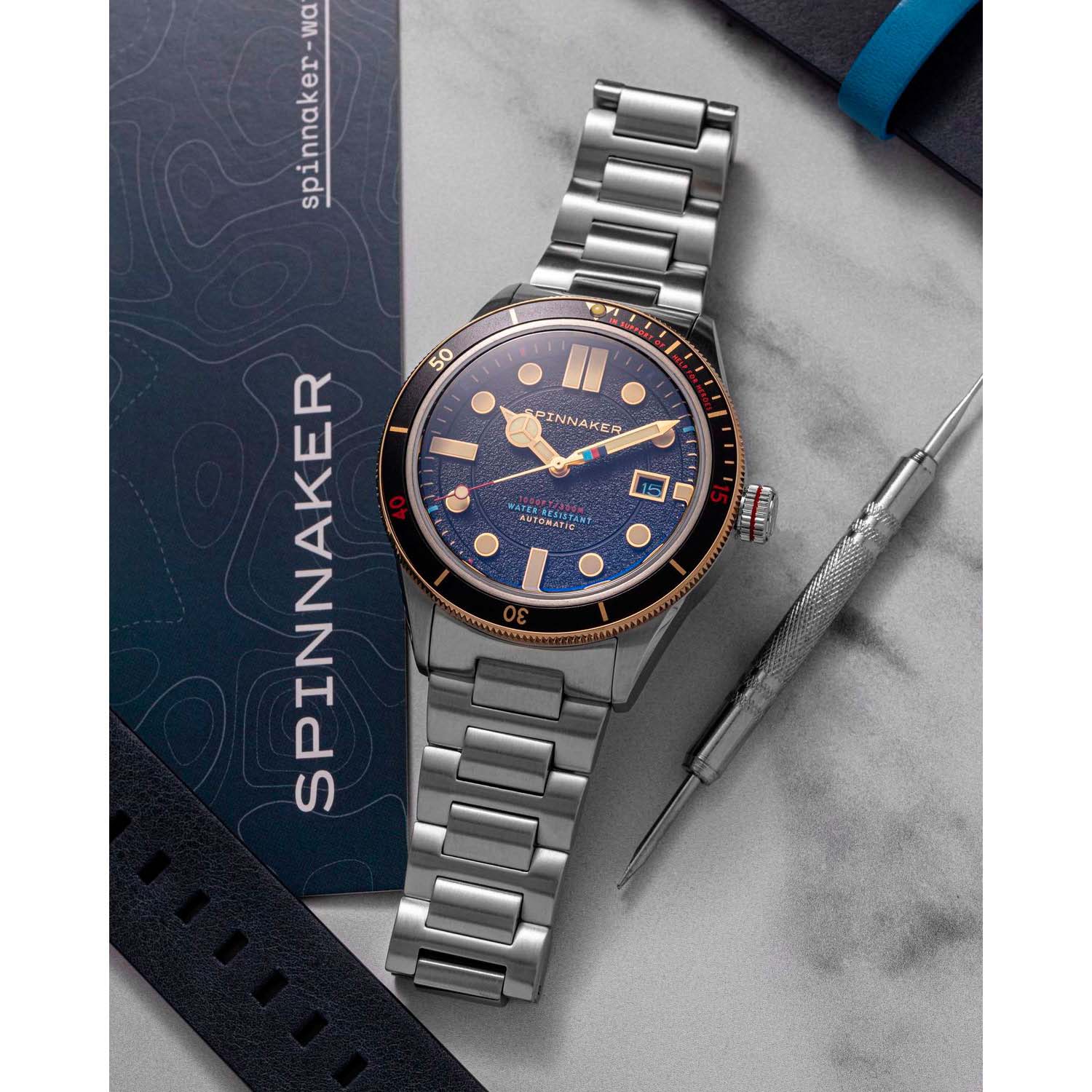Мужские итальянские часы с автоподзаводом Spinnaker Cahill SP-5096-33, механический механизм (автоматический калибр) с высокой точностью. Циферблат с люминесцентным покрытиемЛюминесцентное покрытиеПозволяет считывать показания времени в темноте. Производители наносят на стрелки, часовые индексы, безель или поверхность циферблата светонакопительный состав, дающий холодное свечение. стрелок и меток дополнен сапфировым стекломСапфировое стеклоПрочный и надёжный материал из кристалла сапфира синтетического происхождения, характеризующийся особой твёрдостью и устойчивостью к царапинам и повреждениям., устойчивым к появлению царапин и обладающее высокой прозрачностью. Класс водозащиты: 300 метров, позволит плавать, нырять и заниматься другими водными видами спорта. Корпус часов изготовлен из стали. Стальной браслет на раскладной застёжкеРаскладная застёжкаТакой тип застёжки используется только на браслетах из металла. Она никогда не раскрывается полностью, происходит разделение на 2 и более частей. Раскладывающая застёжка снизит вероятность потери часов к минимуму.. БезельБезельВнешний ободок, закрепляющий стекло. В спортивных часах так называется поворотное кольцо с делениями на циферблате, выполняет роль таймера – замеряет отрезки времени на шкале. Неподвижный безель – элемент декора. Однонаправленно вращающийся безель на дайверских часах позволяет фиксировать моменты погружения и выныривания на поверхность. с PVD-покрытиемPVDУльтратонкое покрытие наносится в технике вакуумного напыления, сочетает в себе нитрид титана особой прочности со слоем золота или оксида хрома. Несёт в себе декоративную или защитную функцию.. Окошко даты находятся в положении 3 часа. Сменный ремешок в комплекте.