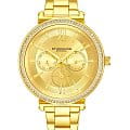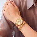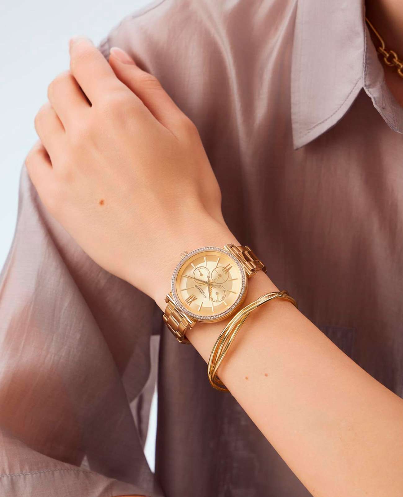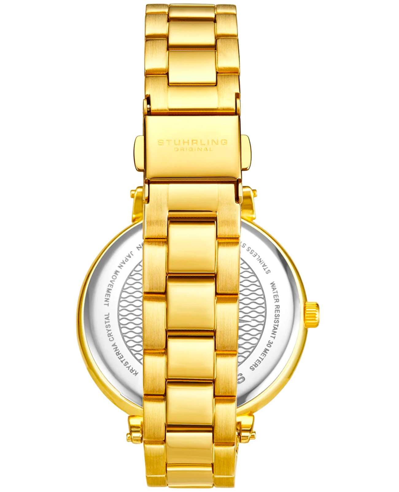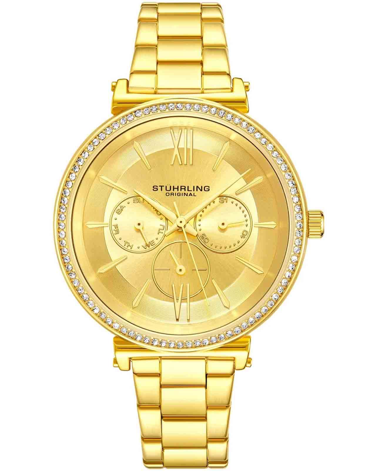 Женские наручные часы Stuhrling 3908.4 сочетают в себе элегантный дизайн и функциональность. Модель обладает круглым корпусом диаметром 40,0 мм, изготовленным из стали с желтым PVD-покрытиемPVDУльтратонкое покрытие наносится в технике вакуумного напыления, сочетает в себе нитрид титана особой прочности со слоем золота или оксида хрома. Несёт в себе декоративную или защитную функцию., что обеспечивает прочность и устойчивость к внешним воздействиям . Толщина корпуса составляет 8,5 мм, что делает часы достаточно компактными для повседневного использования . Браслет из того же материала на раскладной застёжкеРаскладная застёжкаТакой тип застёжки используется только на браслетах из металла. Она никогда не раскрывается полностью, происходит разделение на 2 и более частей. Раскладывающая застёжка снизит вероятность потери часов к минимуму.. Золотистый циферблат украшен римскими цифрами и накладными метками, подчеркивающими классический стиль модели . Для защиты используется стекло KrysternaKrysternaKrysterna — инновационное стекло для наручных часов. Благодаря уникальной структуре, Krysterna объединяет ключевые преимущества двух материалов: твердость сапфира, защищающую от царапин, и гибкость минерального стекла, обеспечивающую устойчивость к деформациям. Такая комбинация делает его идеальным решением для часов, подверженных экстремальным нагрузкам, сохраняя при этом оптическую прозрачность., обеспечивающее надежную защиту от царапин . Часы работают на кварцевом механизме, что гарантирует точное время без необходимости подзаводки . Водонепроницаемость часов составляет 30WR (3 атмосферы), что позволяет использовать их в повседневной жизни, включая контакт с водой, например, при мытье рук, но не рекомендуется для плавания или дайвинга . Модель станет идеальным аксессуаром для любой модницы, предпочитающей стильные и качественные аксессуары .
