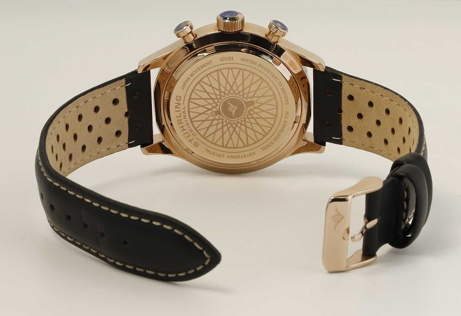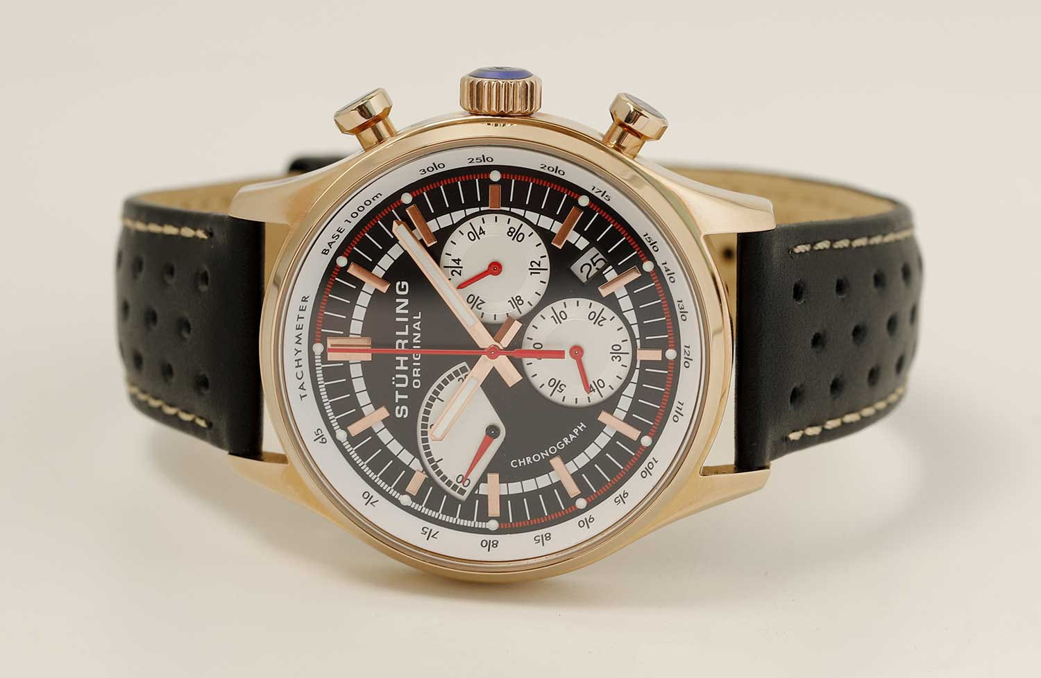 Stuhrling 934.03 — эффектные мужские часы в спортивно-классическом стиле, сочетающие энергичный характер и элегантное исполнение. Корпус с изысканным PVD-покрытиемPVDУльтратонкое покрытие наносится в технике вакуумного напыления, сочетает в себе нитрид титана особой прочности со слоем золота или оксида хрома. Несёт в себе декоративную или защитную функцию. цвета розового золота придаёт модели выразительность и статусный вид. Контрастный чёрный циферблат с белыми счётчиками хронографаХронографФункция позволяет измерять отрезки времени с особой точностью: часы, минуты, секунды. Верным признаком хронографа является наличие на циферблате 3 дополнительных окошек-счётчиков. и акцентами красного цвета создаёт динамичную композицию, а разметка тахиметра добавляет функциональности. Прочное стекло KrysternaKrysternaKrysterna — инновационное стекло для наручных часов. Благодаря уникальной структуре, Krysterna объединяет ключевые преимущества двух материалов: твердость сапфира, защищающую от царапин, и гибкость минерального стекла, обеспечивающую устойчивость к деформациям. Такая комбинация делает его идеальным решением для часов, подверженных экстремальным нагрузкам, сохраняя при этом оптическую прозрачность. защищает поверхность от царапин, сохраняя прозрачность и блеск. Перфорированный кожаный ремень со стандартной застежкой обеспечивает комфорт и спортивный характер образа. Stuhrling — выбор уверенного мужчины, для которого стиль, точность и мощная эстетика идут рука об руку.