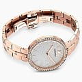 Swarovski 5517803 из коллекции Cosmopolitan — элегантные женские часы, сочетающие современный дизайн и высокое качество. Корпус диаметром 32 мм выполнен из нержавеющей стали с розовым PVD-покрытиемPVDУльтратонкое покрытие наносится в технике вакуумного напыления, сочетает в себе нитрид титана особой прочности со слоем золота или оксида хрома. Несёт в себе декоративную или защитную функцию., что придаёт часам долговечность и утончённый внешний вид. БезельБезельВнешний ободок, закрепляющий стекло. В спортивных часах так называется поворотное кольцо с делениями на циферблате, выполняет роль таймера – замеряет отрезки времени на шкале. Неподвижный безель – элемент декора. Однонаправленно вращающийся безель на дайверских часах позволяет фиксировать моменты погружения и выныривания на поверхность. украшен кристаллами Swarovski, создающими изысканный блеск. Минеральное стеклоМинеральное стеклоМинеральное стекло представляет собой искусственно выращенный минерал кварца. Такое стекло отличается особой устойчивостью к повреждениям и царапинам. Уступает по некоторым качествам сапфировому стеклу. защищает циферблат от царапин и повреждений. Циферблат серебристого цвета с изящными розово-золотистыми метками и стрелками подчёркивает элегантность дизайна. Логотип Swarovski в виде лебедя расположен на отметке «12 часов». Часы оснащены швейцарским кварцевым механизмом, обеспечивающим точный и надёжный ход. Водозащита до 5 ATM (50 метров) позволяет использовать часы в повседневной жизни, включая лёгкие контакты с водой. Браслет из нержавеющей стали с розовым PVD-покрытиемPVDУльтратонкое покрытие наносится в технике вакуумного напыления, сочетает в себе нитрид титана особой прочности со слоем золота или оксида хрома. Несёт в себе декоративную или защитную функцию. гарантирует комфортное ношение. Застёжка-бабочка с кнопкамиЗастёжка "бабочка"Такой вид застёжки дополняется предохранителями, помогающими избежать случайного раскрытия браслета. Обладают изящным исполнением. обеспечивает надёжную фиксацию на запястье. Swarovski 5517803 — это идеальный выбор для женщин, которые ценят стиль, утончённость и функциональность.